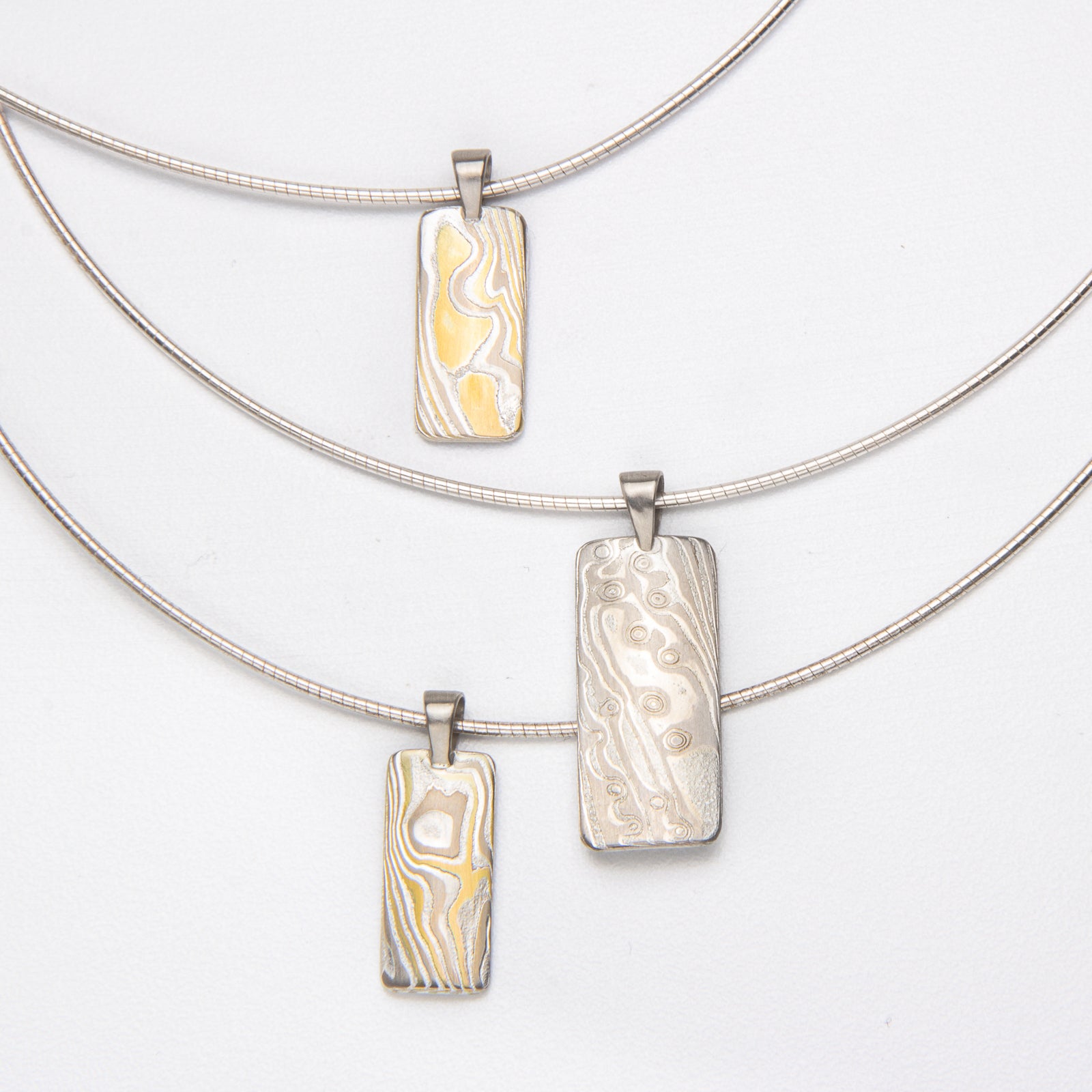 Suspended from a sturdy cable chain, this refined pendant showcases an exquisite etched mokume design that captures the organic beauty of wood grain.