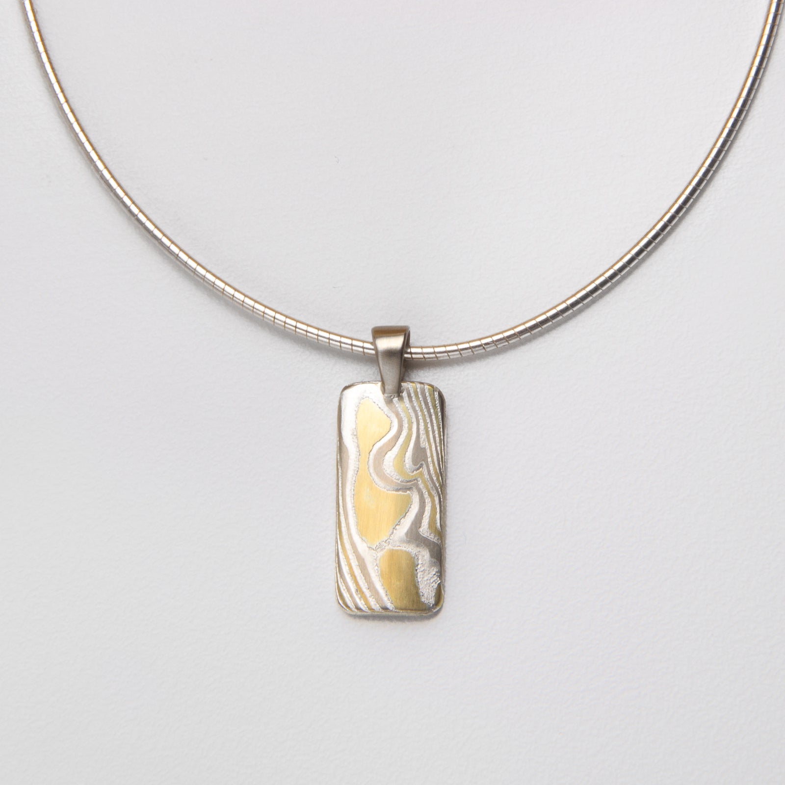 Suspended from a sturdy cable chain, this refined pendant showcases an exquisite etched mokume design that captures the organic beauty of wood grain.