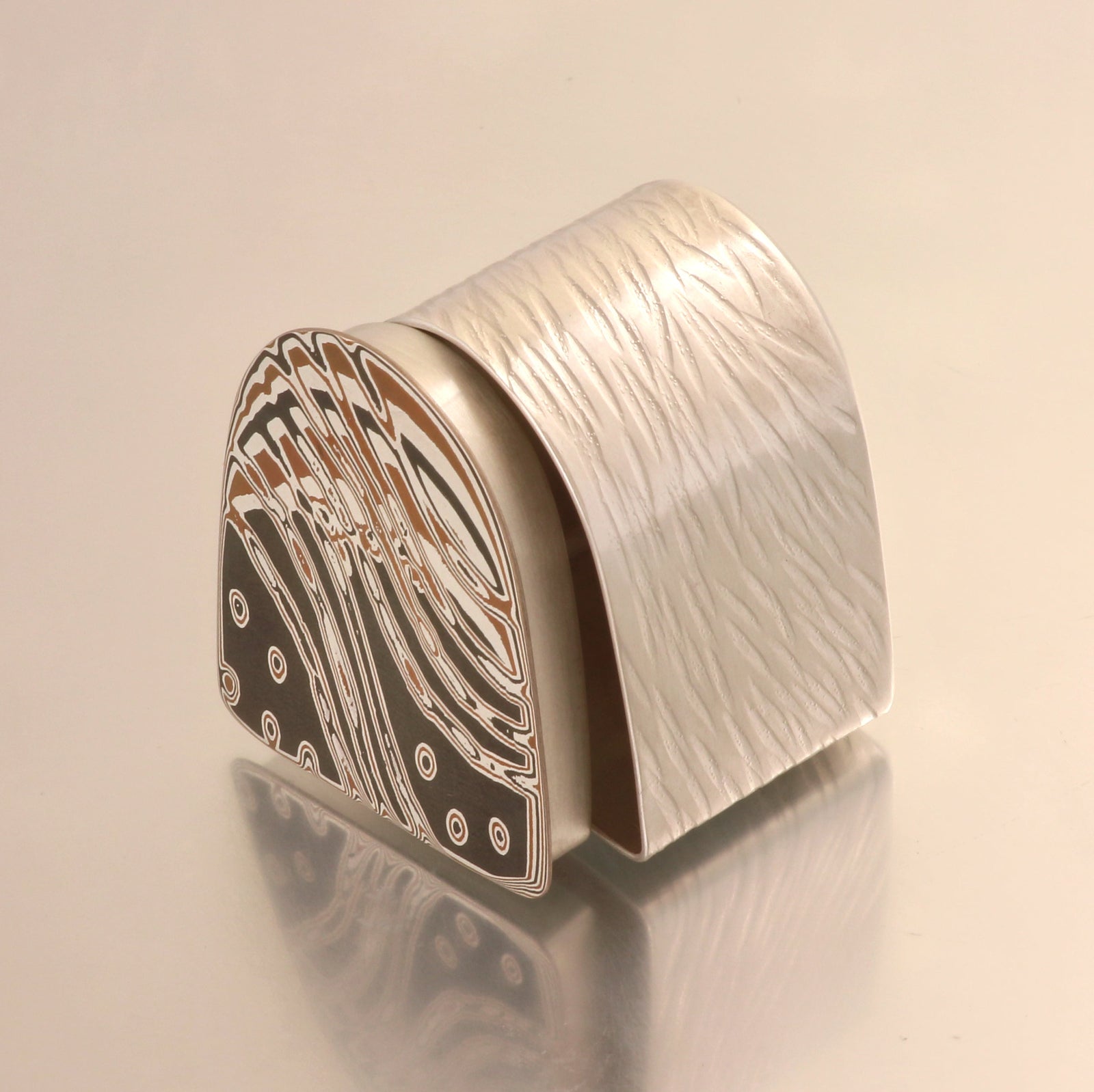 • Materials: Kuroshibuichi, copper and sterling silver mokume, sterling silver box body