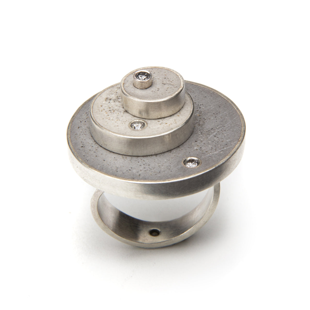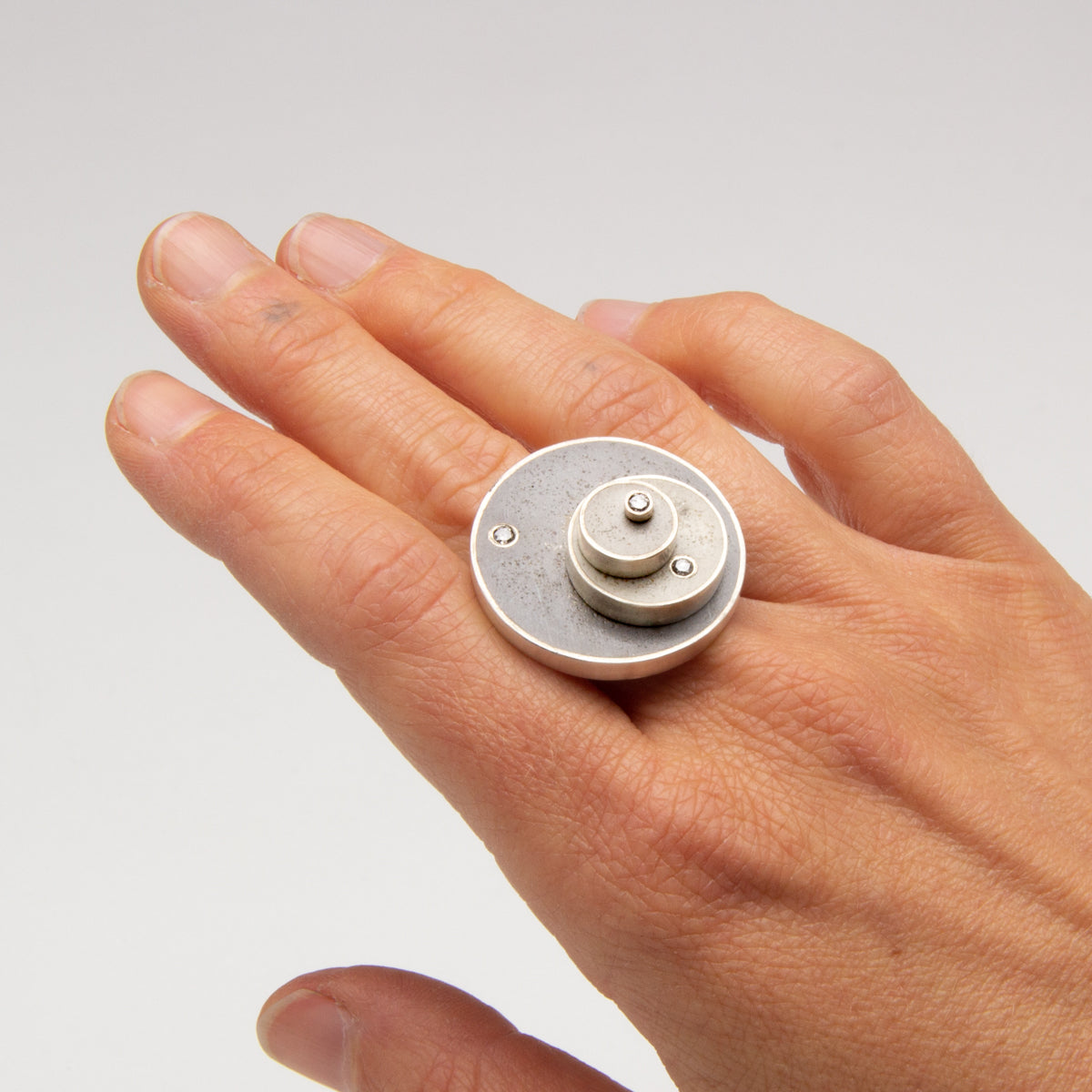 A traditional ring with twists and turns! I wanted to stay true to my aesthetics but incorporate design elements that I normally do not use - hence the moving circles and rivet. This was such a fun piece to create in terms of dimension and surprise elements (turn it over to find a mini diamond just for the wearer).