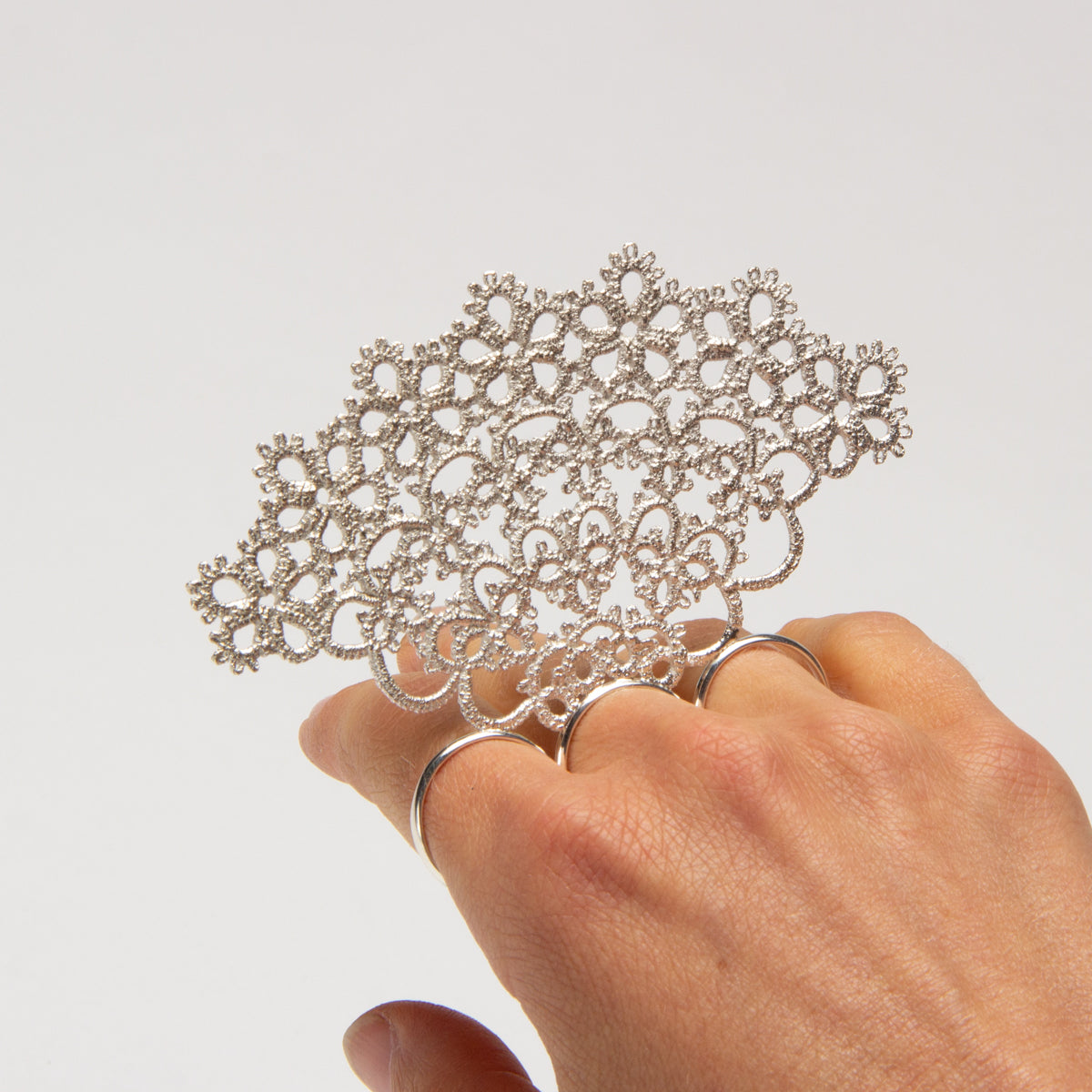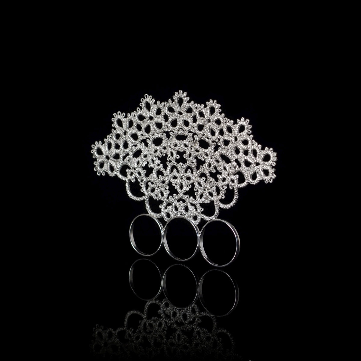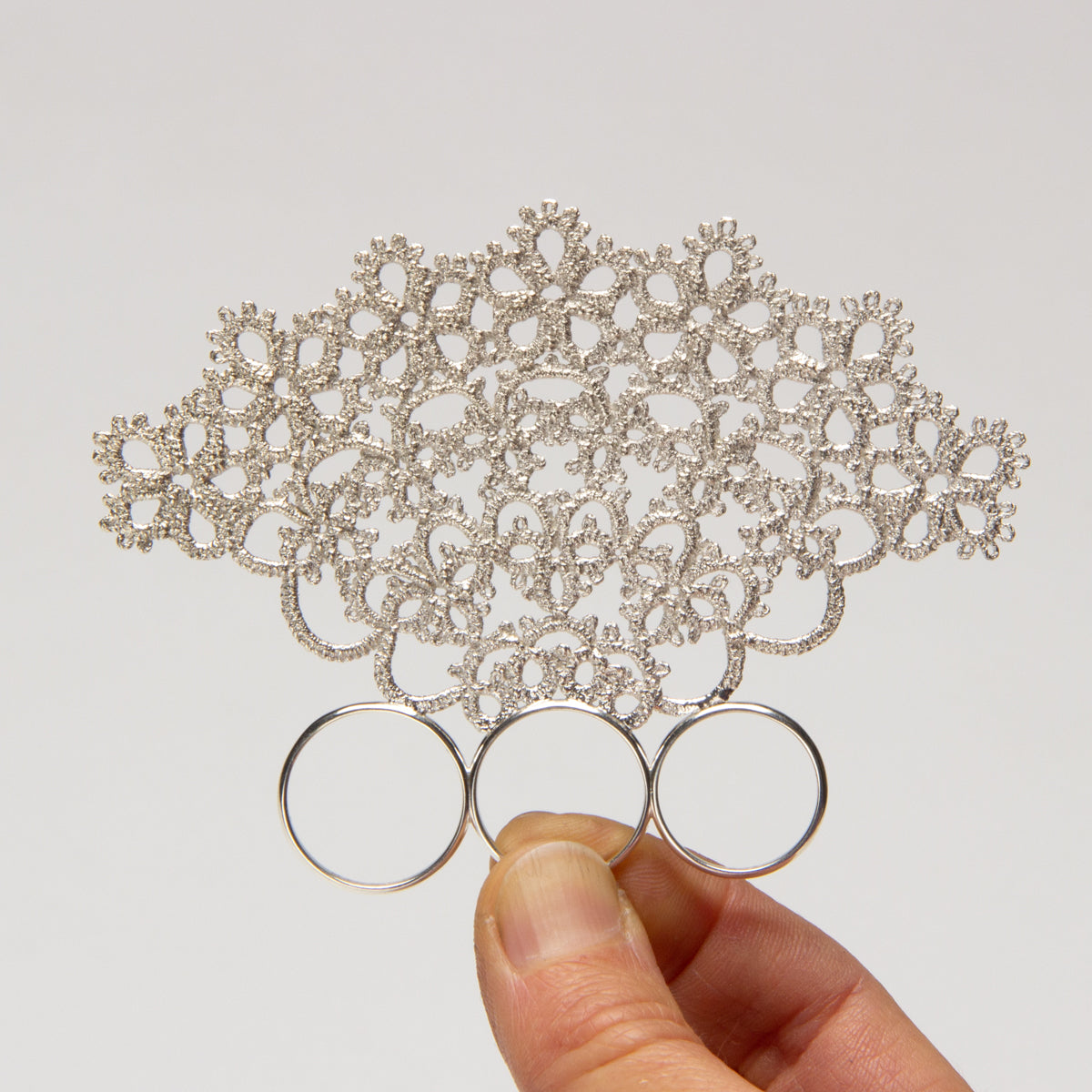For when those unwanted suitors just won’t get the hint! Hand-tatted from cotton thread and then cast into solid sterling silver, this ring marries the concept of a lace fan with that of a set of knuckle dusters. The transformation of lace into metal is fascinating to me—how something so soft, delicate, and lightweight can turn into something deceptively hard, durable, and heavy. Recontextualizing it as a potential weapon takes this one step further, forcing the average viewer to see it not as something frivolous and easily overlooked, but as something demanding of attention and maybe even dangerous.