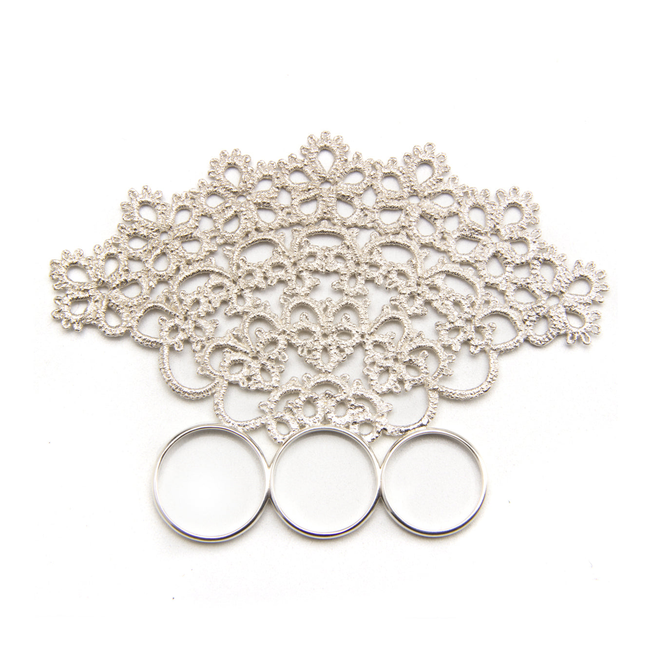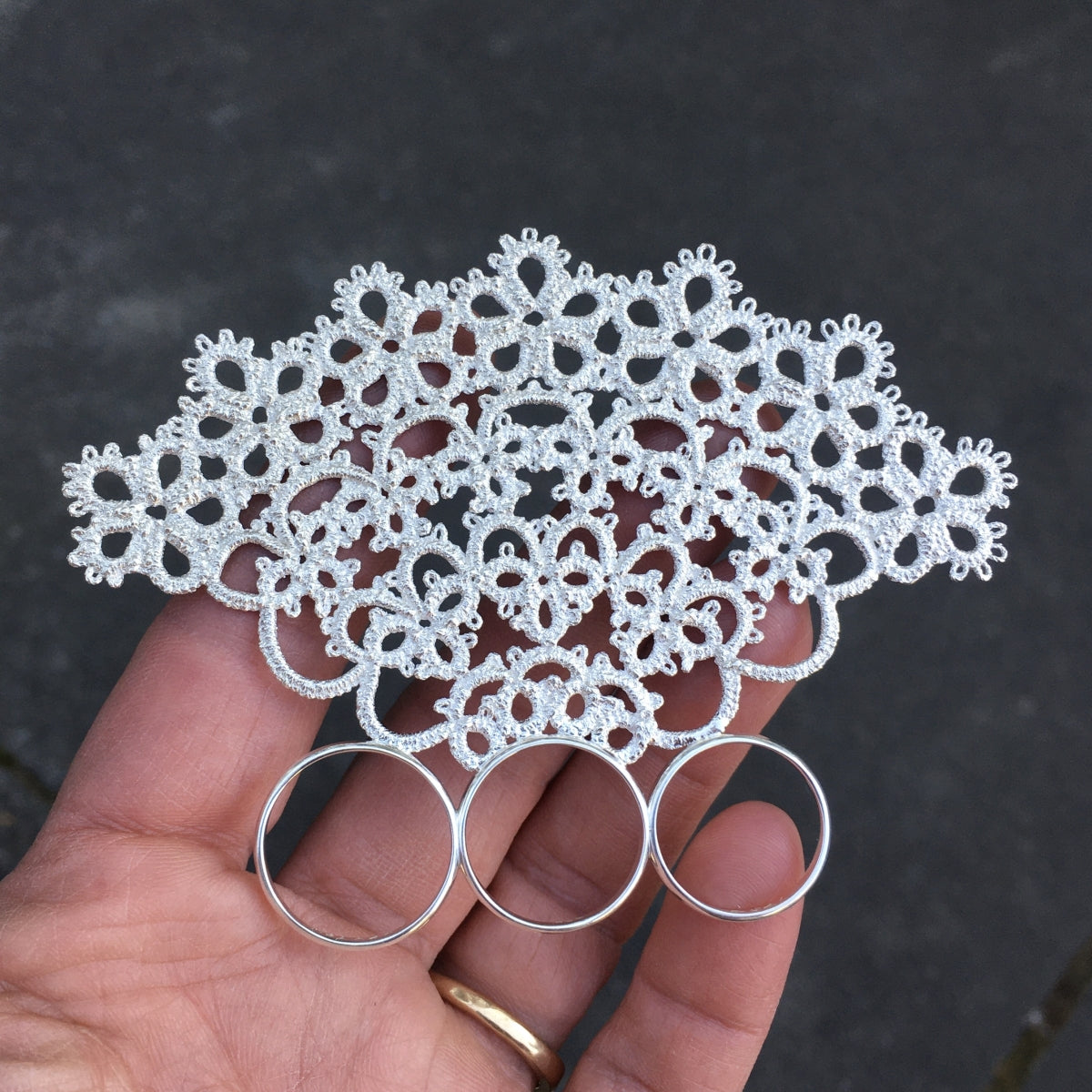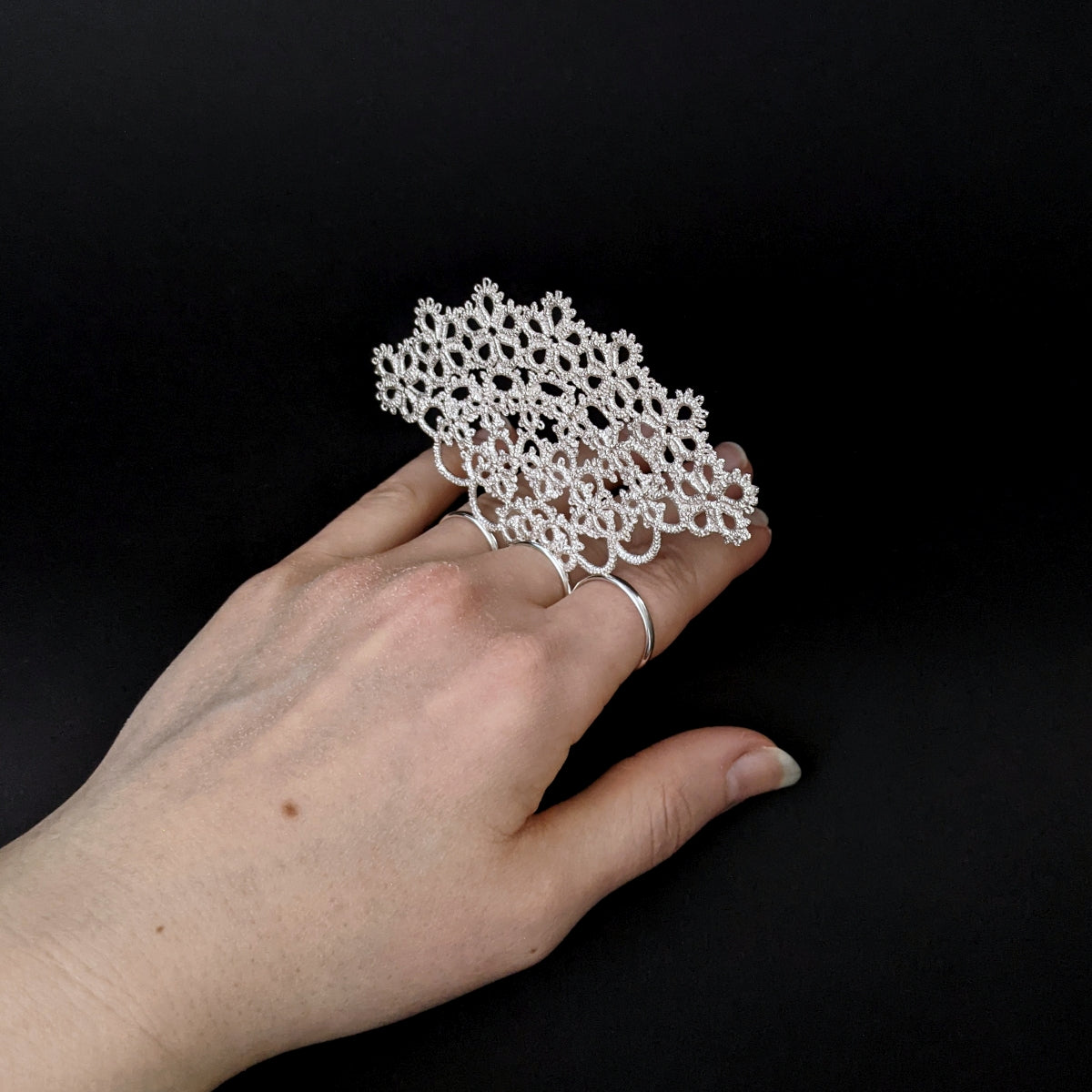 For when those unwanted suitors just won’t get the hint! Hand-tatted from cotton thread and then cast into solid sterling silver, this ring marries the concept of a lace fan with that of a set of knuckle dusters. The transformation of lace into metal is fascinating to me—how something so soft, delicate, and lightweight can turn into something deceptively hard, durable, and heavy. Recontextualizing it as a potential weapon takes this one step further, forcing the average viewer to see it not as something frivolous and easily overlooked, but as something demanding of attention and maybe even dangerous.