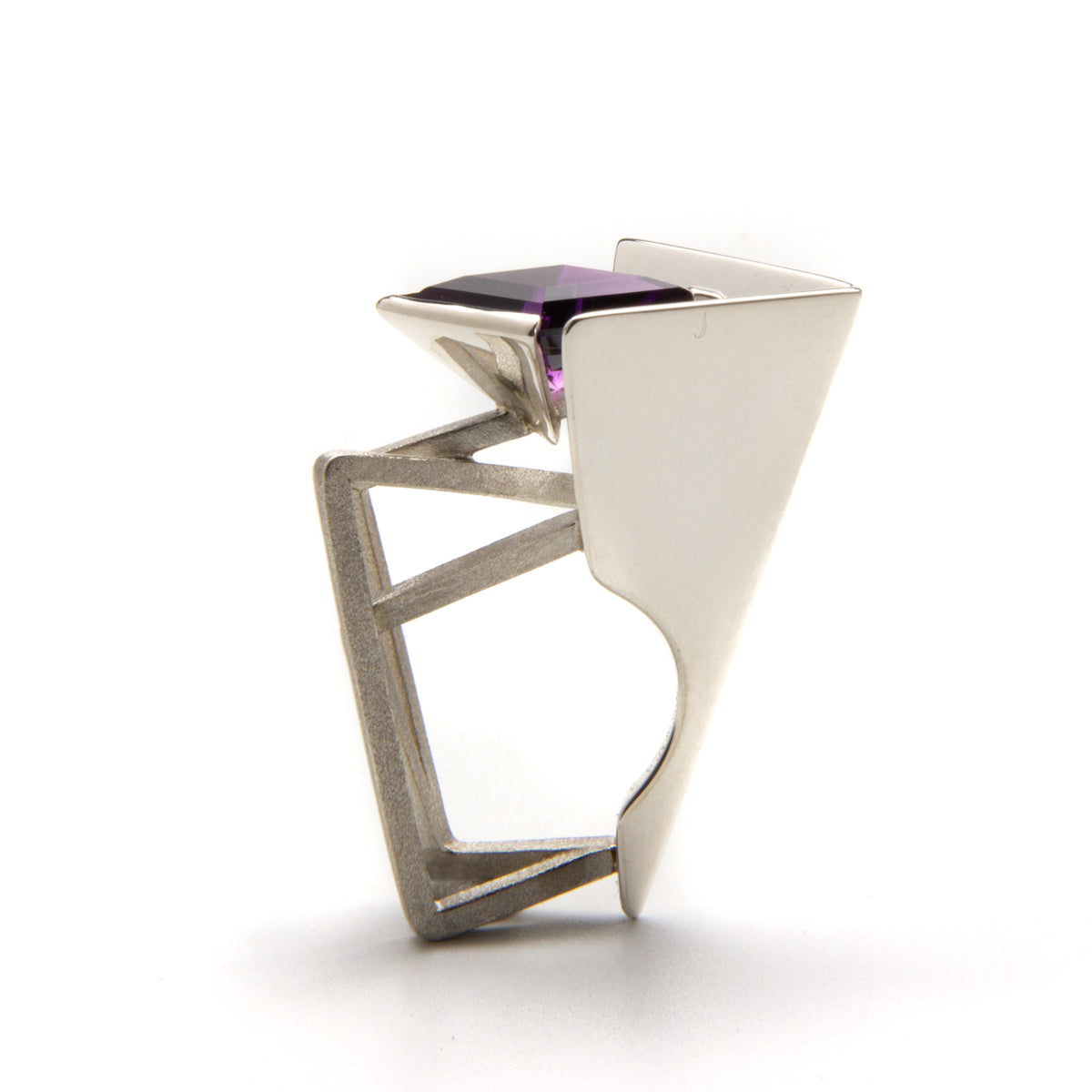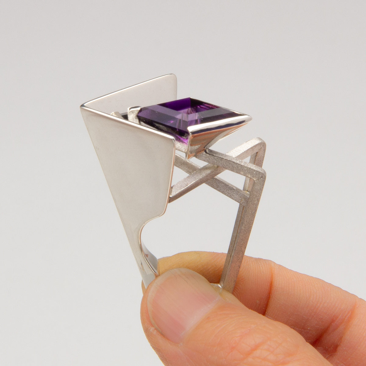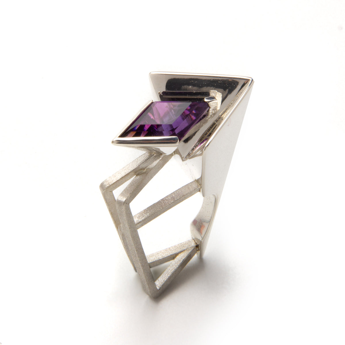 This is the idea that the Edge ring depicts. The ring is made of a shiny construction representing a cliff (the edge), three silver wires and a beautiful amethyst stone. While the stone is still attached to the cliff, it appears to be only hanging by a thread. This leaves the stone in an unstable state: still hanging on, but seconds away from tragedy.