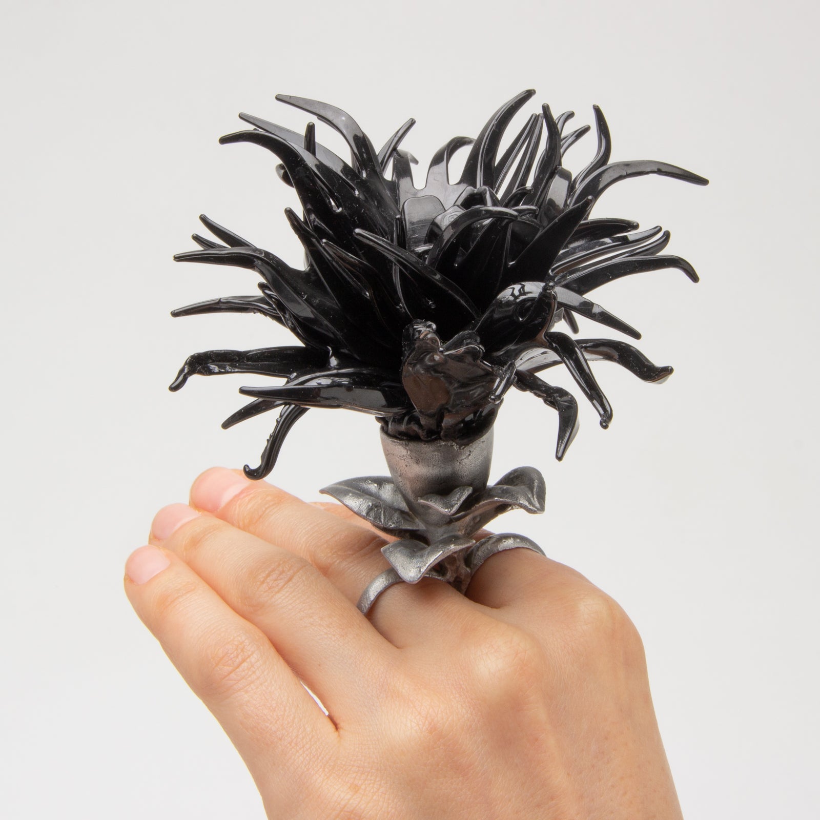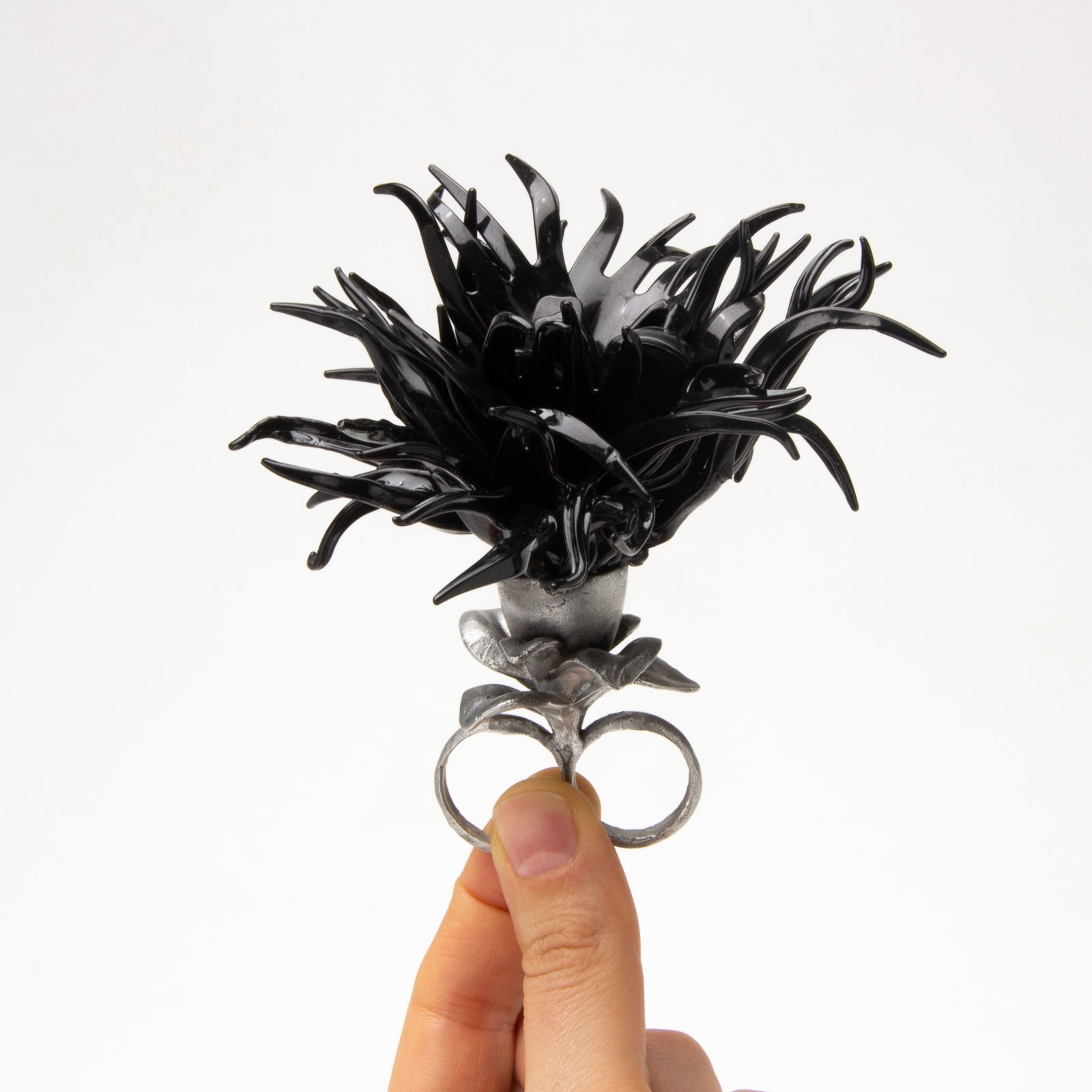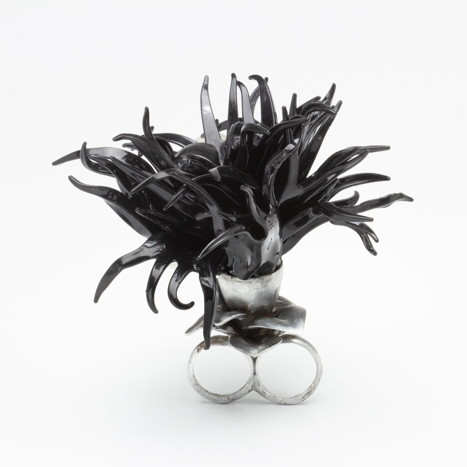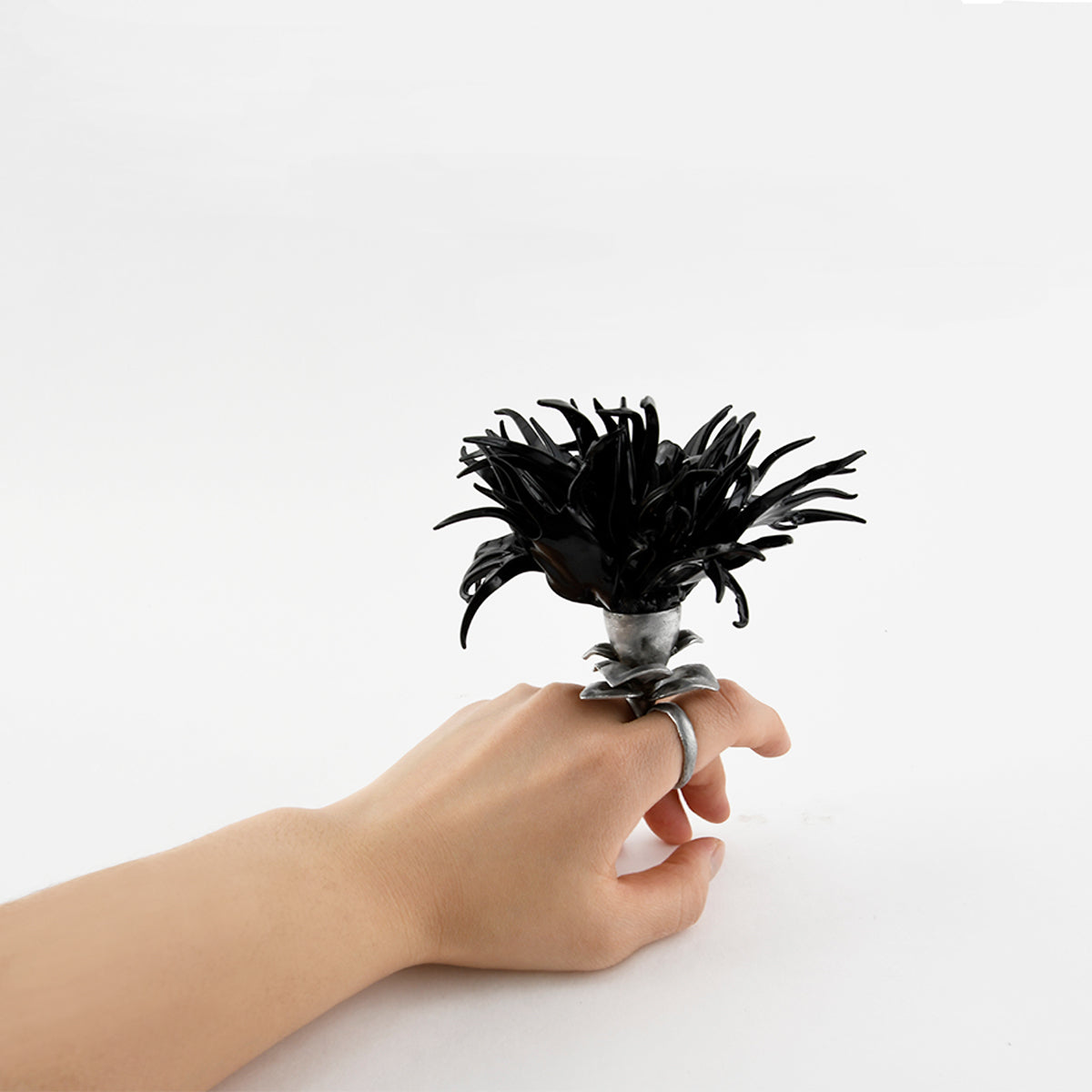 For this project, I collected thrown-away plastic forks from American school cafeterias, as I come from a culture that traditionally uses chopsticks and spoons. I conducted several material studies and manipulated the four prongs of the forks using heat to create various shapes. I also utilized aluminum cans, which are easily accessible in streets and trash bins due to the high consumption of carbonated beverages in the United States. I cast the ring part of the accessory using these cans.
