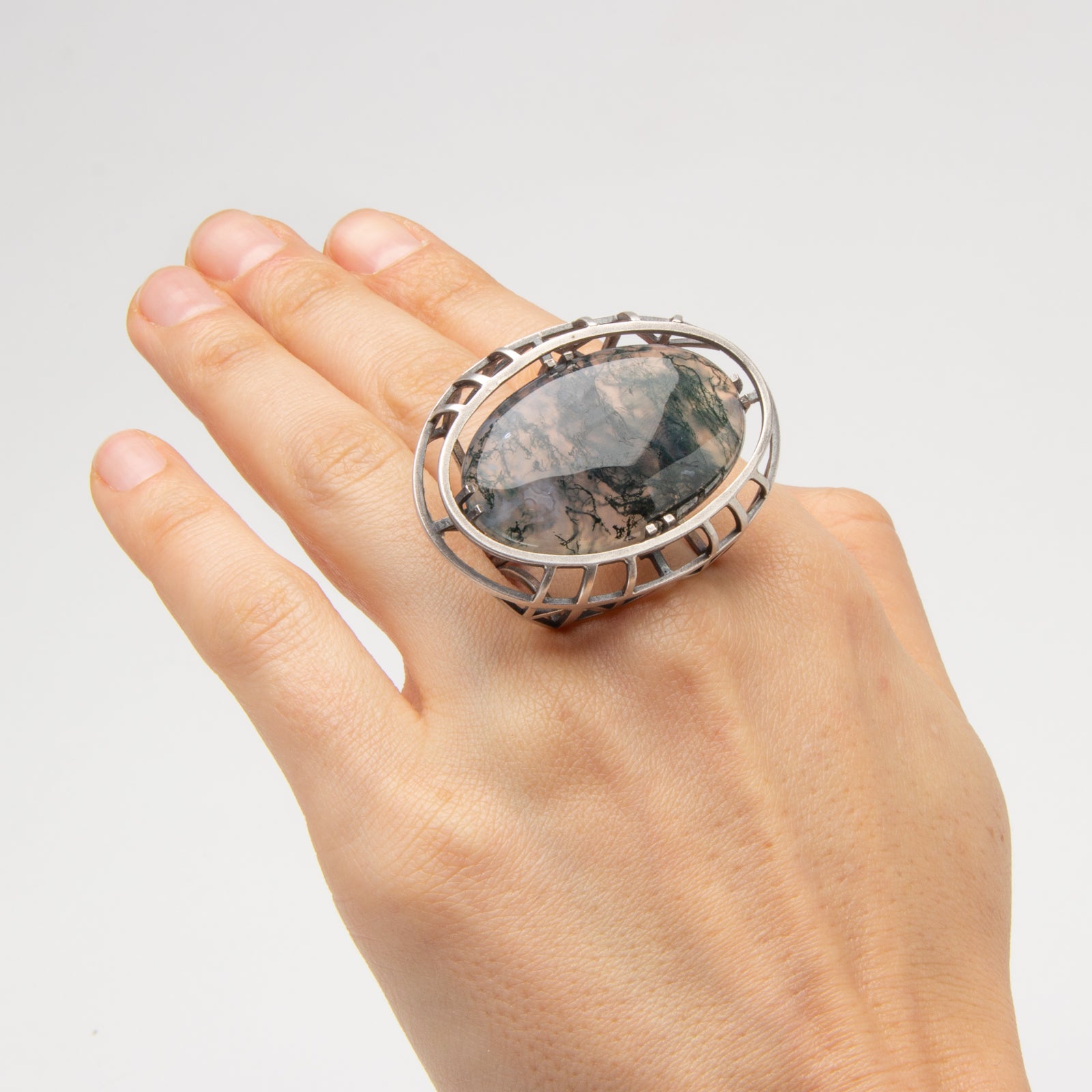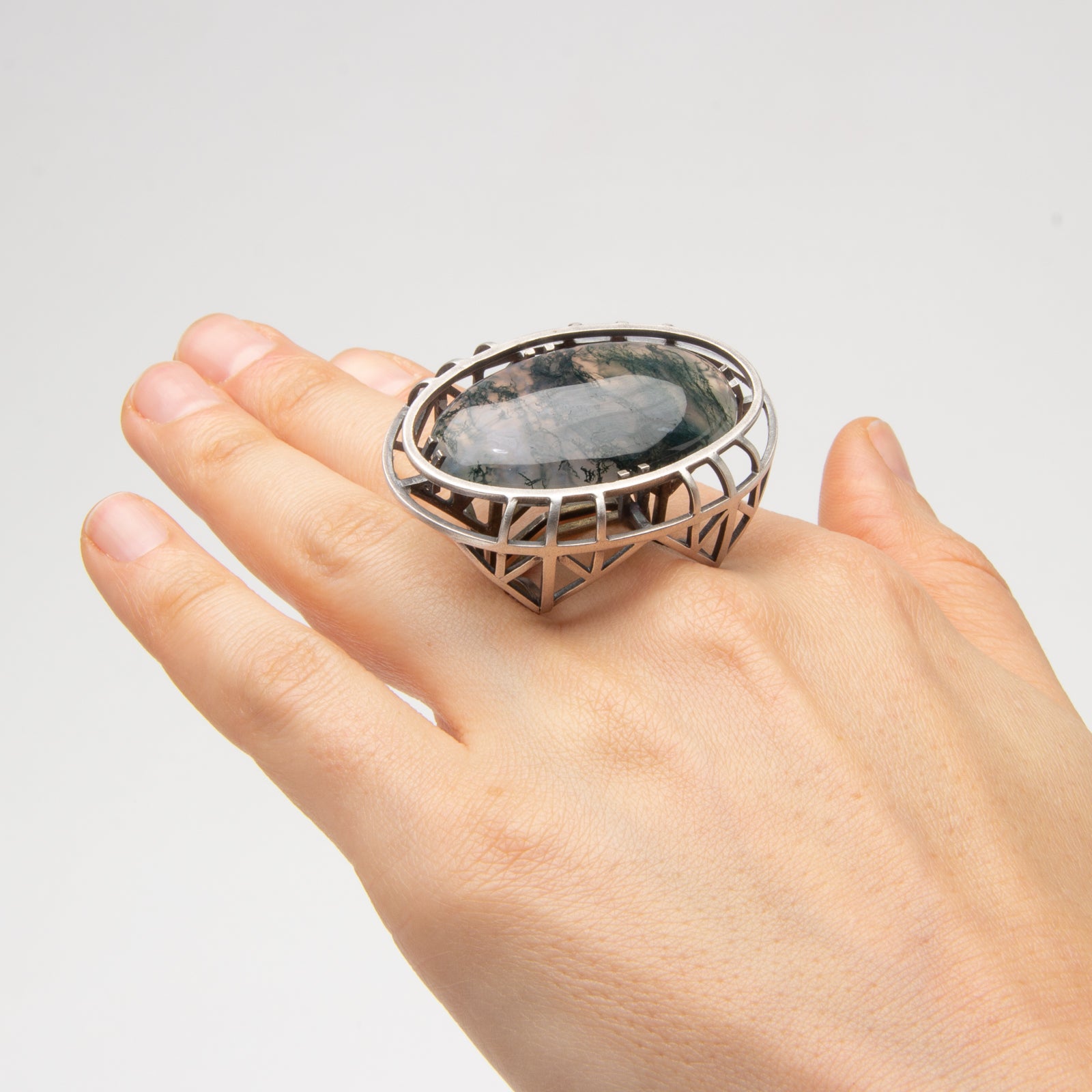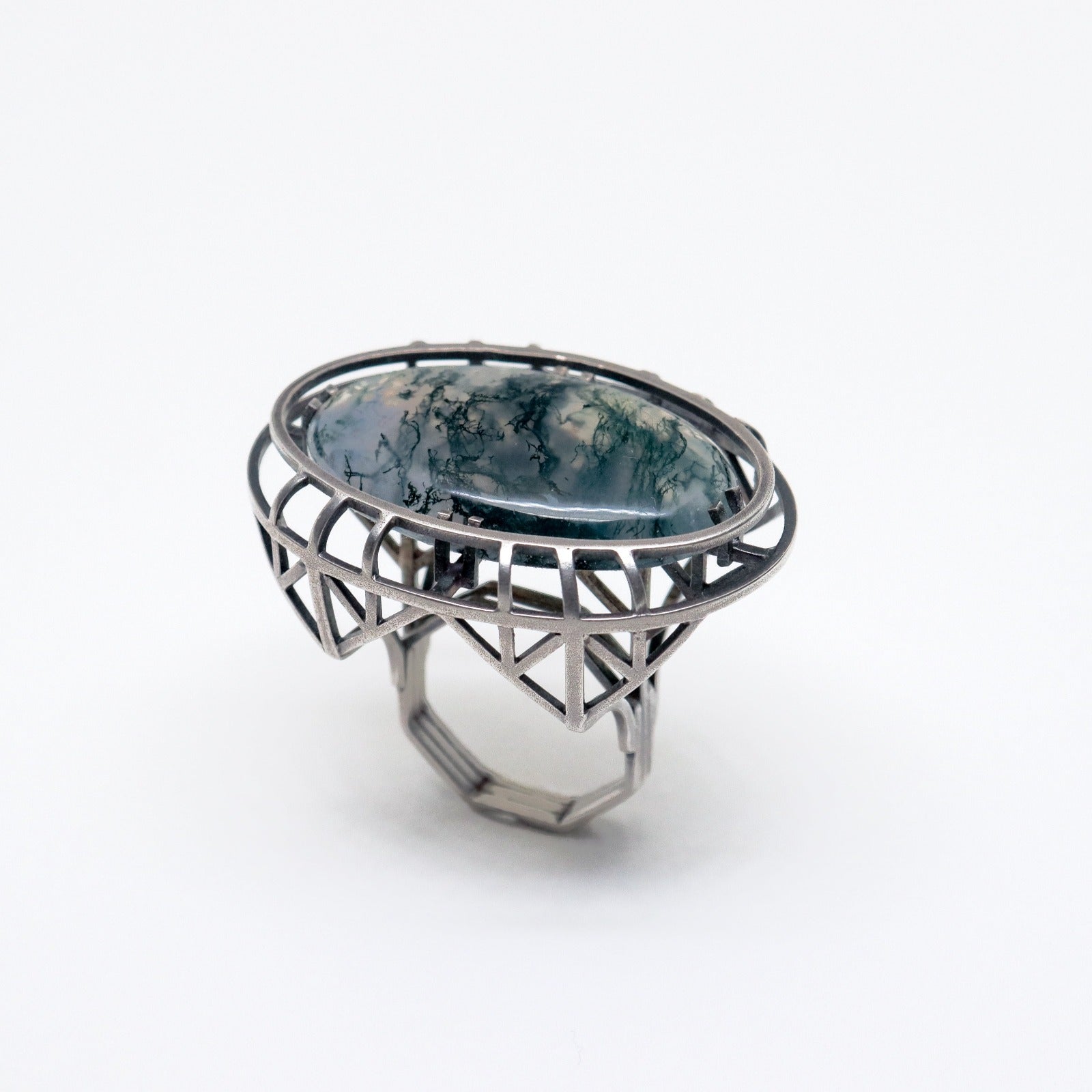 Artist Statement: This ring was inspired by the architecture of abandoned and decaying mining buildings in the Upper Midwest. While on a trip to Lake Superior, I visited abandoned sites and was inspired by the way the trusses on these buildings interacted with light. I chose to mimic and explore this interaction in a hand fabricated ring. Hold the ring to the light. Notice the way the patterns of the trusses interact and change as you move the ring. When the moss agate is held to the light, twisting green seaweed-like patterns emerge. I chose to use an agate to call back to Lake Superior and the agates found on its shores.
