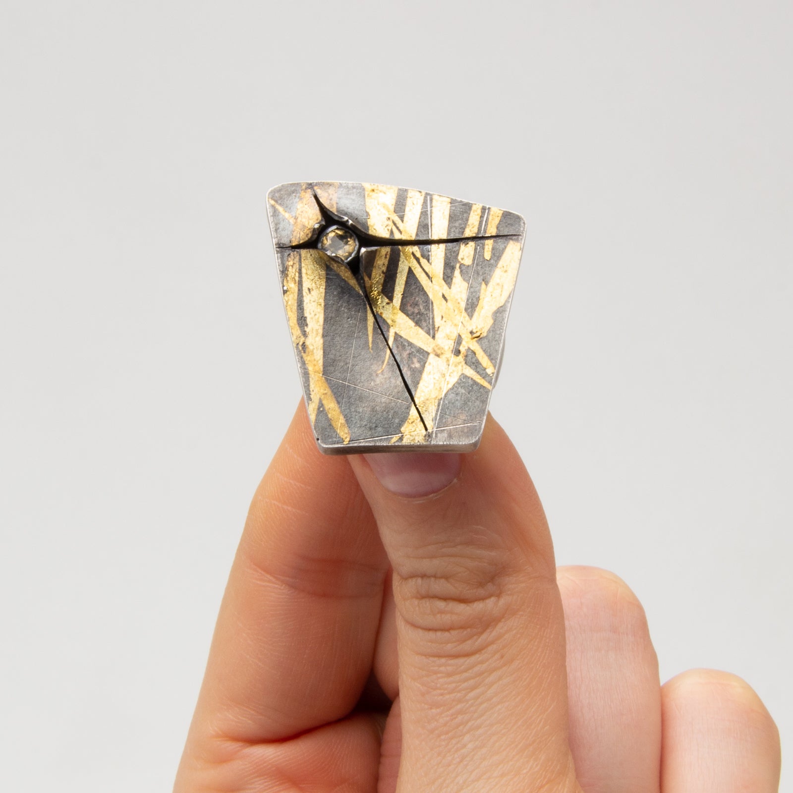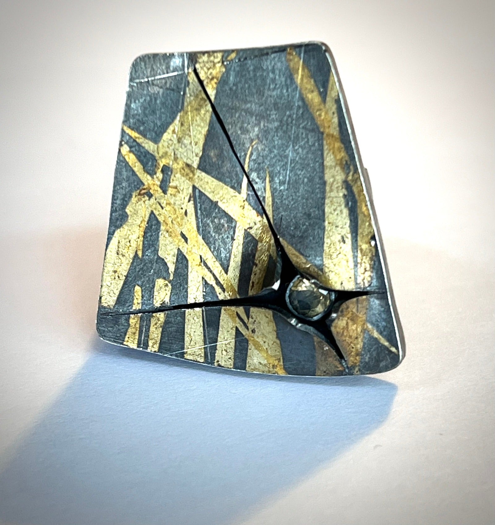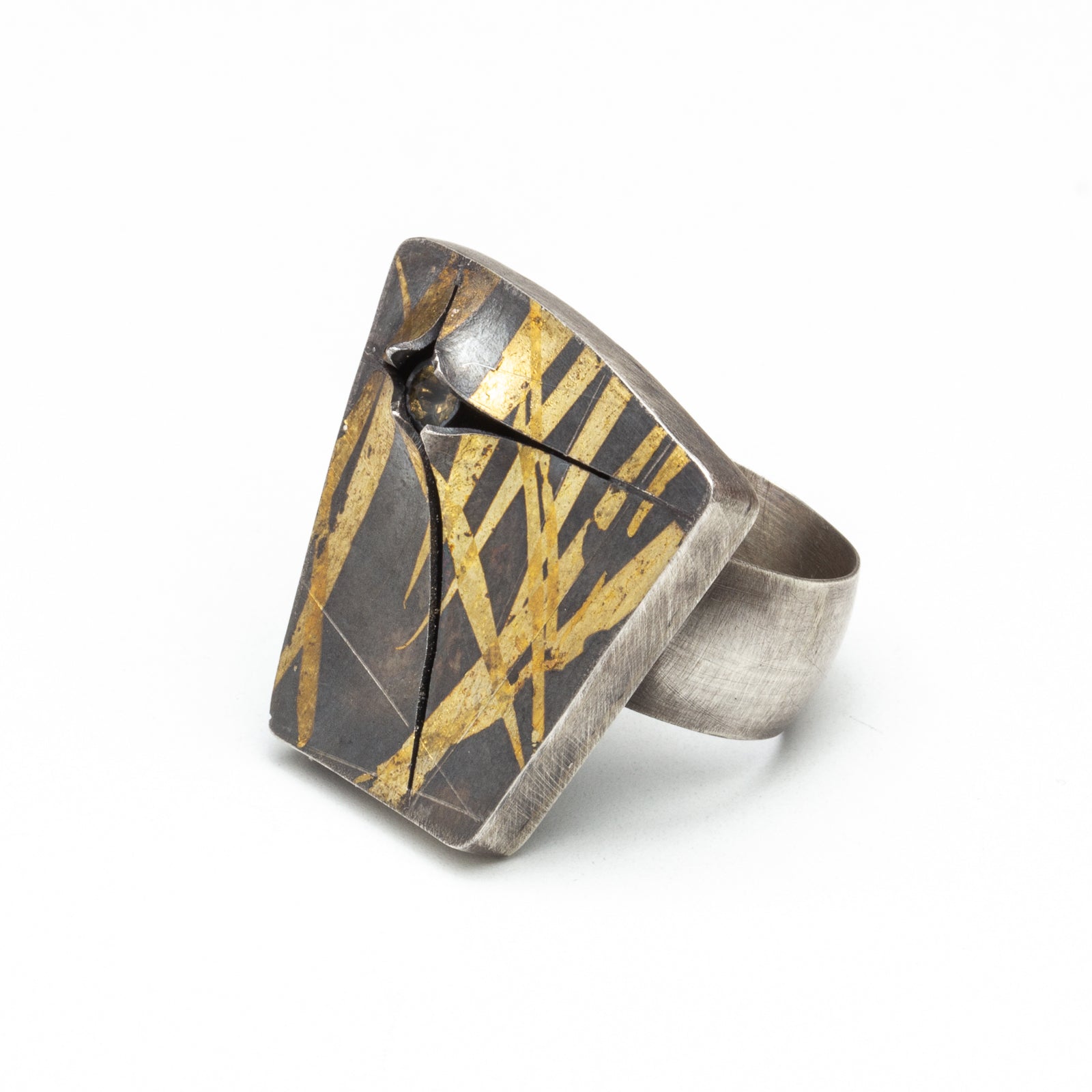 Artist Statement: The beginning of a new year naturally brings up ideas of birth and renewal. How do you capture that feeling in a ring? So many ideas, but in the end cutting dynamically into a hollow form box layered with fused gold and scribed lines, peeling back the surface to partially reveal a tube set faceted stone (the sun?) rising yet again, formed this entry. Every year brings new ideas, new things to learn and new challenges--this ring is no exception.