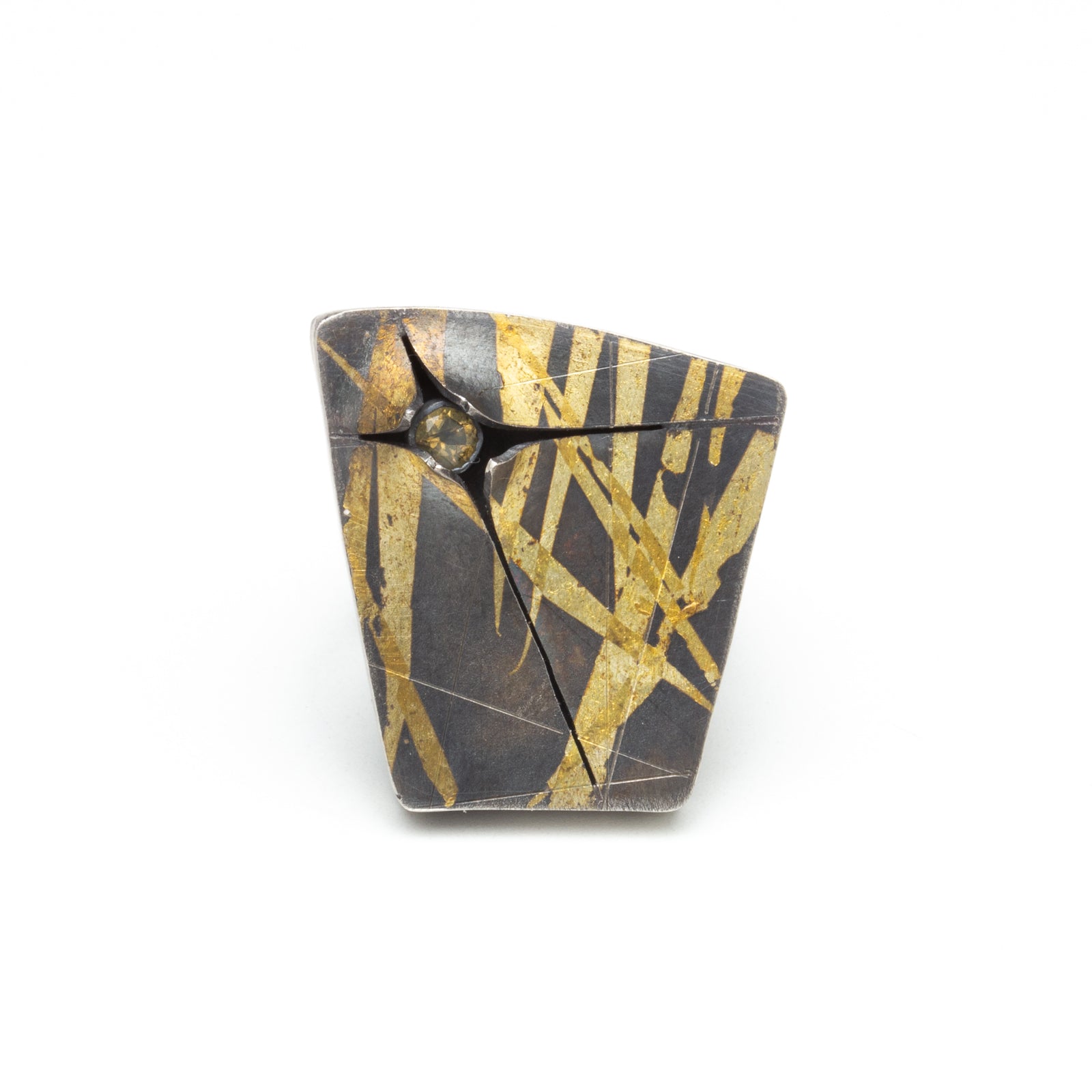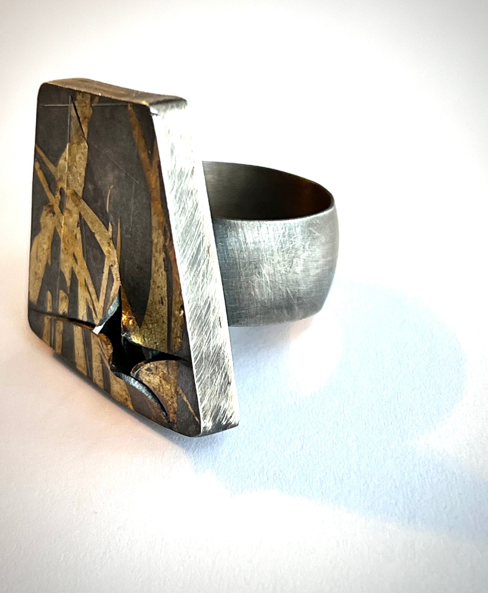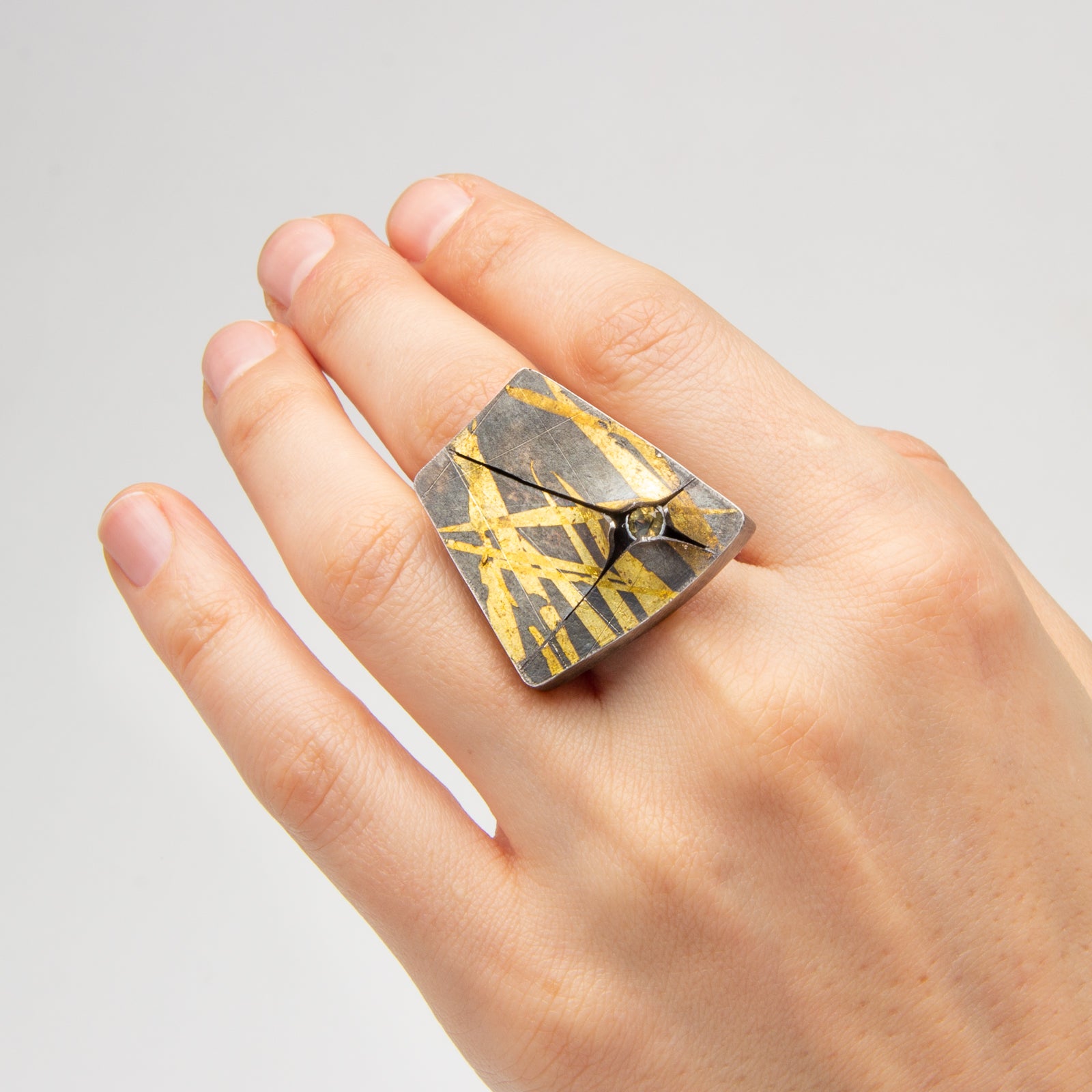Artist Statement: The beginning of a new year naturally brings up ideas of birth and renewal. How do you capture that feeling in a ring? So many ideas, but in the end cutting dynamically into a hollow form box layered with fused gold and scribed lines, peeling back the surface to partially reveal a tube set faceted stone (the sun?) rising yet again, formed this entry. Every year brings new ideas, new things to learn and new challenges--this ring is no exception.