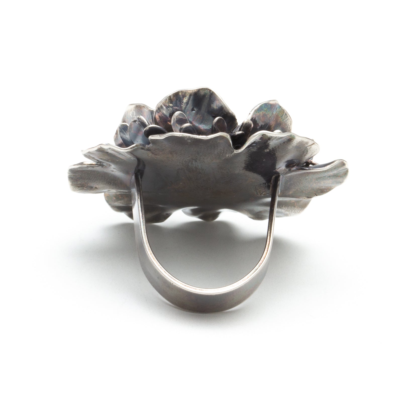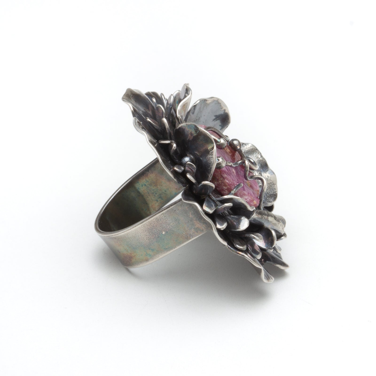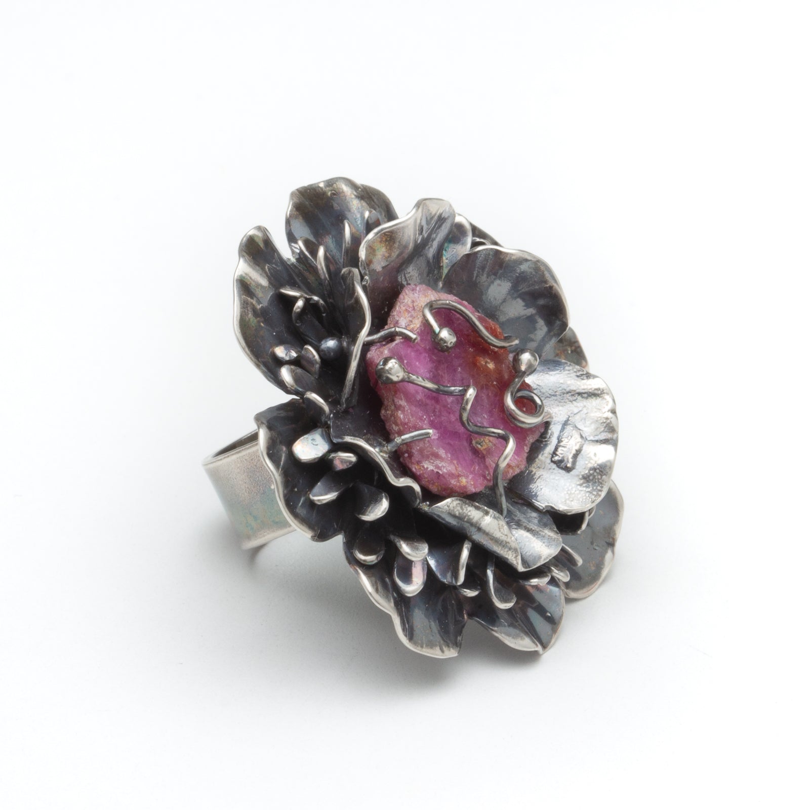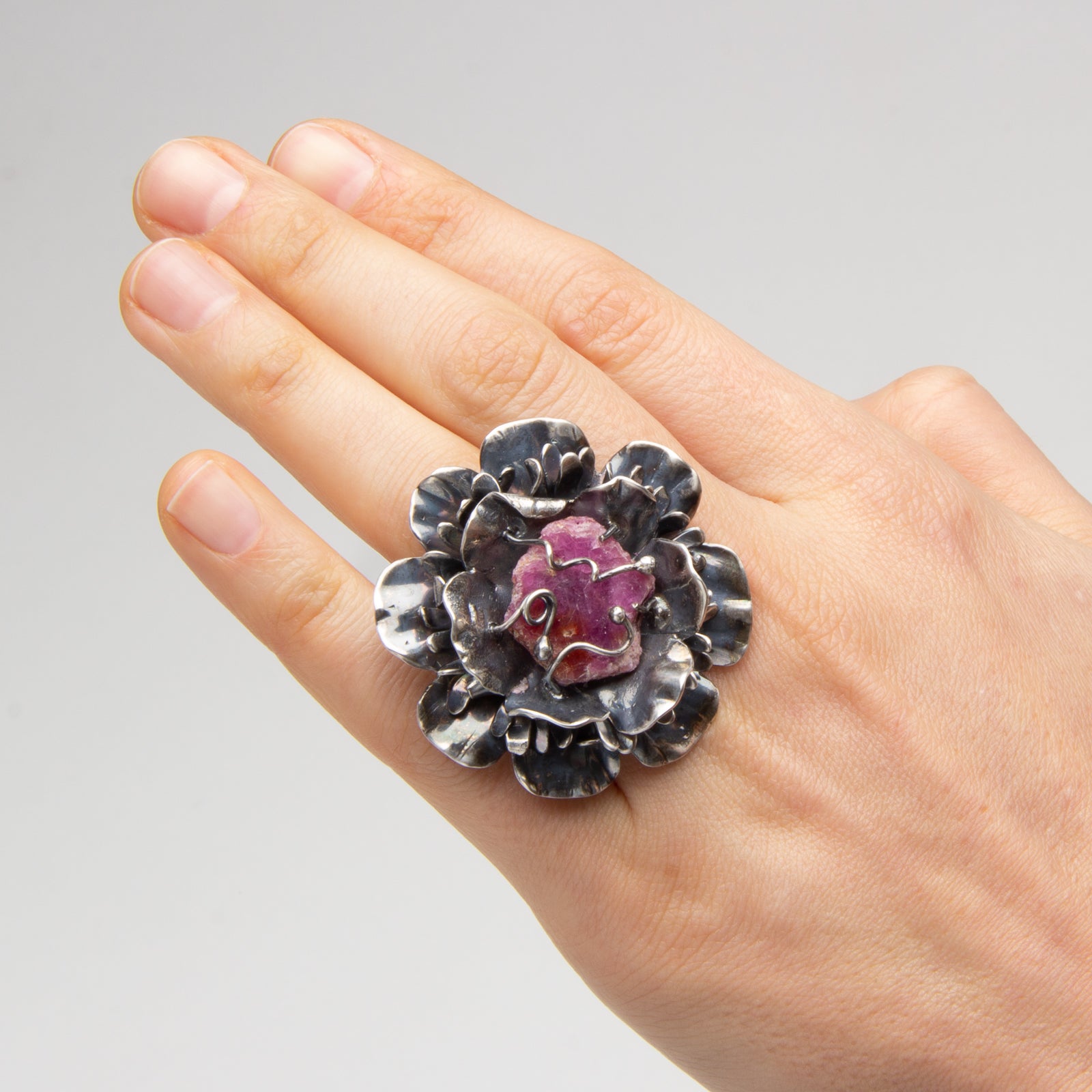 Artist Statement: Multi-layered sterling flower with Ruby slice. The petals are sculpted giving life and dimension to the flower. Beautiful, gently weighty, cocktail ring for your special night out. Bring a piece of spring into the dreary, dark winter. Will surely turn heads. You’ll enjoy the comfort of this special ring.