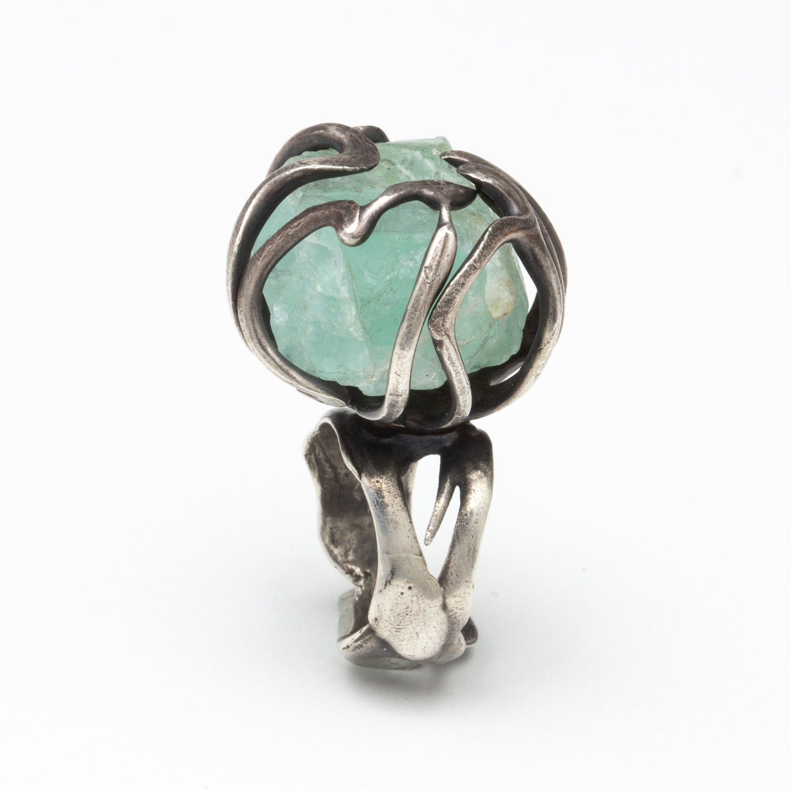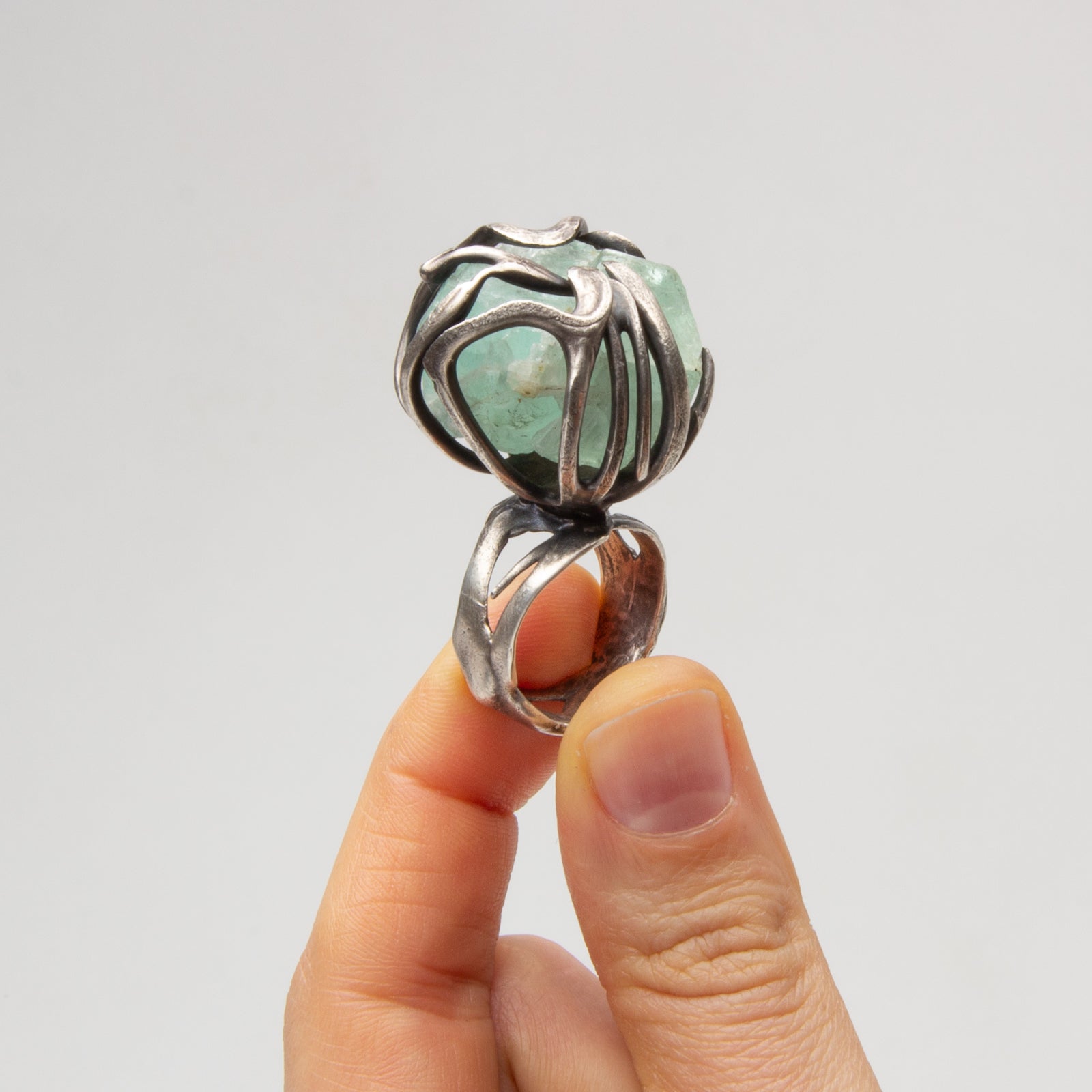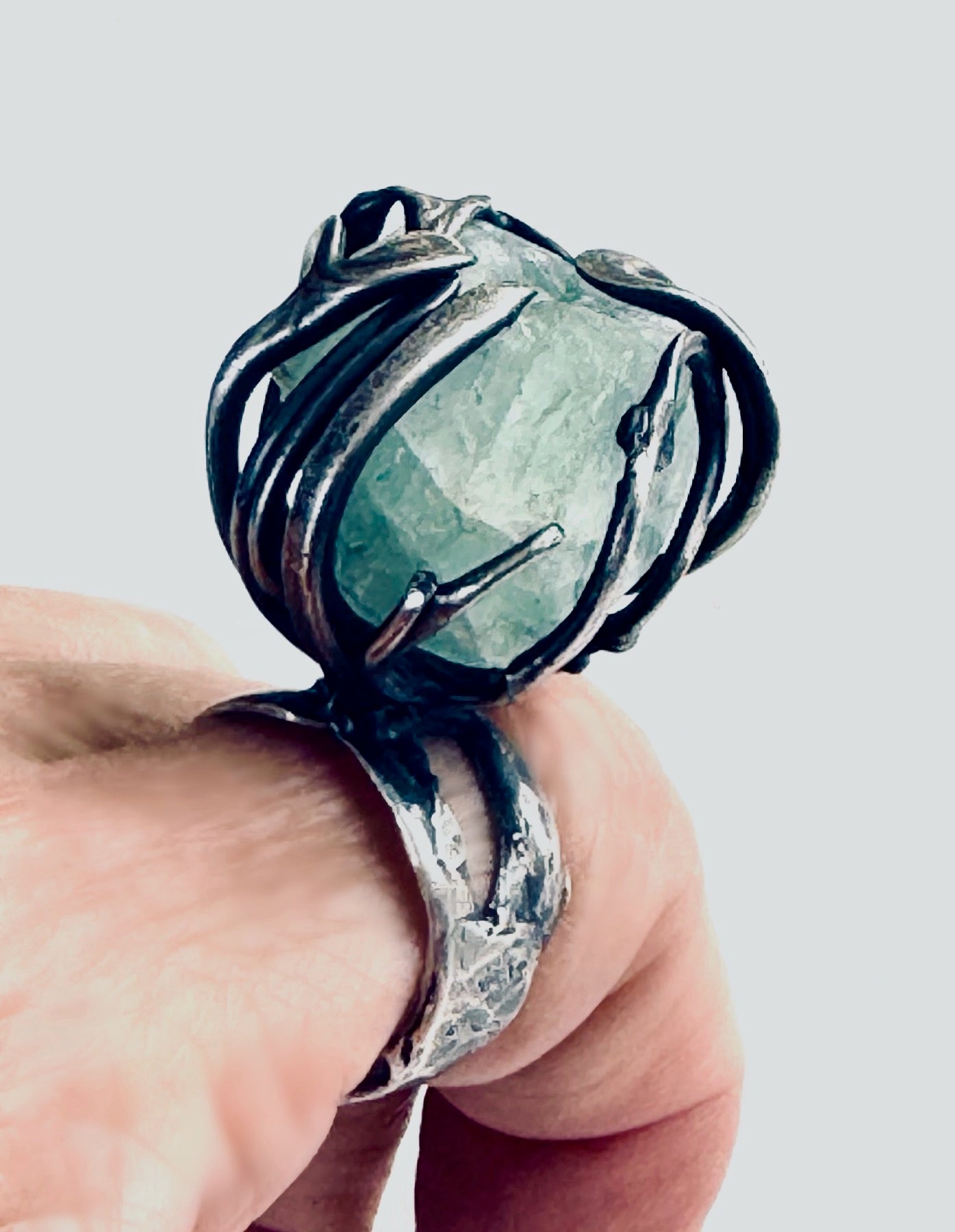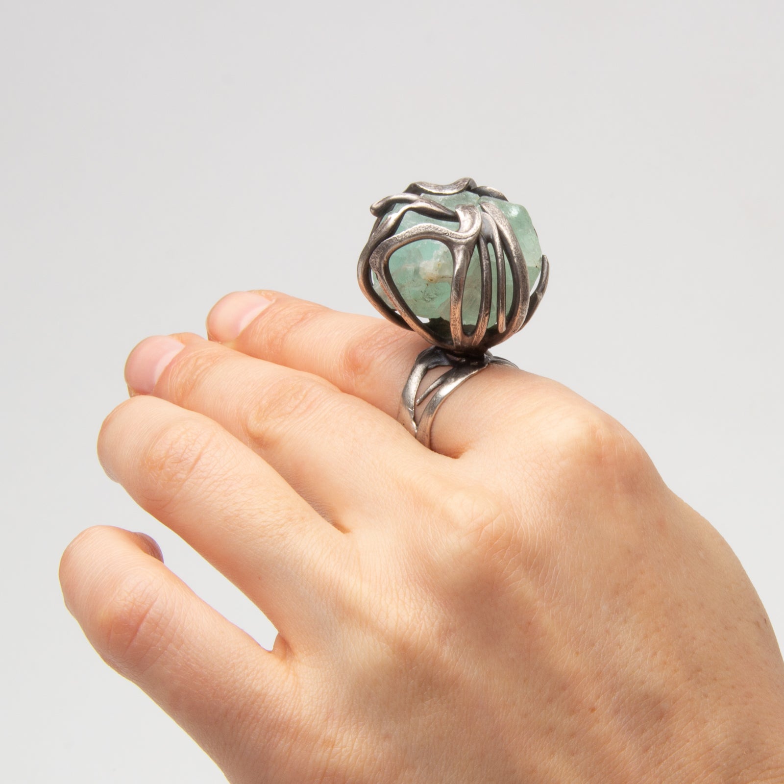 Artist Statement: In life we all need protection. So do our treasures. The Bloom sterling silver setting showcases and protects this precious raw fluorite stone. The petals naturally encase the stone. The ring is created with 2 lost wax casted pieces that I created in wax and soldered. The top bloom petals are one of a kind created in wax and lost in the process. The bottom band is a modify limited edition from my castings. The sterling silver is darkened for an oxidized finish.
