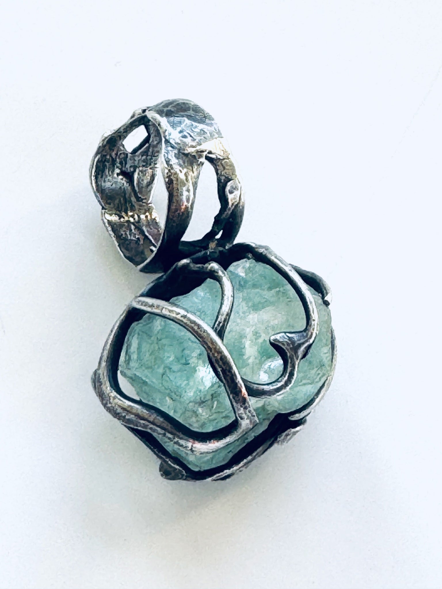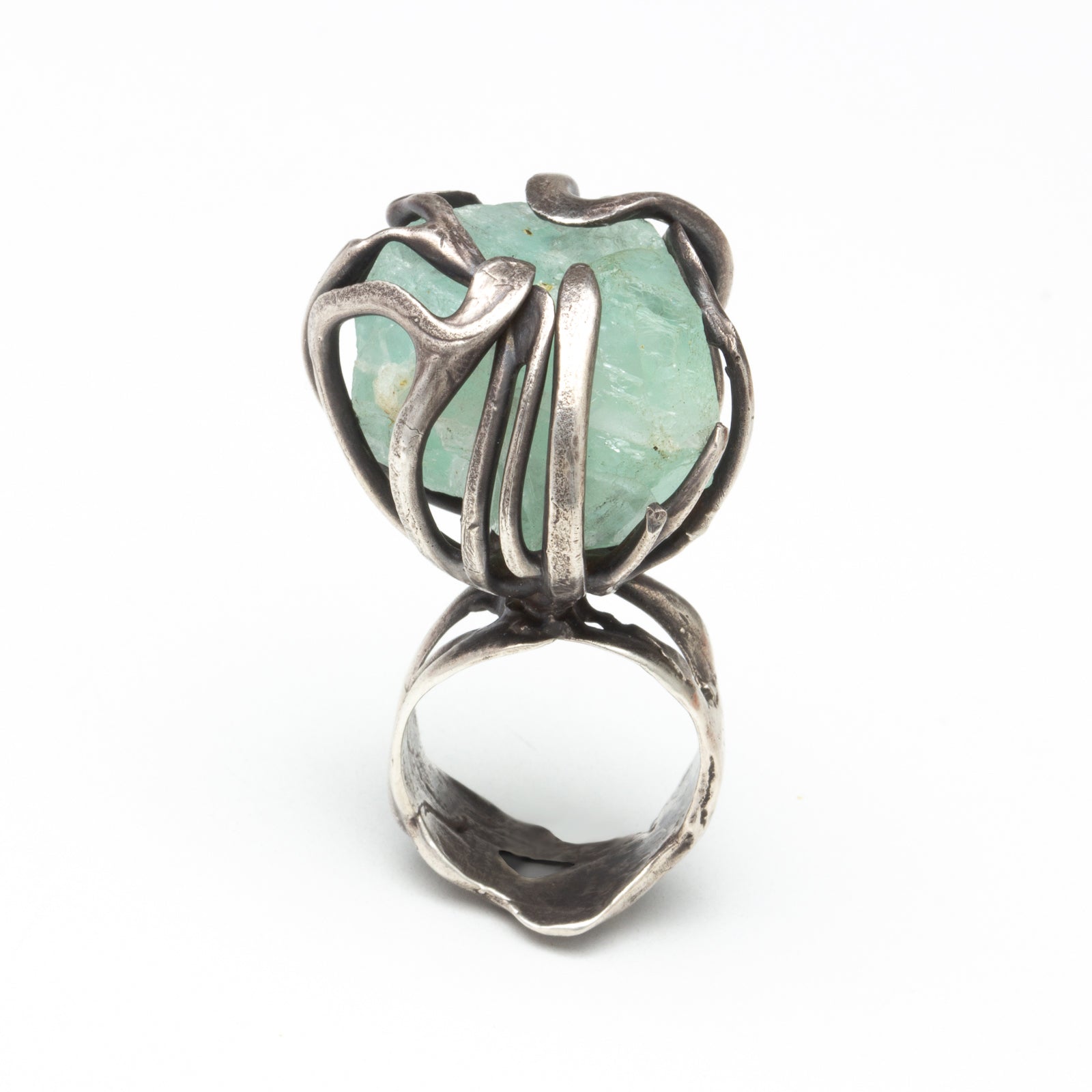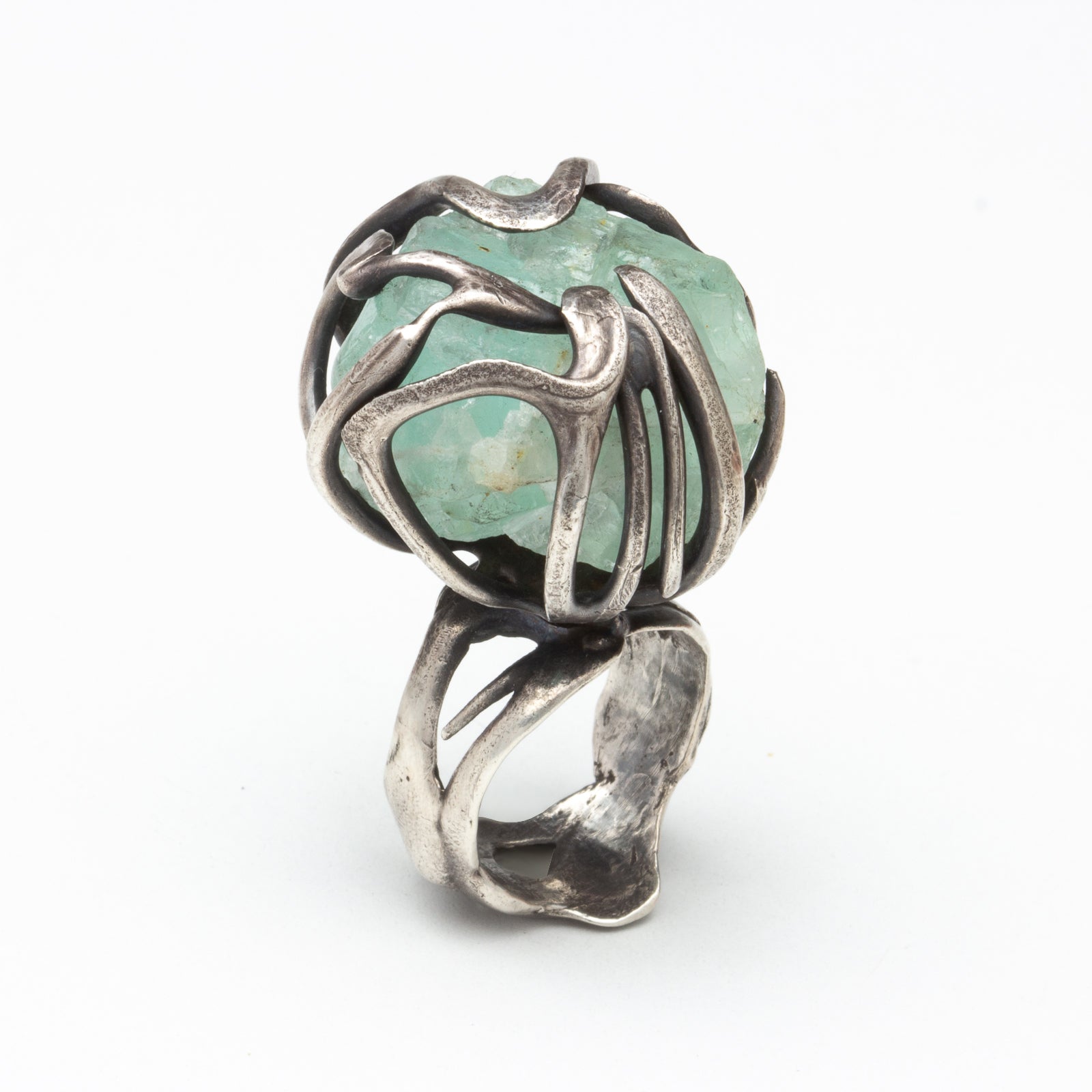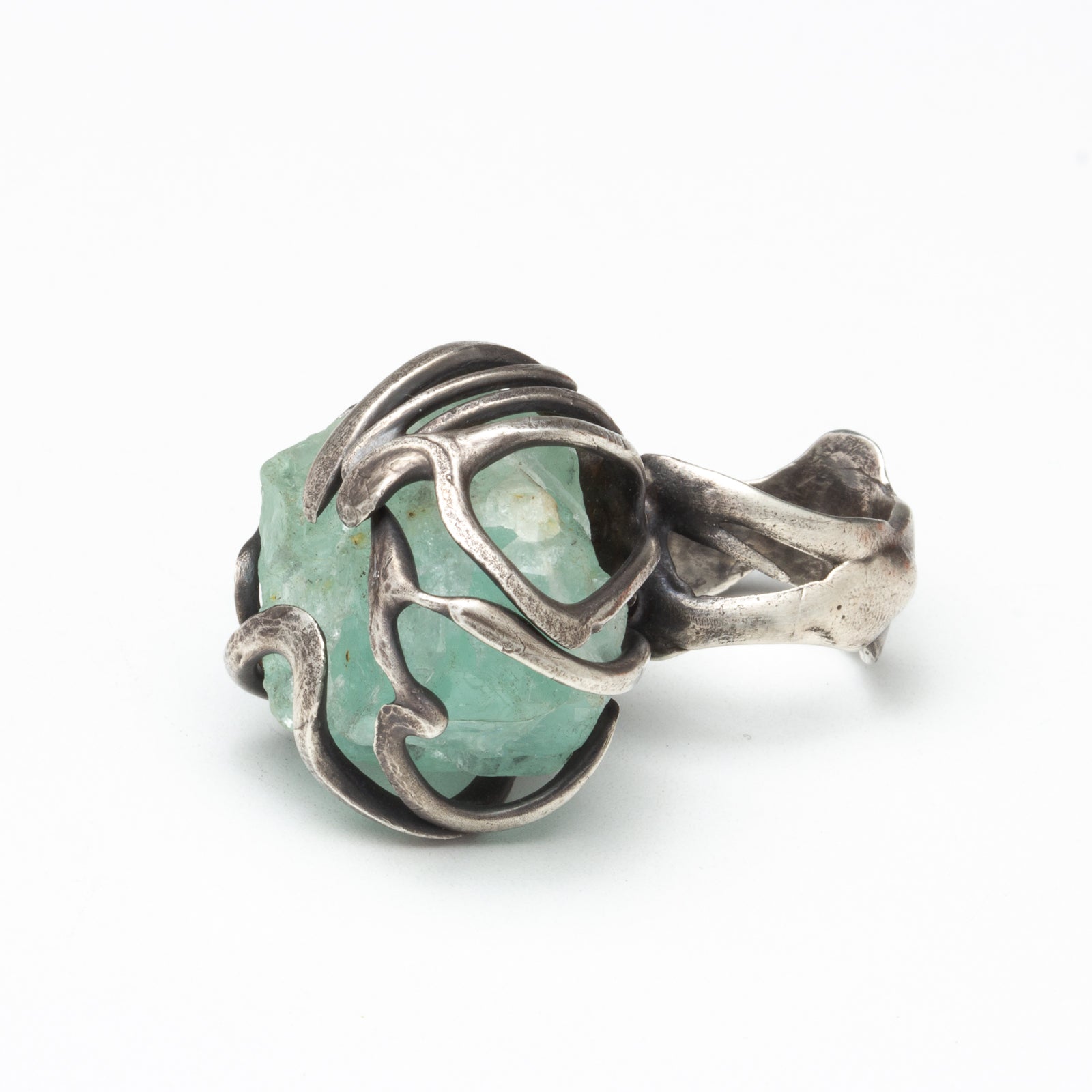 Artist Statement: In life we all need protection. So do our treasures. The Bloom sterling silver setting showcases and protects this precious raw fluorite stone. The petals naturally encase the stone. The ring is created with 2 lost wax casted pieces that I created in wax and soldered. The top bloom petals are one of a kind created in wax and lost in the process. The bottom band is a modify limited edition from my castings. The sterling silver is darkened for an oxidized finish.