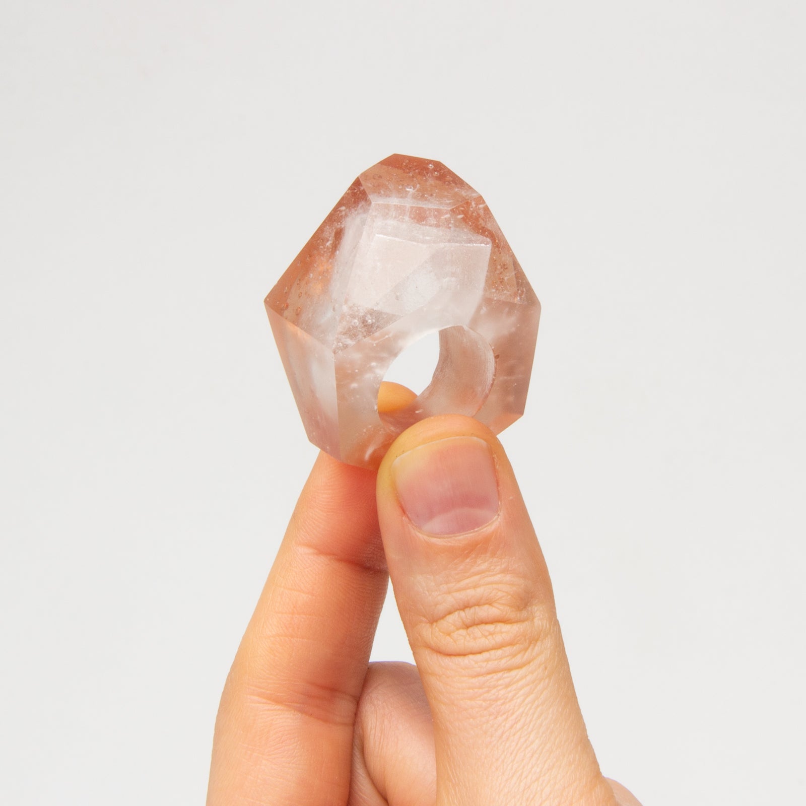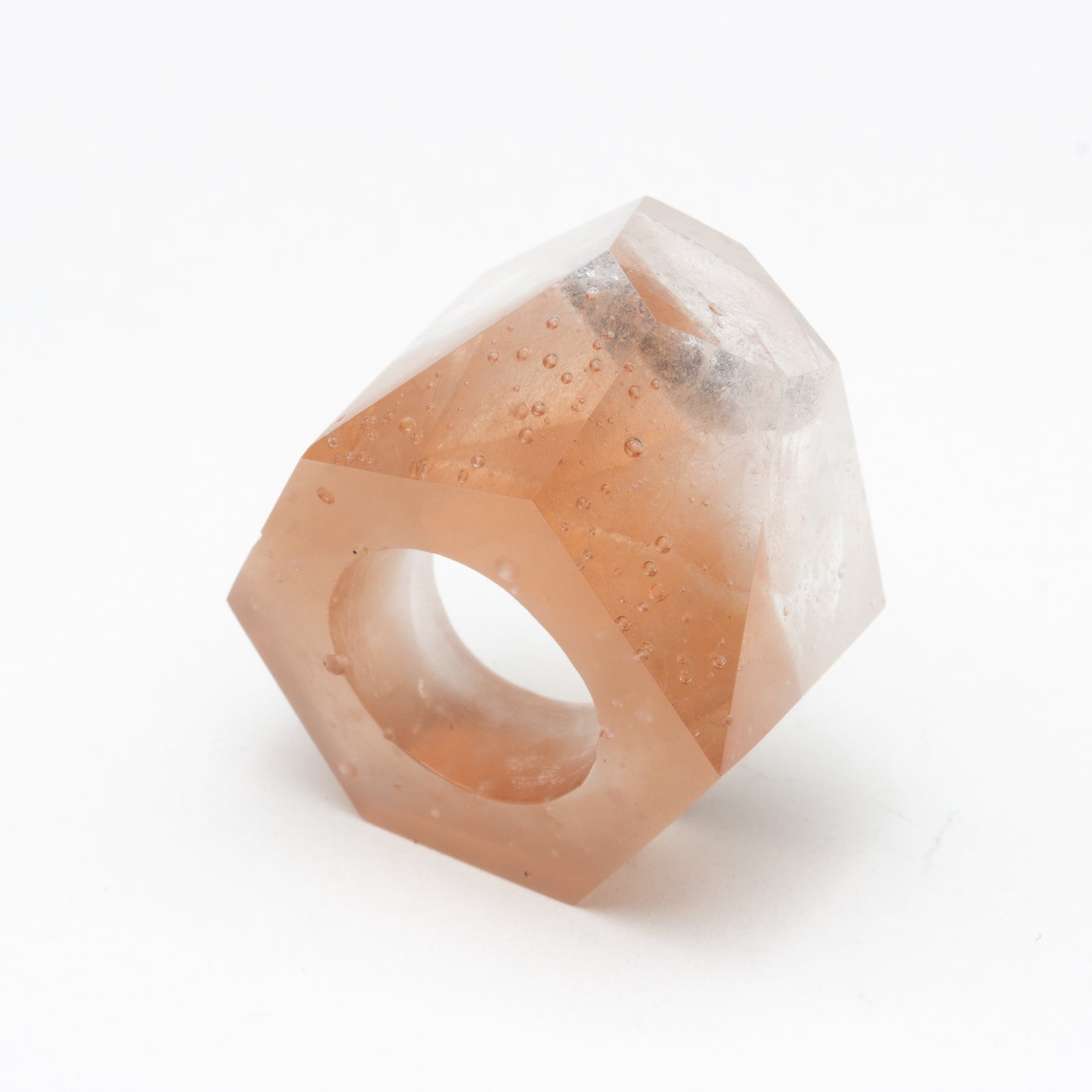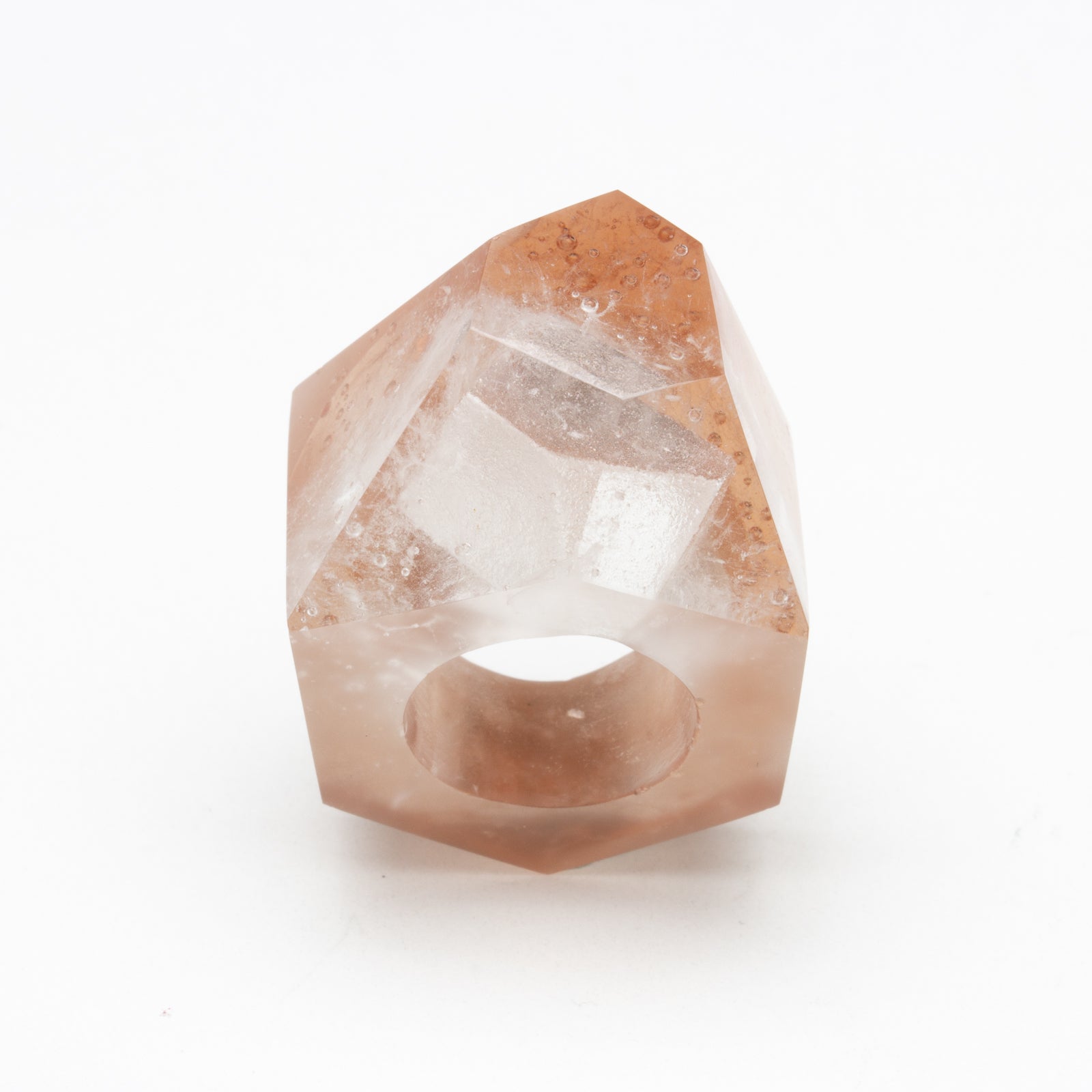 The Void Glass Ring: The inner side of the ring showcases geometric embossing, adding a dimensional aspect by revealing diverse shapes from various angles. It incorporates color-changing glass, transforming to rhubarb pink in sunlight and green under fluorescent light.