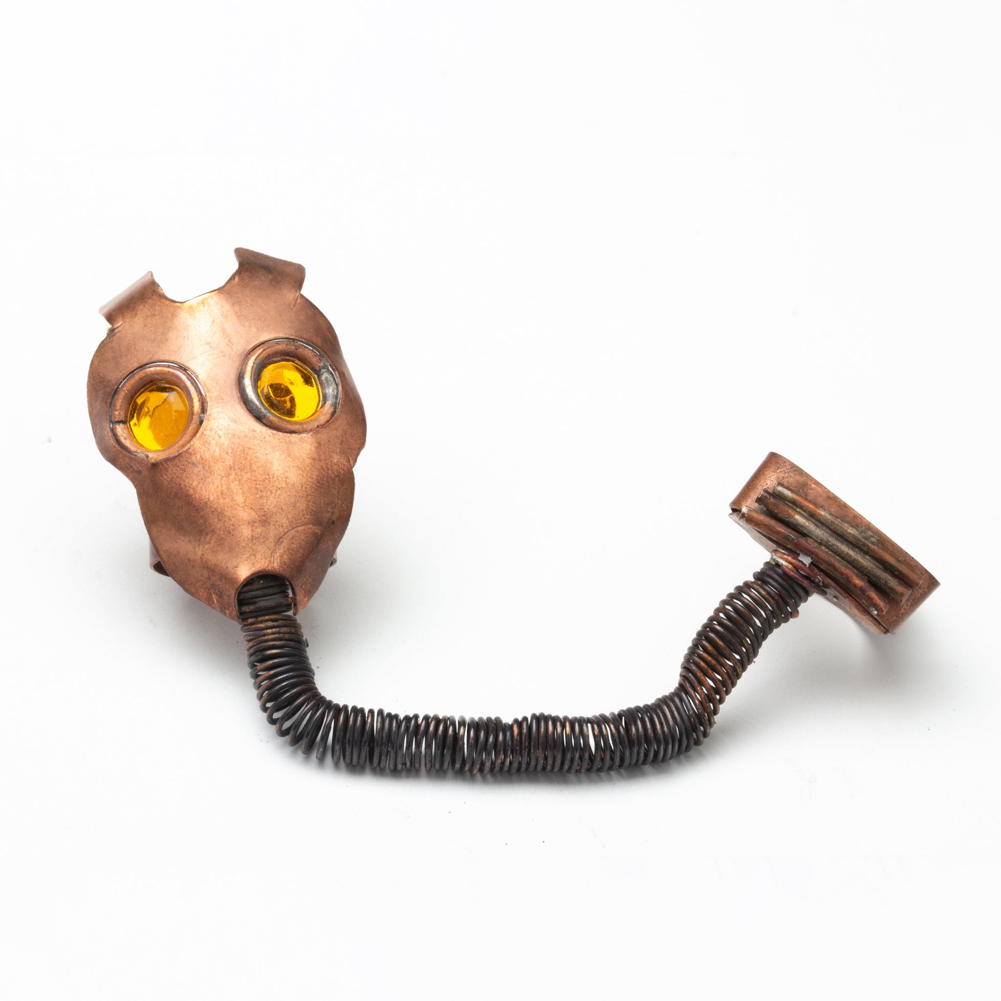 Artist Statement: I wanted to challenge my abilities as i am fairly new to this kind of work. I also wanted to reflect the history and past life of my creation through its dents and scuffed finish. This gas mask is an invention of war and has a grim history and I wanted to make sure I could capture its abused history.