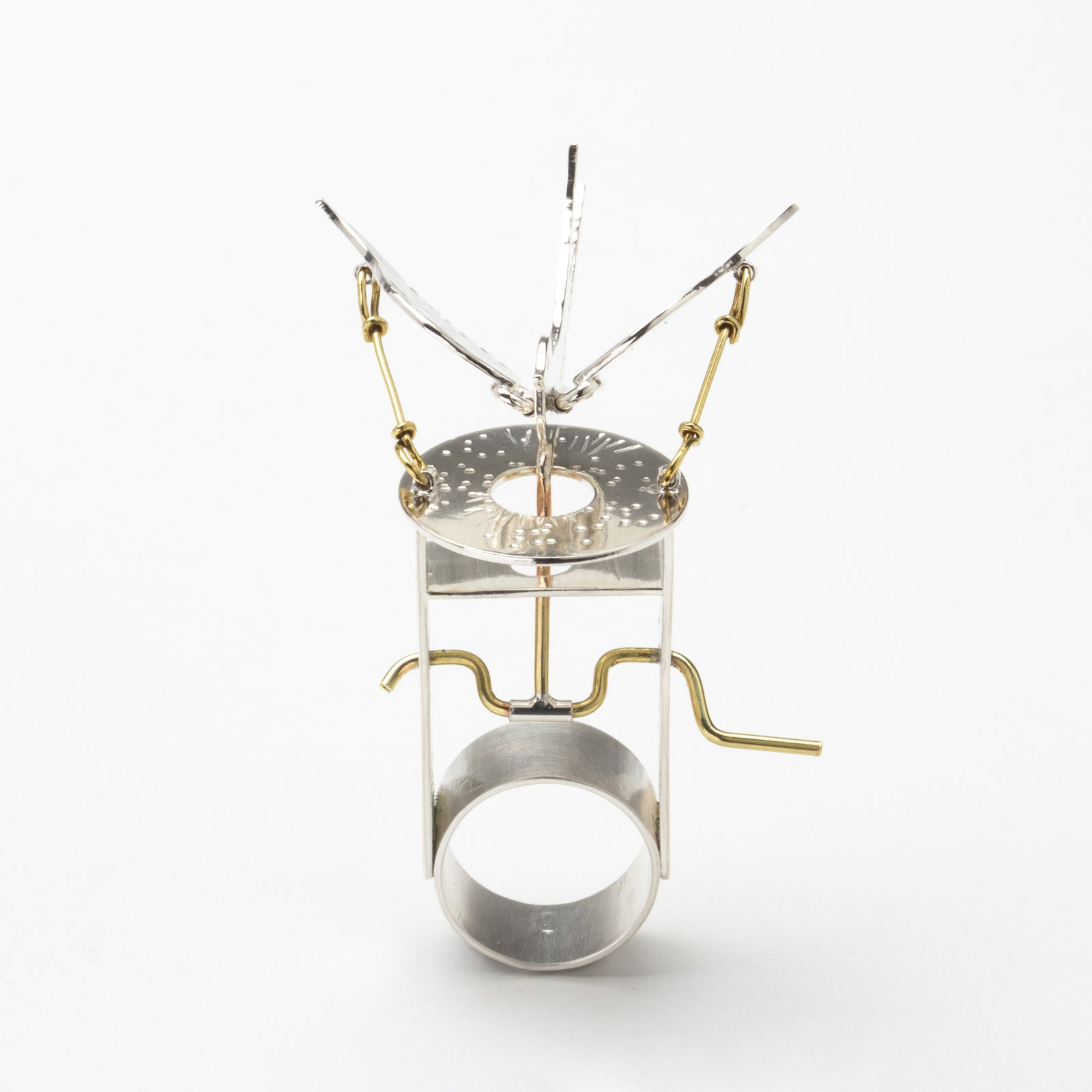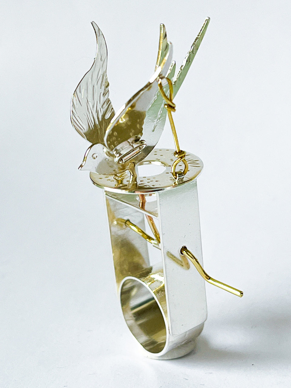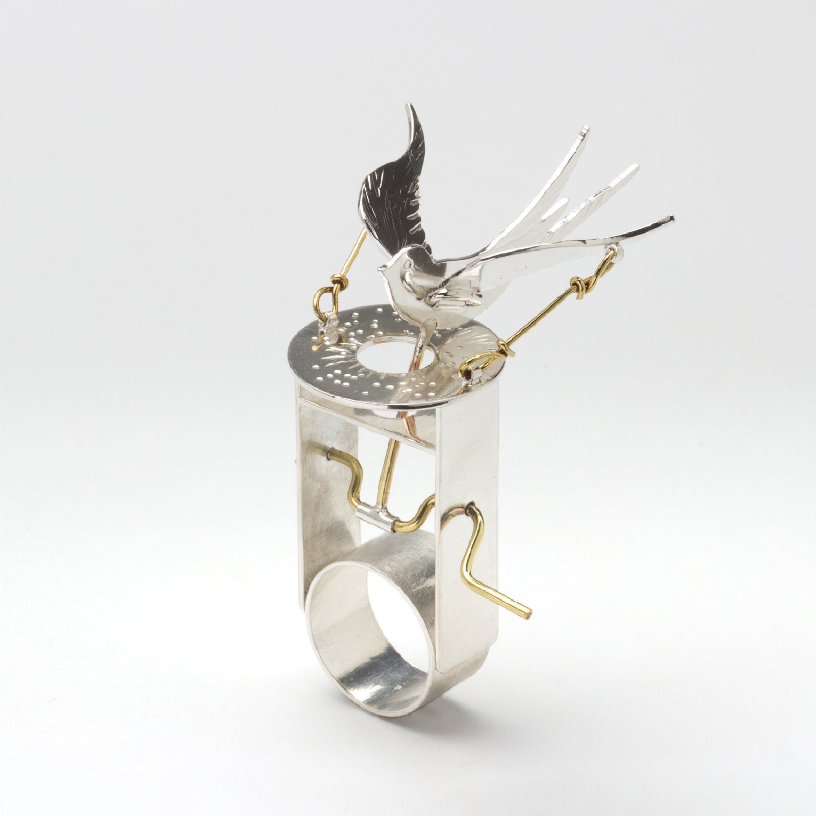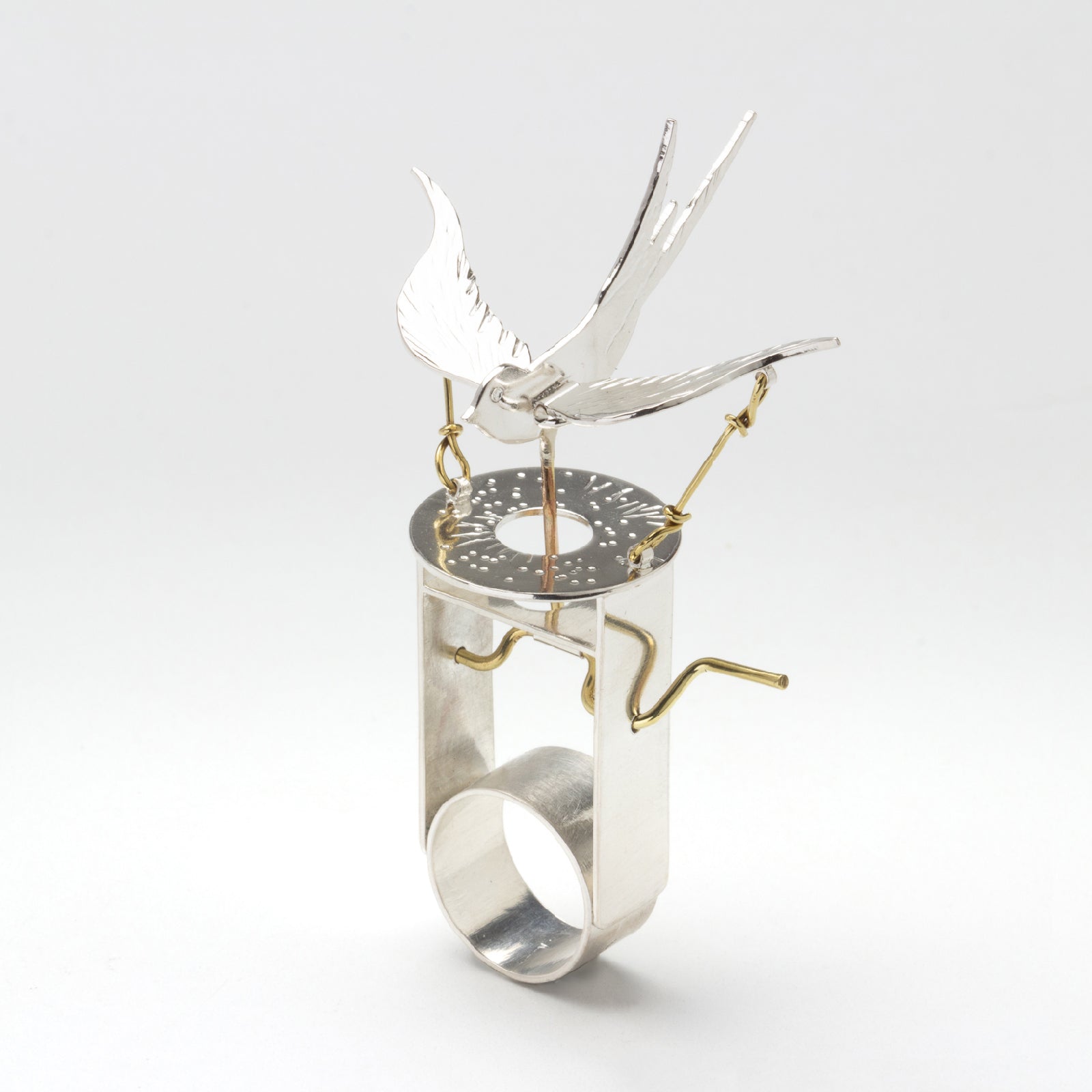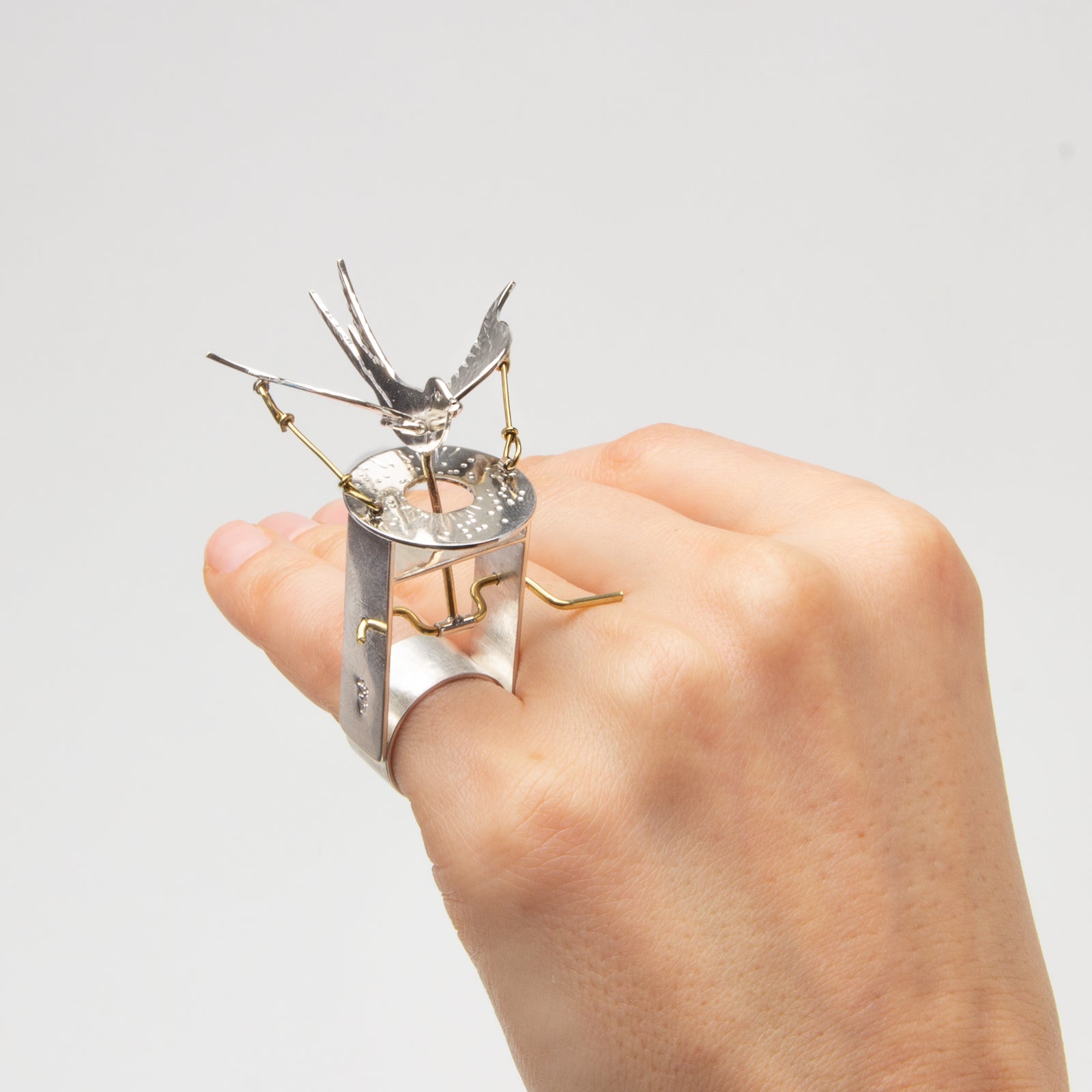 Automata are sculptures that employ a variety of mechanical elements to create movement. Ideally these are self-powered, but in this case the mechanics of the ring are controlled by the wearer. The resulting movements approximate those of a real swallow, which is notable for the swooping nature of its flight.