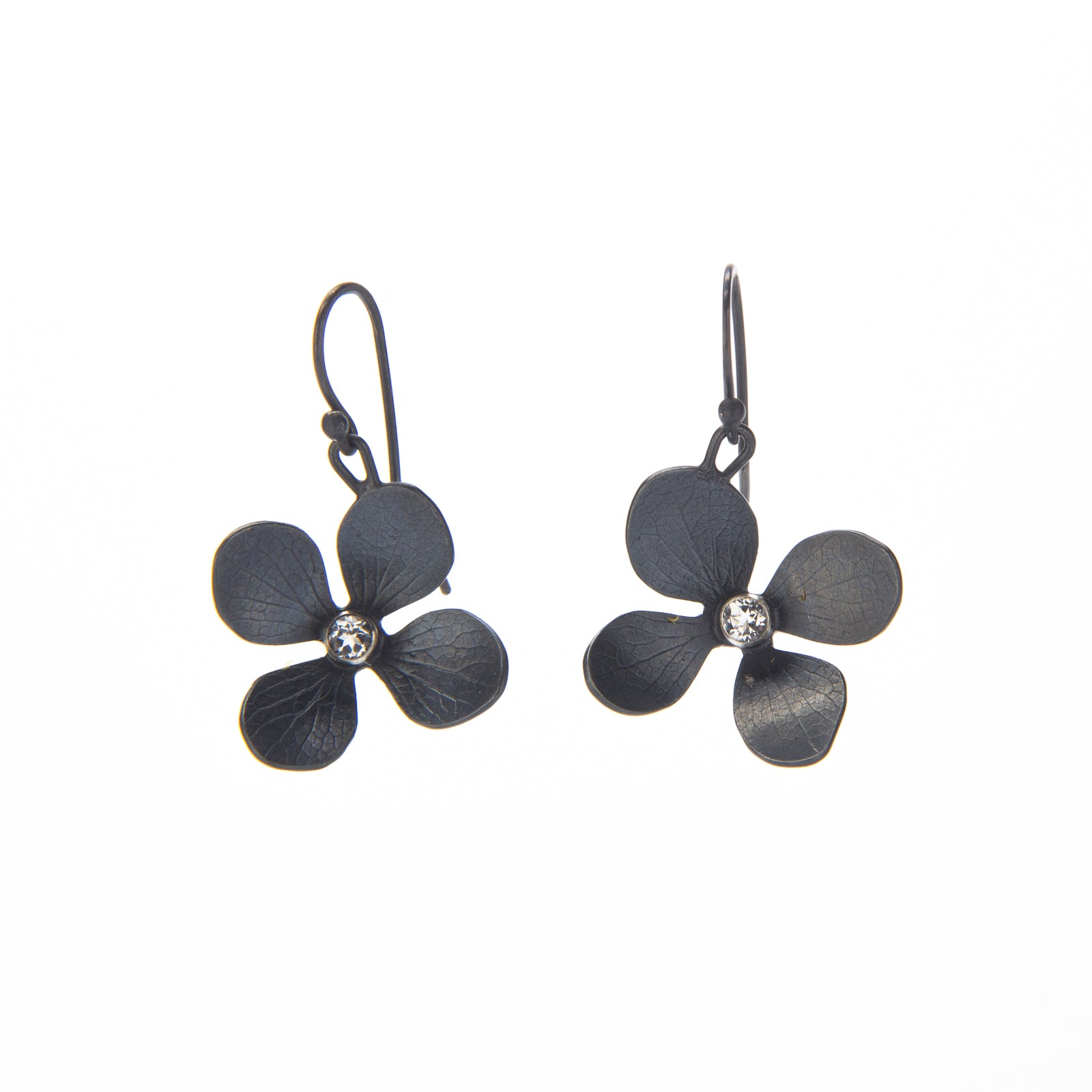 Darkly oxidized silver flower earrings embossed with the texture from an actual flower petal set with topaz in the center.