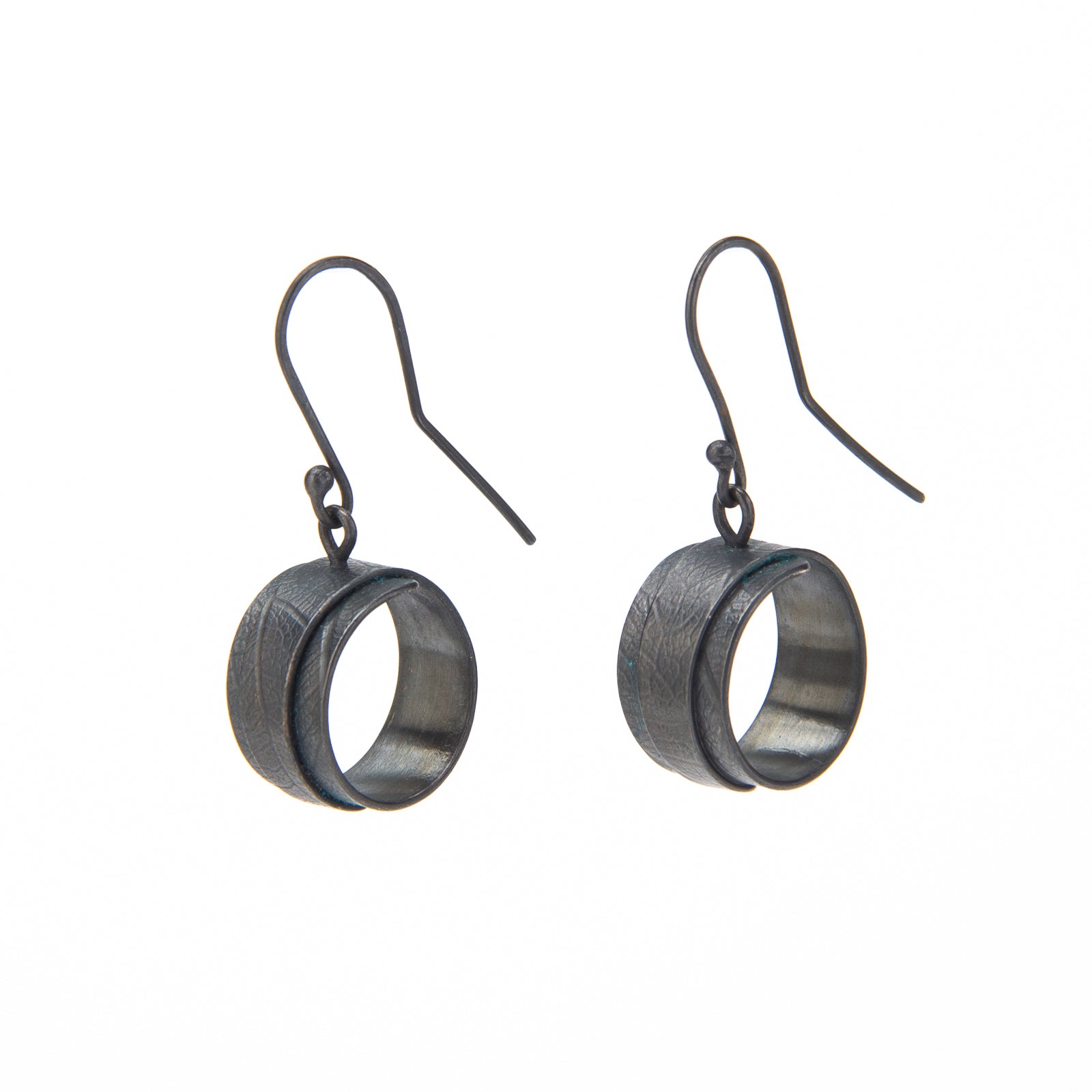 Leaf Textured hoop oxidized silver round dangle earrings with gold keum-boo and garnet details.