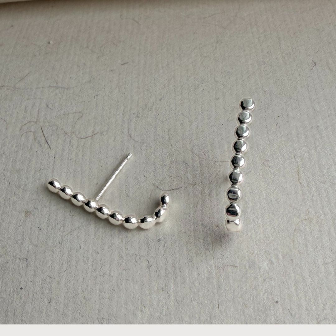 These refined bead huggies embrace the ear with quiet grace, embodying contemporary minimalism.
