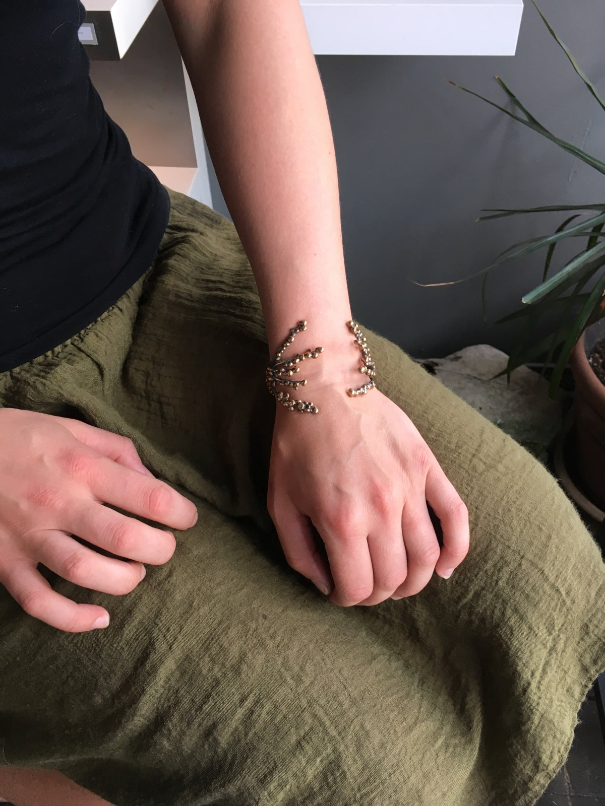 Worn in reverse of most cuff bracelets, this nature-inspired, multiple branch cuff is studded with seed-like nodules that hug the wrist for a secure fit and dramatic look.