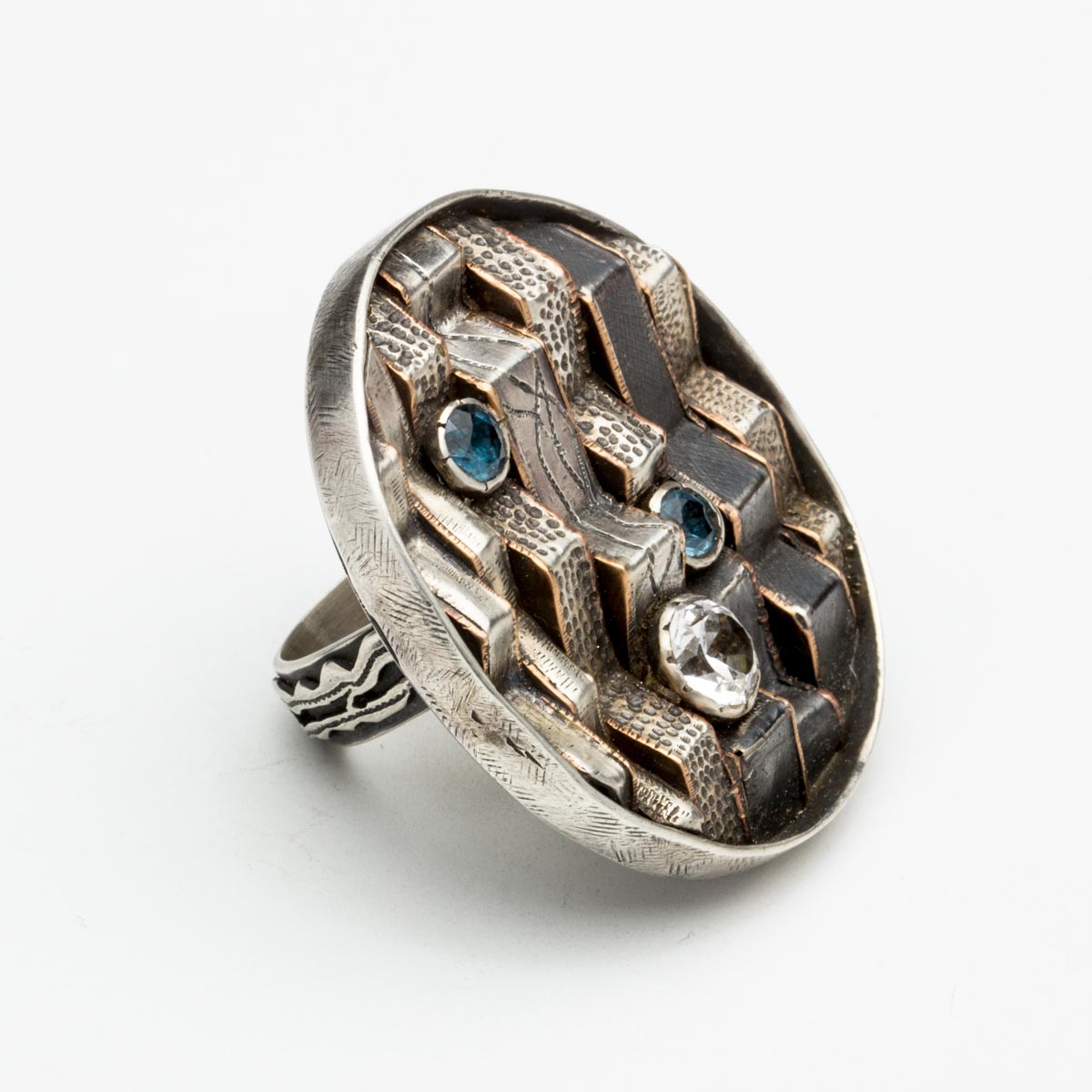 Materials: sterling silver, bronze, spinel (cut in-house), Swiss topaz (cut in-house), London blue topaz