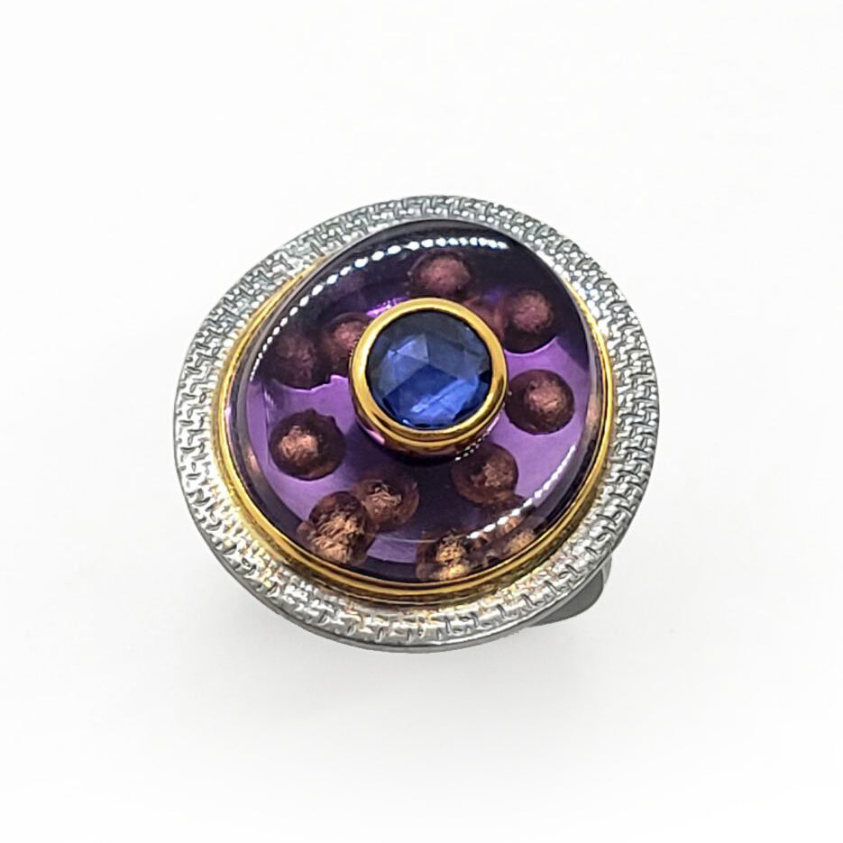 Amethyst is hand cut and carved with gold leaf applied to the carving. Rose-Cut sapphire and amethyst are set in hand fabricated 22K gold. Ring is hand fabricated out of sterling silver and 18K gold.