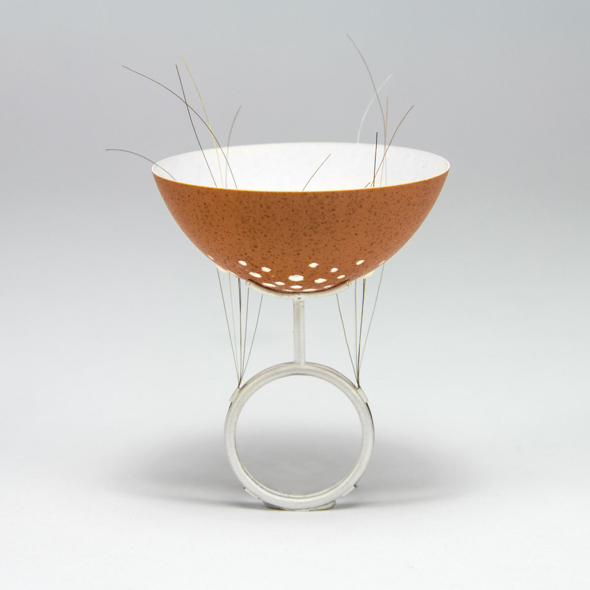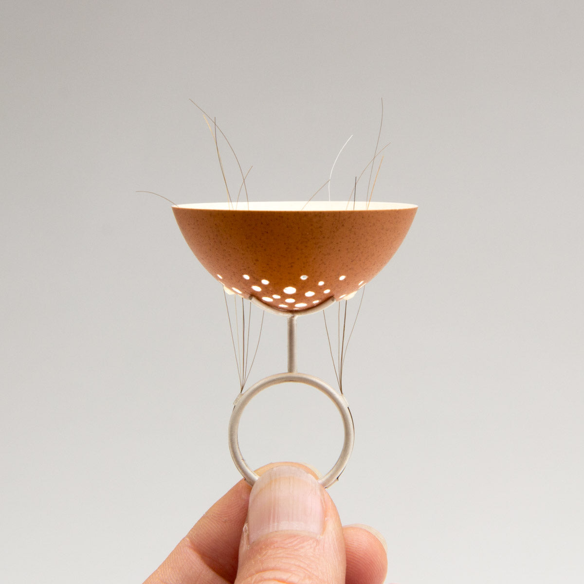 This ring is a commemoration and a reaction to the current times. Notions of fragility, the preciousness of life, organic matter, heightened awareness, loved ones, are all thoughts that cycle through as I construct this ring. The top is held by thin strands of hair pulling small pearls in tension. The ring also acts as a physical remainder requiring awareness of the hand and caution while worn.