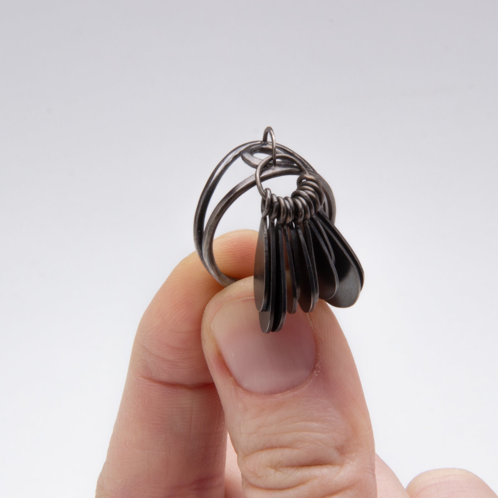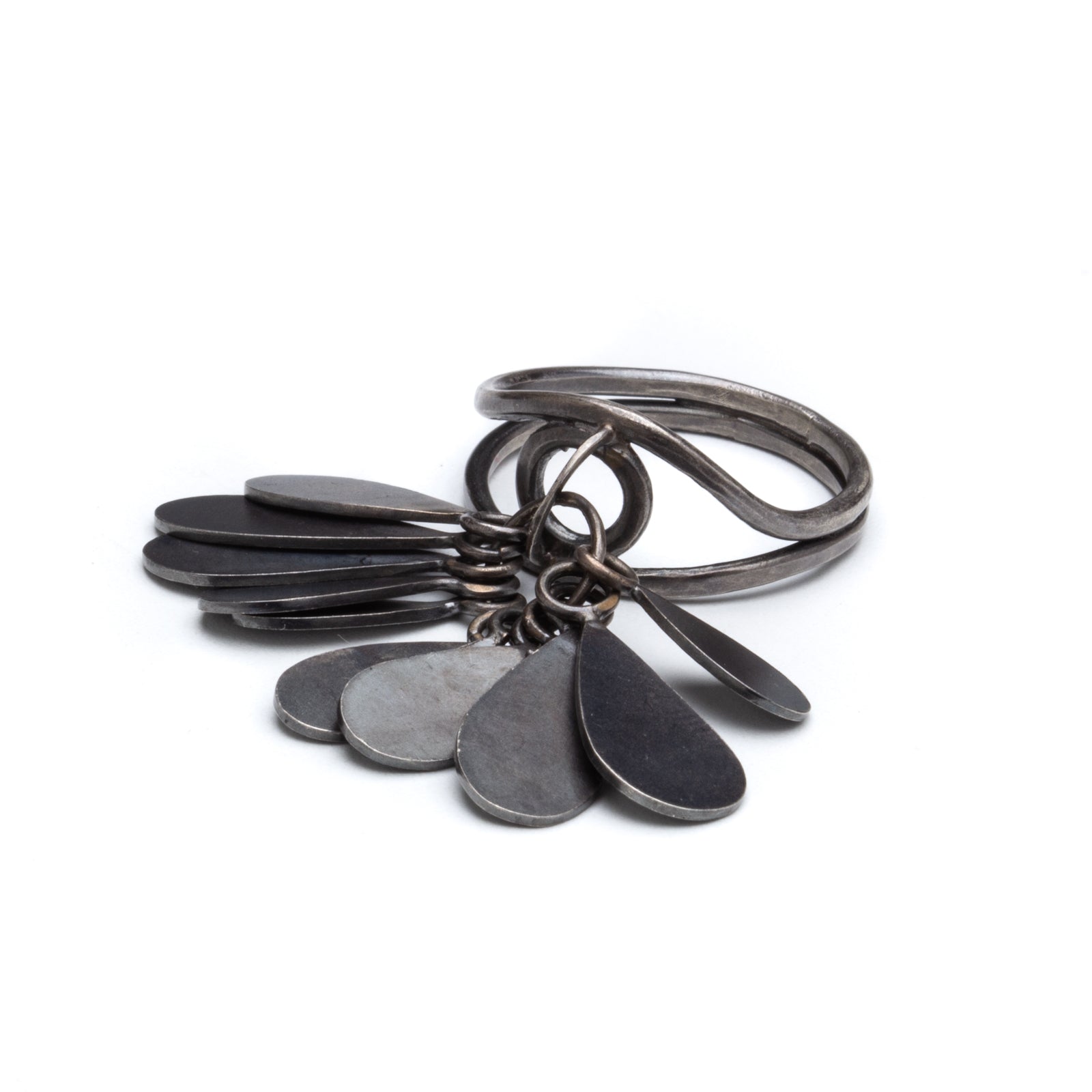 Artist Statement: I'm intrigued by Victorian mourning jewelry. I wanted to create a ring that is reminiscent of falling tears but it's tactility and movement make it irresistible to enjoy as a simple pleasure.
