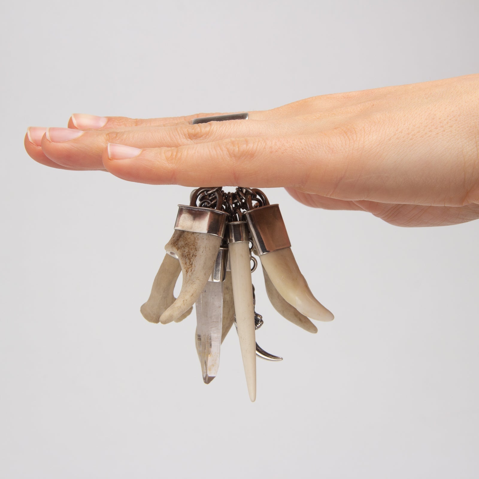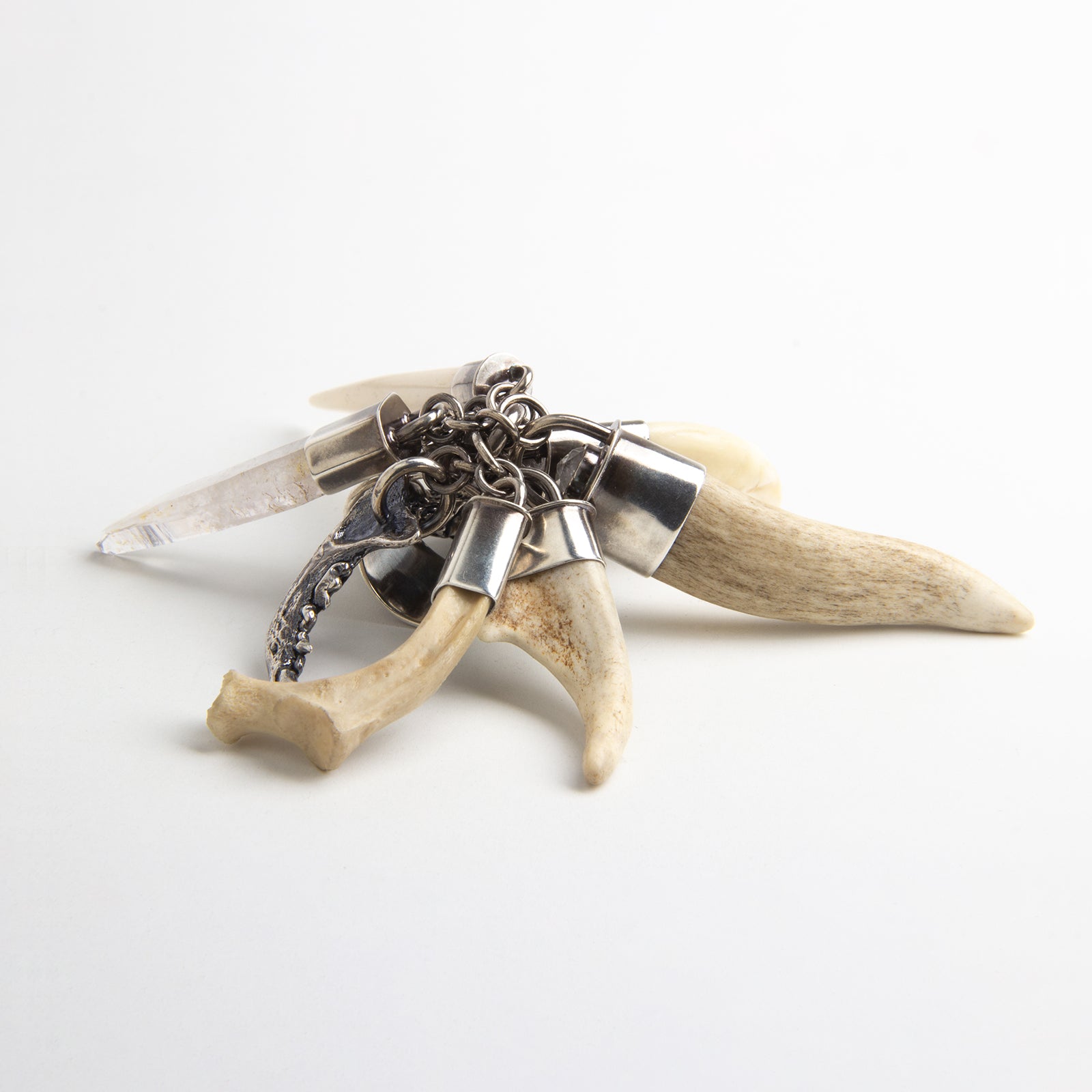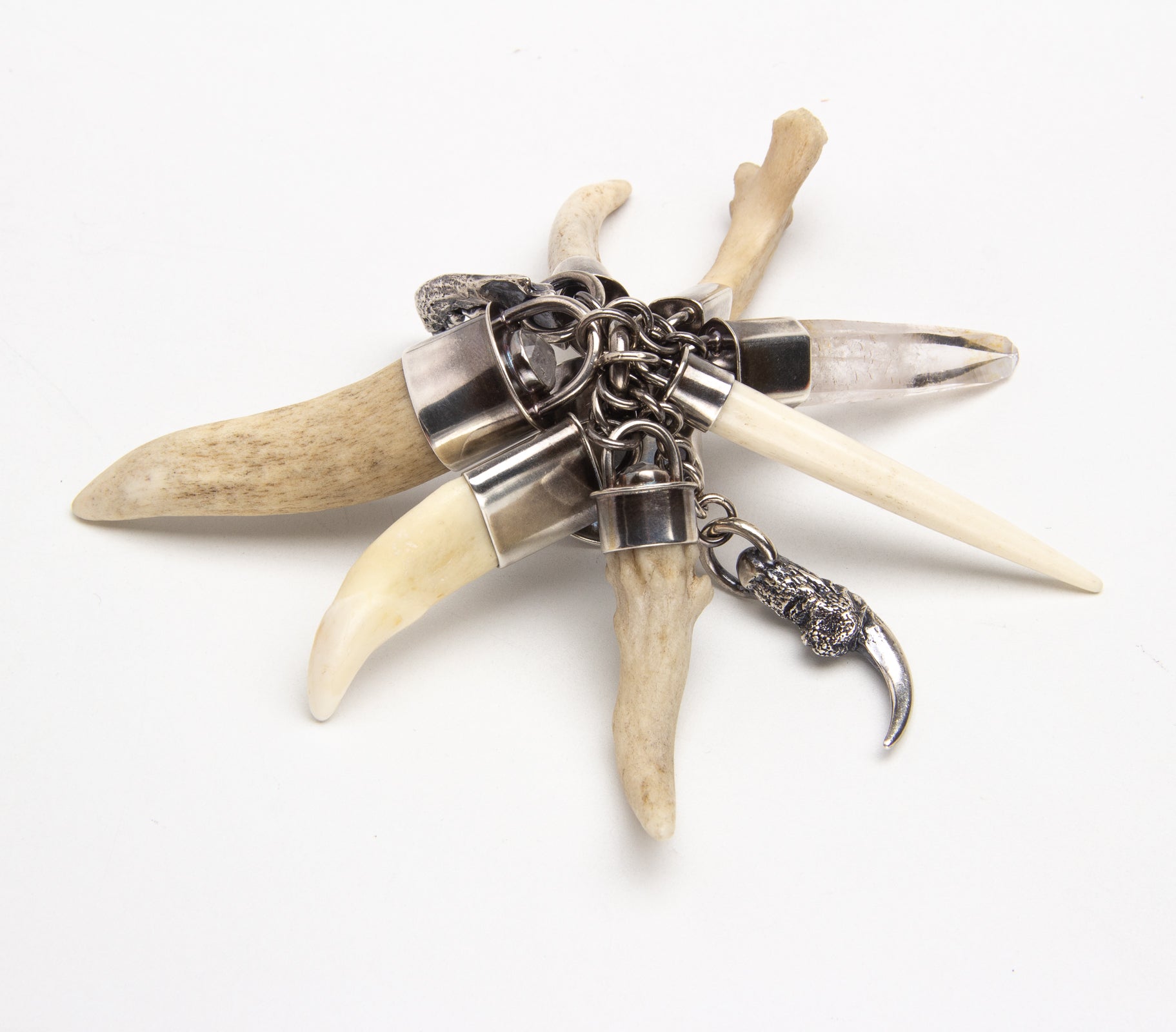 Materials: Sterling silver, antler, teeth, bone, quartz crystal, Herkimer diamond