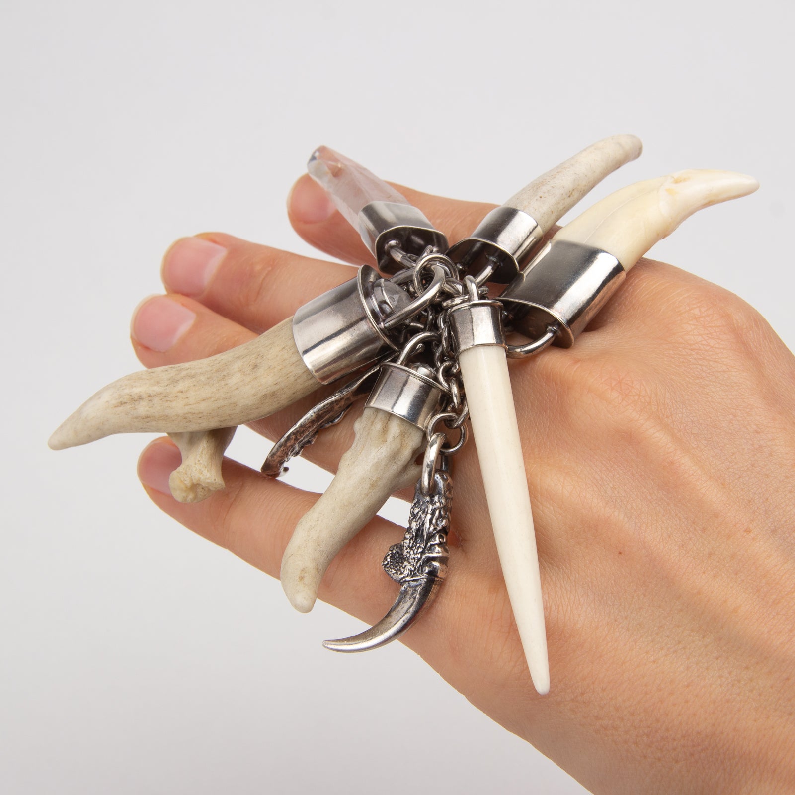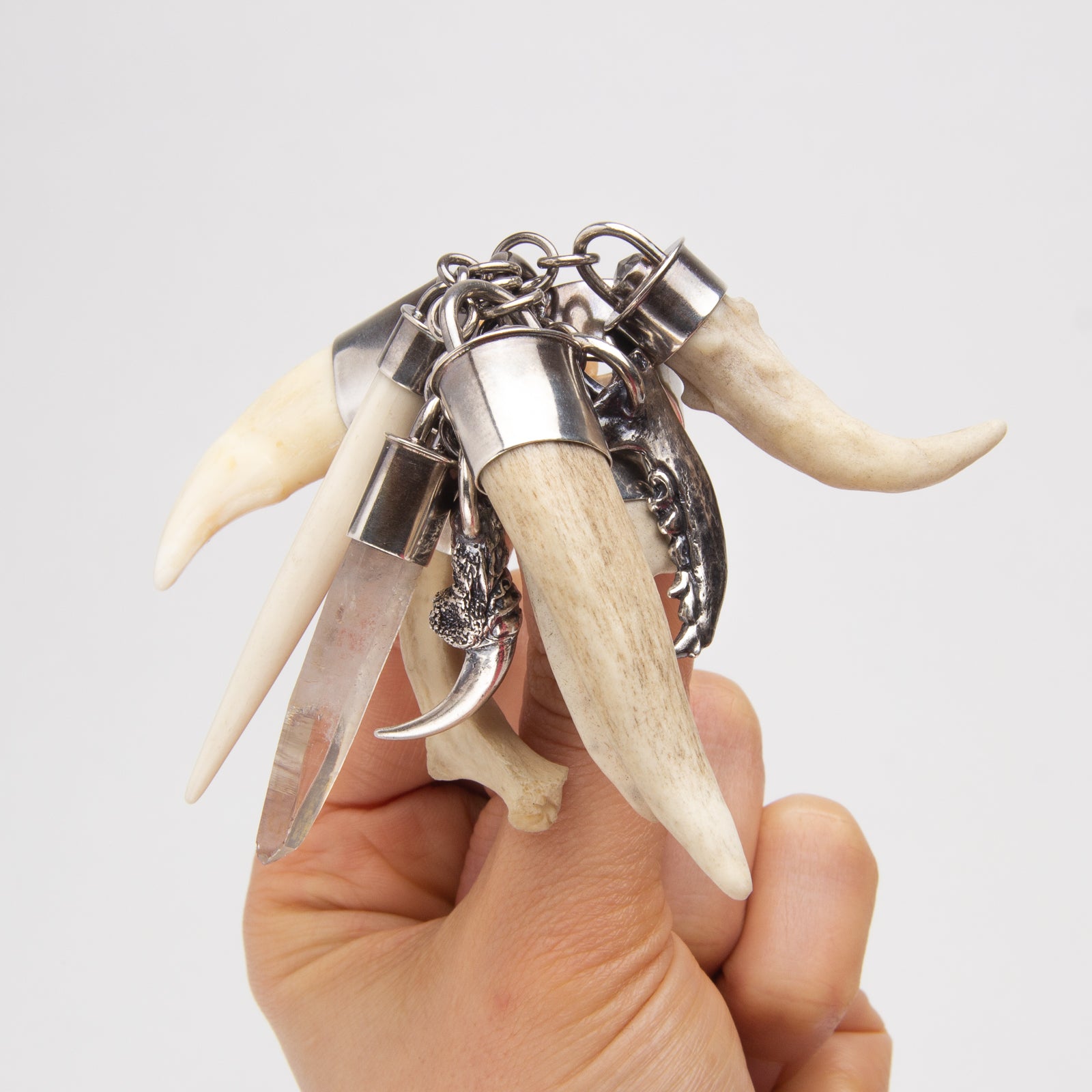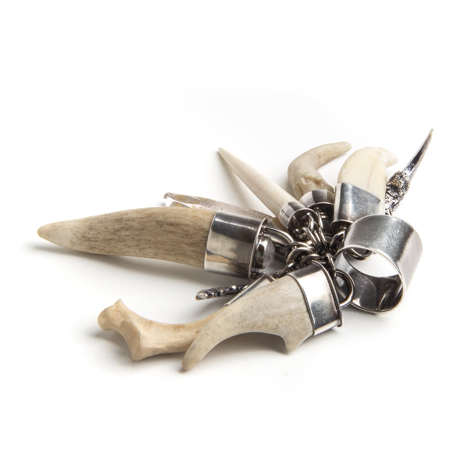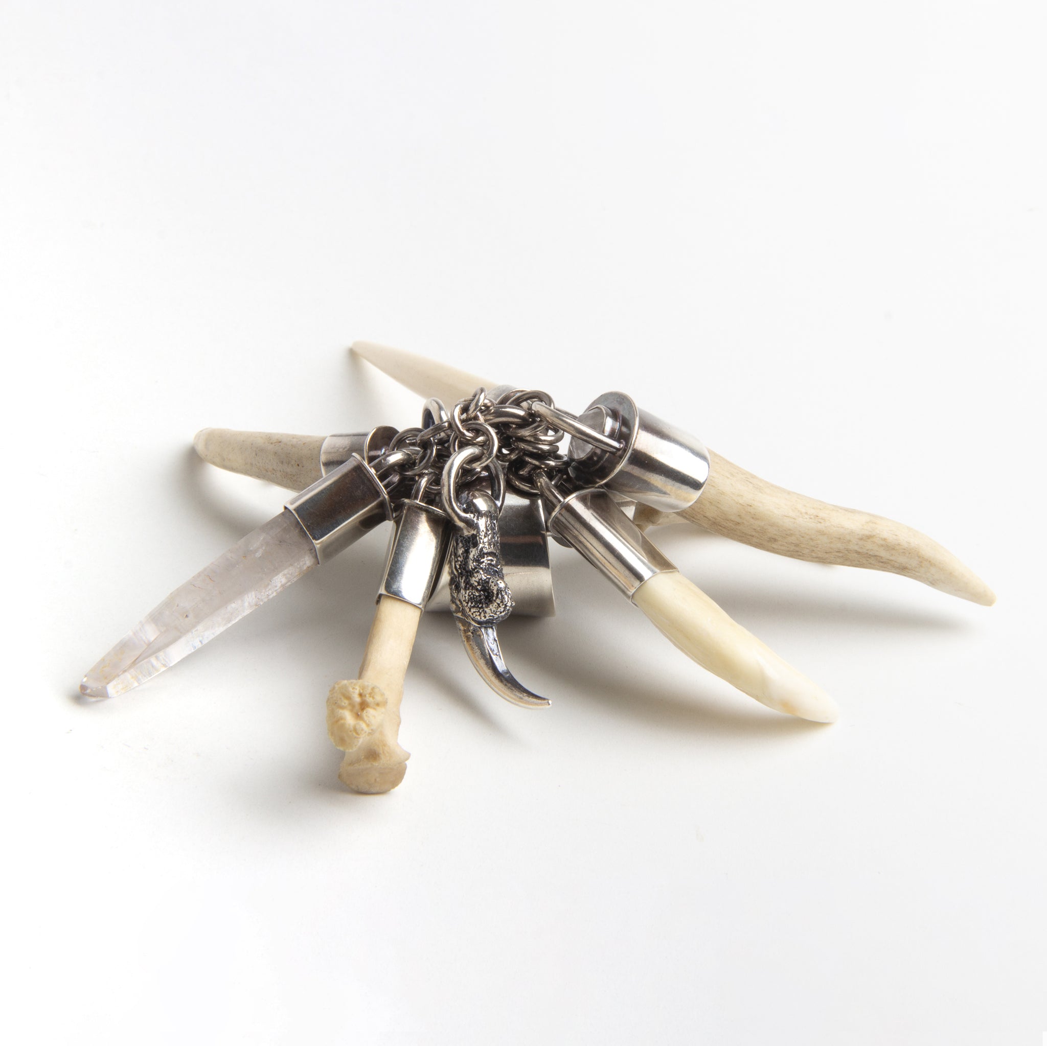 Materials: Sterling silver, antler, teeth, bone, quartz crystal, Herkimer diamond