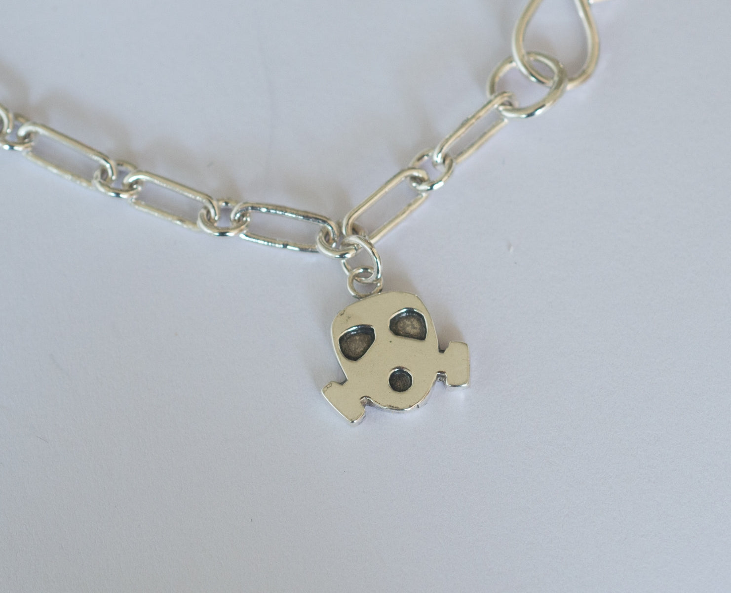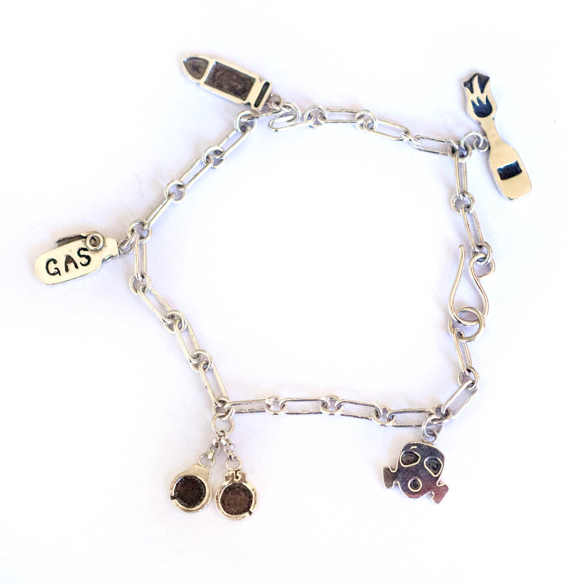 This charm bracelet is my recognition of that privilege I've squandered over the years. A Molotov cocktail, gas mask, bullet, pair of handcuffs and tear gas canister have been created entirely by hand. They're attached to a delicate, handmade silver chain. My aim was to keep the charms small and delicate, creating a juxtaposition between the heaviness of this issue and its presentation.