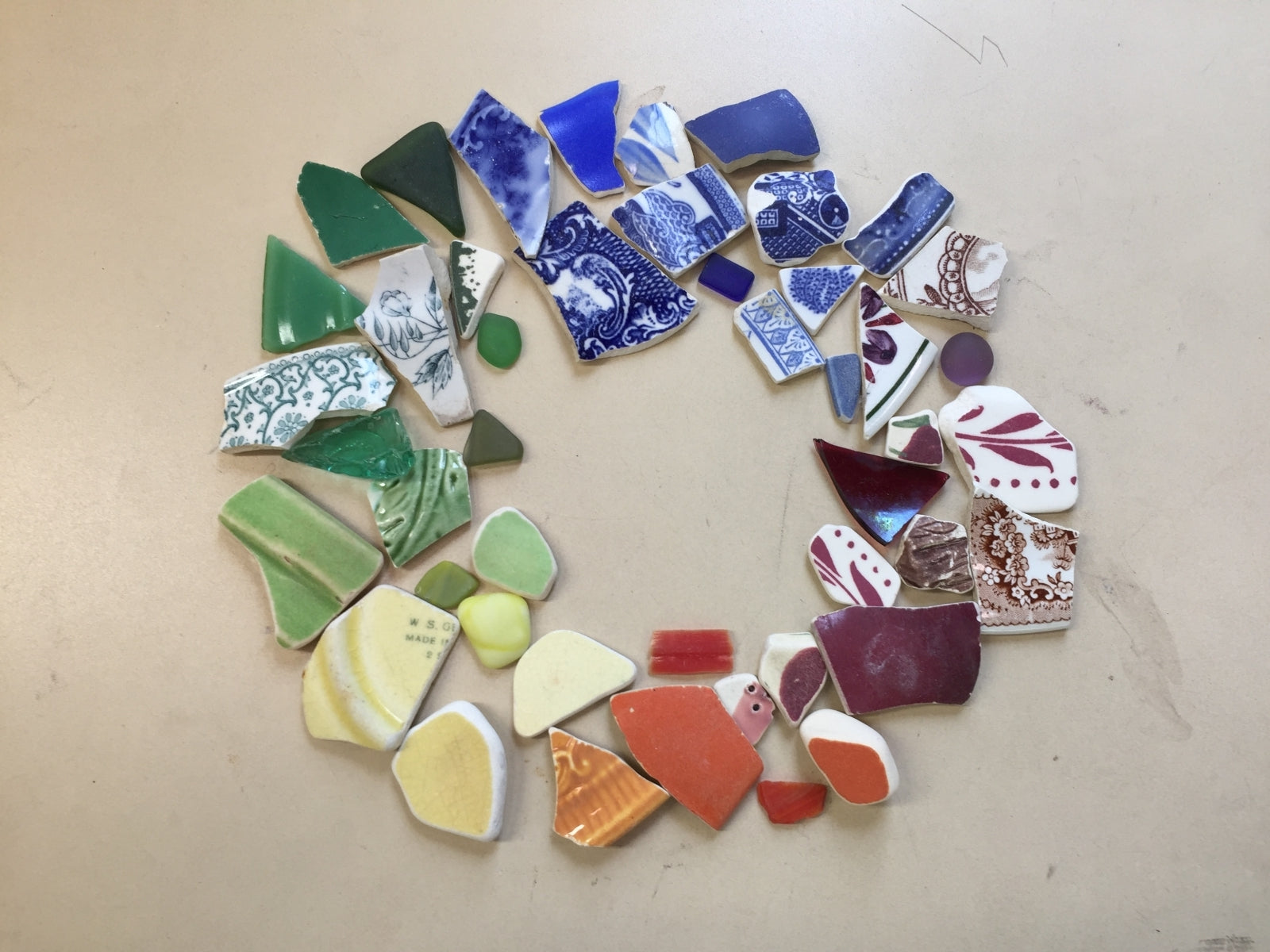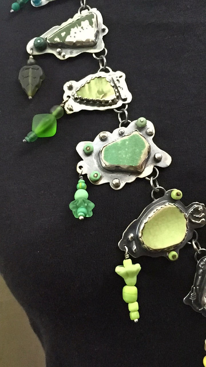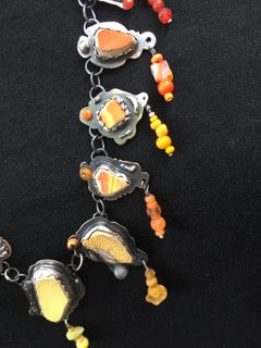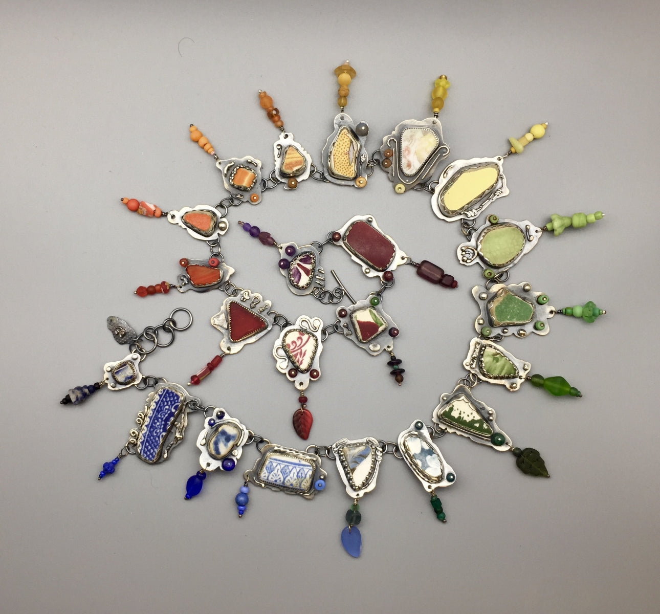 Artist Statement: Our lives changed starting in March of this year due to COVID-19. I gathered people on-line with a goal to provide a space for discussion, support our creative activities and to avoid isolation. From an assignment given in the group, I created a color wheel out of glass and ceramic pieces I have collected or been given. This arrangement of bits of color became a project I worked on while sitting at a table at the end of my driveway. I waved and chatted with people walking by as I made bezels to hold these bits of color. In isolation, we long to be together and share our thoughts. These glass and ceramic pieces came from many countries and found their way to my studio. Each piece of glass and ceramic is different as are the people who have found their way here to our country. The parts of this necklace go together to make a whole necklace as each person in this country makes a community.