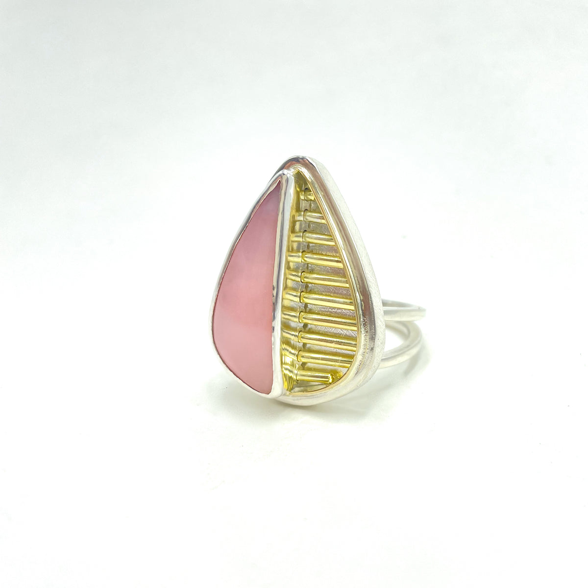 Artist Statement: This sophisticated piece of fidget jewelry is designed to be beautiful, playful and interactive. The central beauty in this sterling silver statement ring is the pink opal which conceals ten, 18k gold, sliding wires. These wires delight the observer with a visual and audible display as they slide outward in response to the wearer's natural movements. Let the wires randomly shift as you go about your day, or enjoy the look, feel and sound when needing or wanting somewhere to intentionally focus your attention. All details are thoughtfully considered, as the back even contains a design surprise with a peek-a-boo window for the wires. This provides functional access for keeping the wires clean and sliding freely for a lifetime of enjoyment.