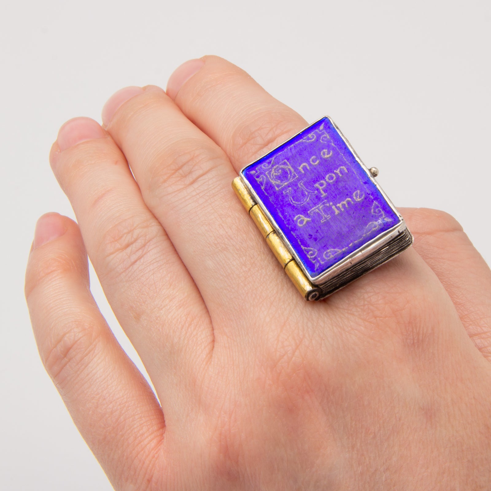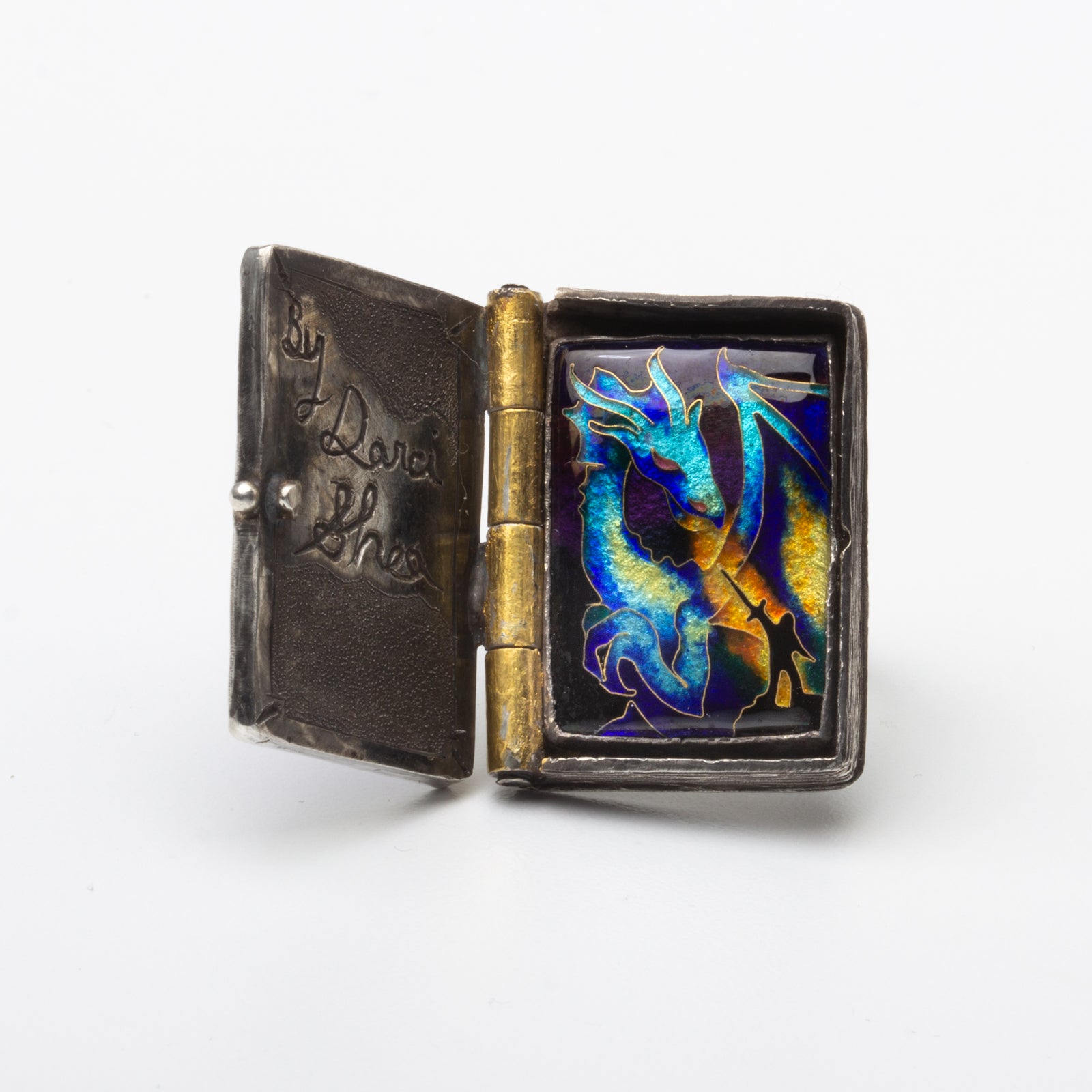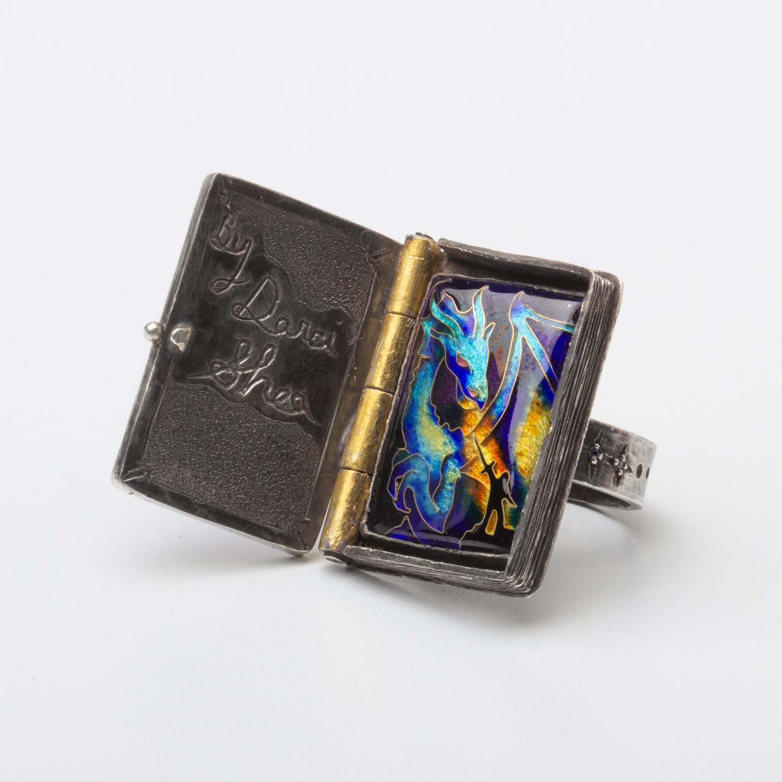 Artist Statement: Once Upon a Time is a locket ring that tells a story of epic proportion in a tiny scale. This locket is in the guise of a book reminiscent of a vintage fairytale. The cover is made using blue vitreous enamel hand-painted using gold mica and set in sterling silver. When the book is opened inside rages a battle between a fire breathing dragon and courageous knight made with 24k gold wire and transparent enamels. The inside cover is engraved with the author (Darci Shea) and the binding is garnished with keum-boo gold leaf. The ring band is a size 9 set with 1 mm CZs.
