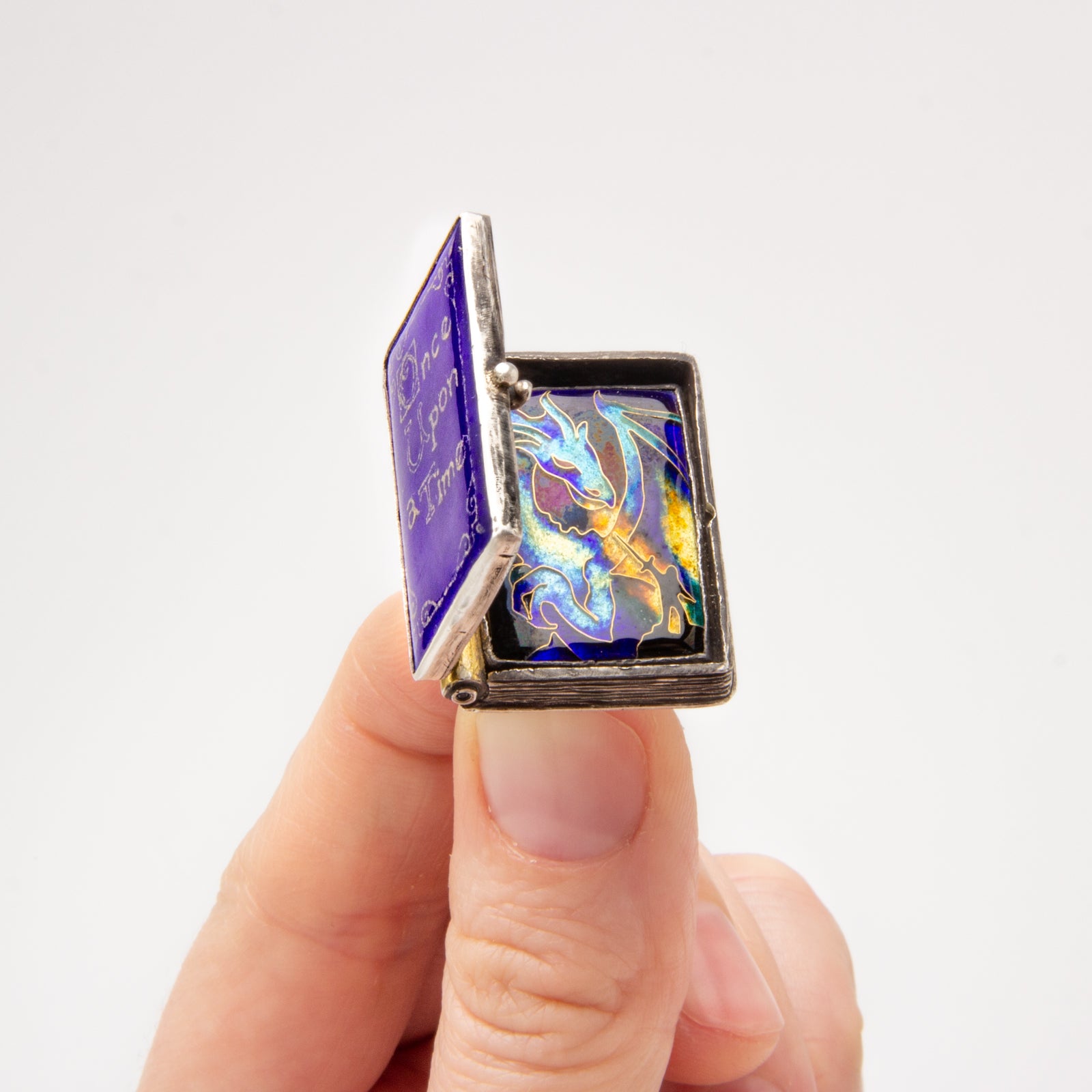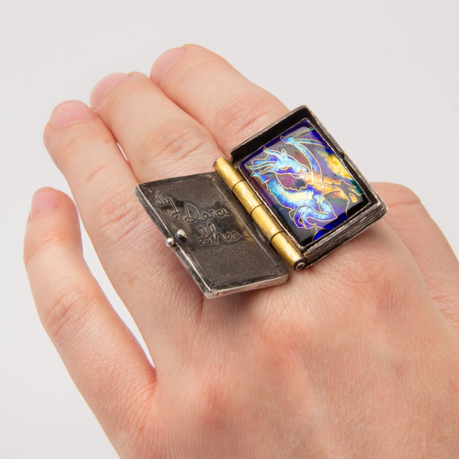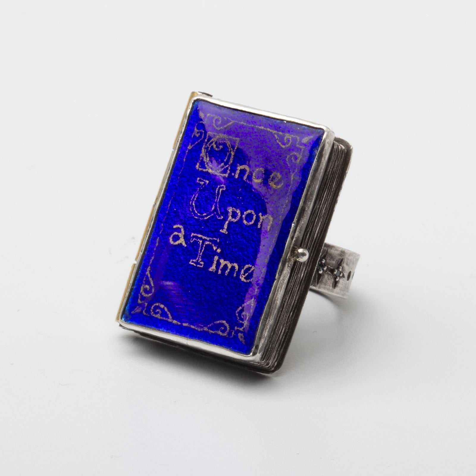 Artist Statement: Once Upon a Time is a locket ring that tells a story of epic proportion in a tiny scale. This locket is in the guise of a book reminiscent of a vintage fairytale. The cover is made using blue vitreous enamel hand-painted using gold mica and set in sterling silver. When the book is opened inside rages a battle between a fire breathing dragon and courageous knight made with 24k gold wire and transparent enamels. The inside cover is engraved with the author (Darci Shea) and the binding is garnished with keum-boo gold leaf. The ring band is a size 9 set with 1 mm CZs.