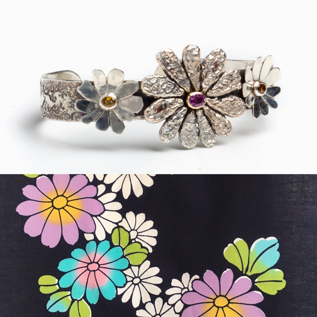 Artist Statement: I have been experimenting with casting small shapes in charcoal out of recycled metals, and when I saw the fabric, I knew I wanted to try to create a flower with this method. Each petal of the central flower was cast individually out of shibuichi (an alloy of silver and copper). I enjoyed making this piece as a literal representation of the fabric. The cuff was made by fusing silver shavings and dust onto a hand forged band. The central sapphire's bezel was rolled from 14kt gold as a small accent to compliment the color of the stone.