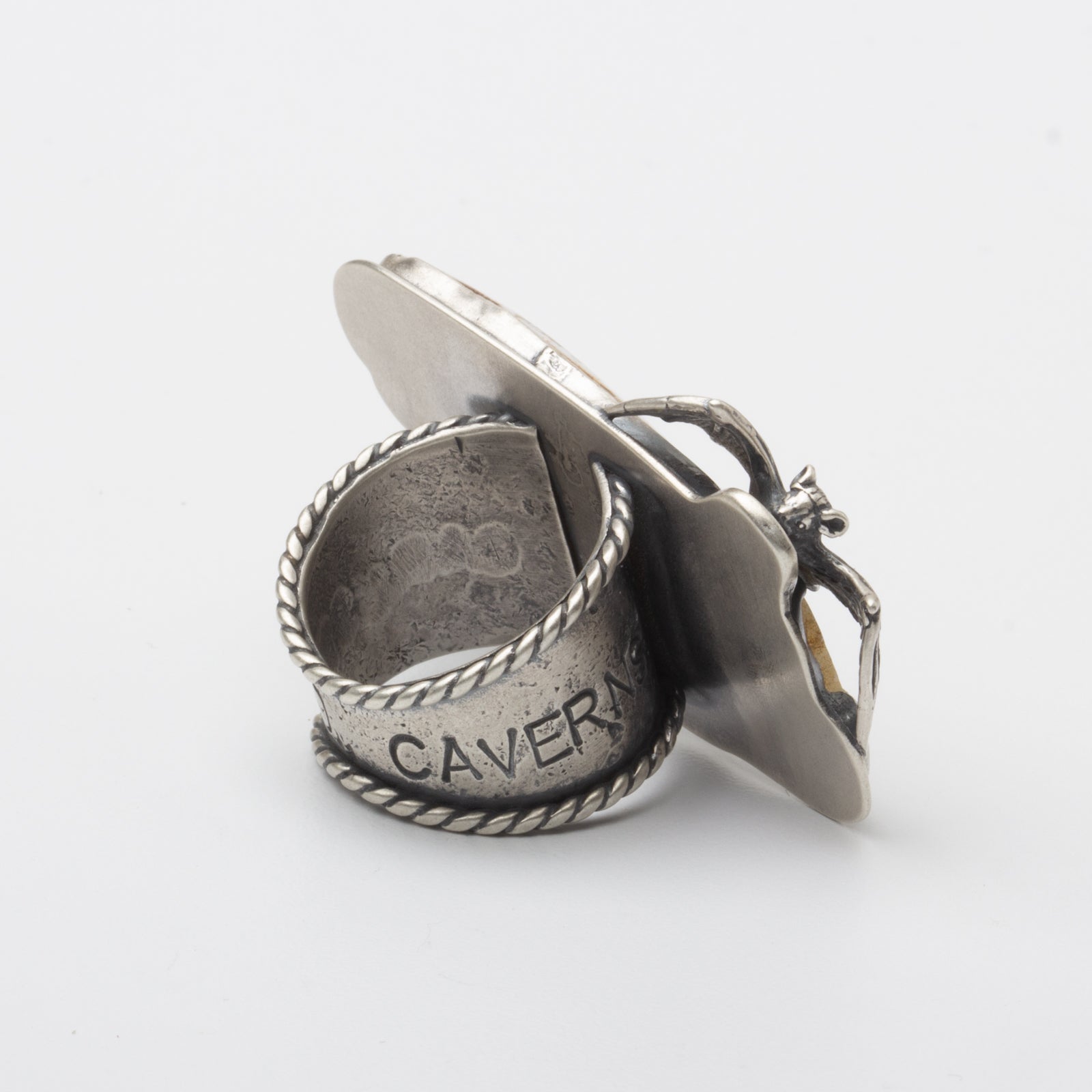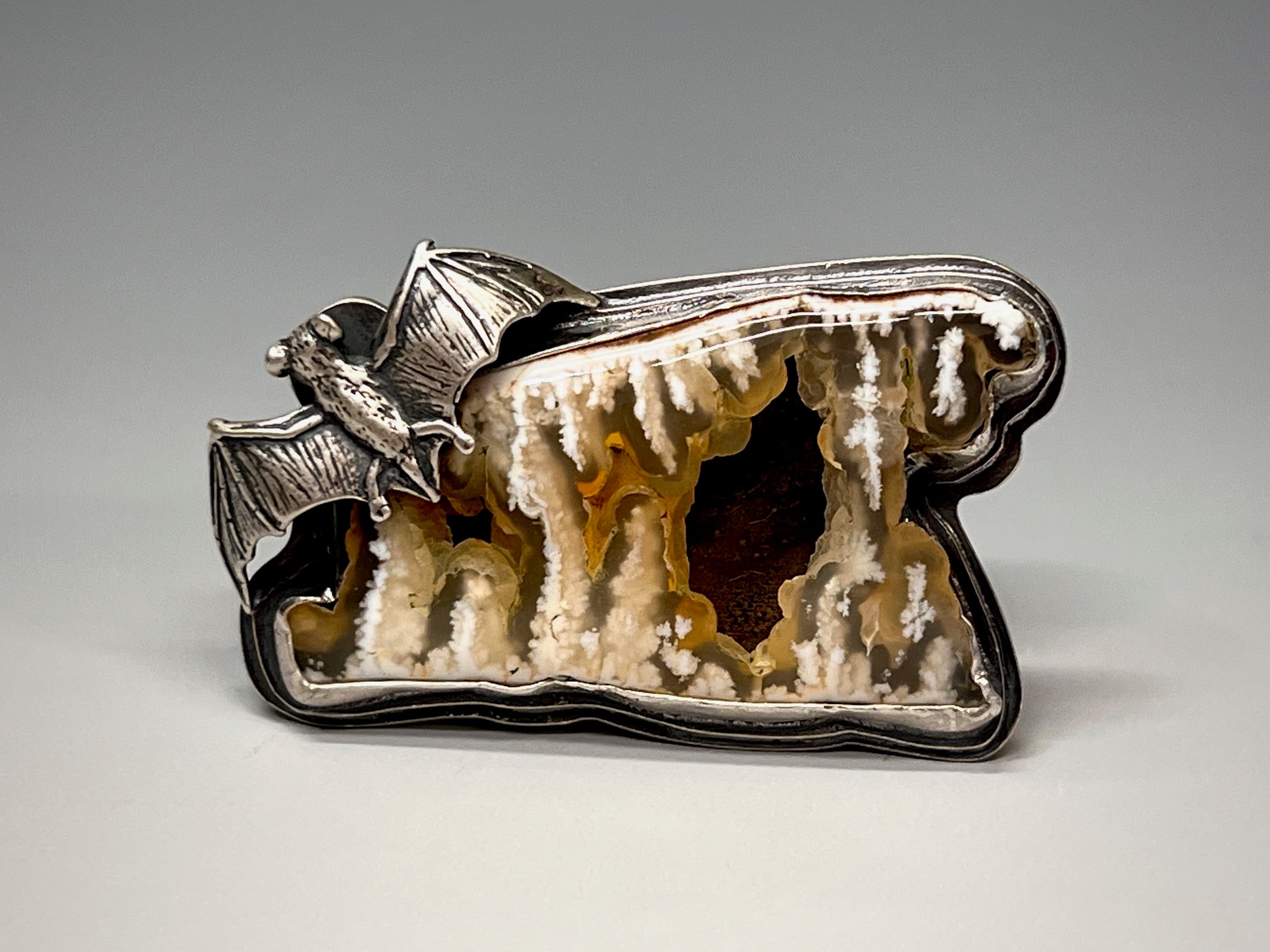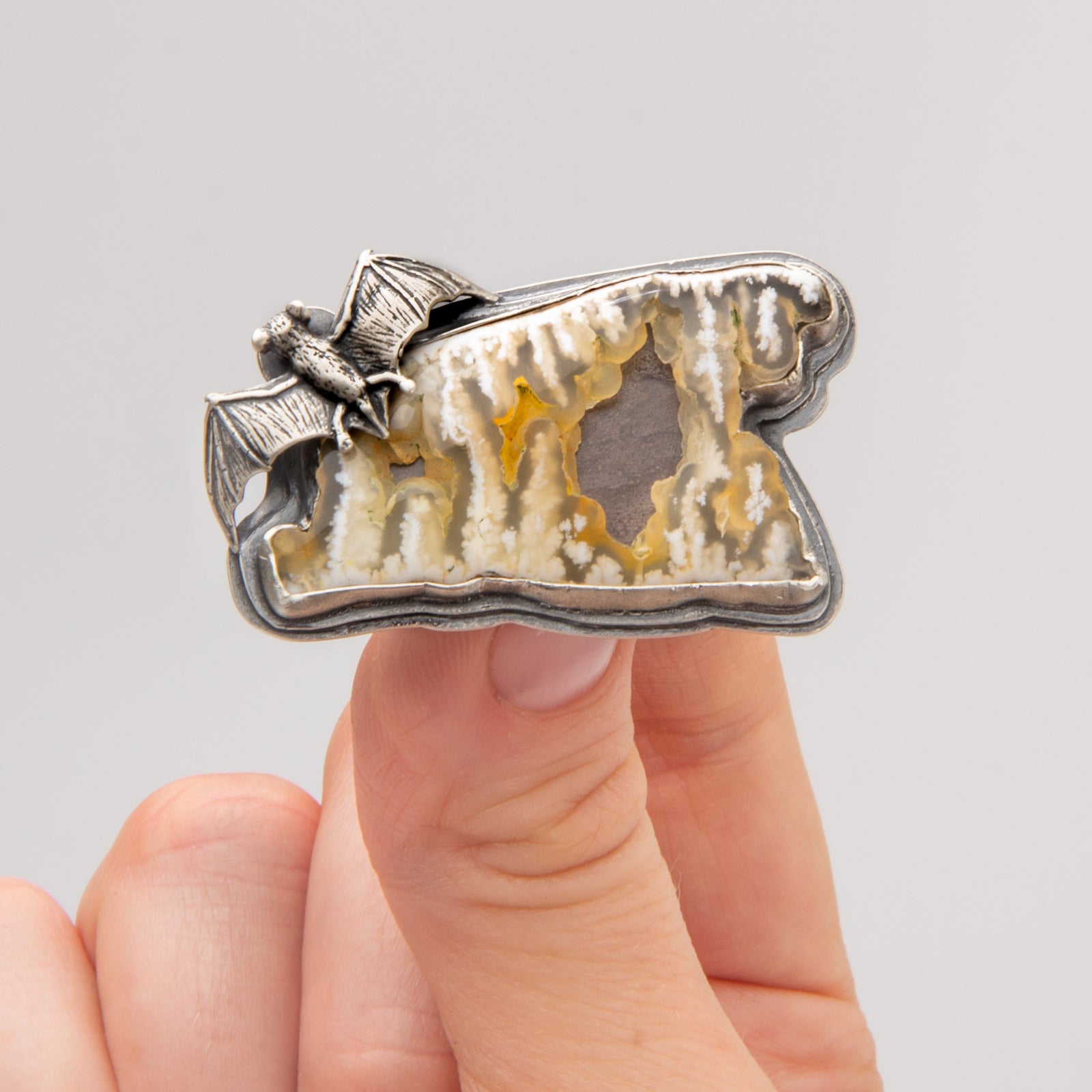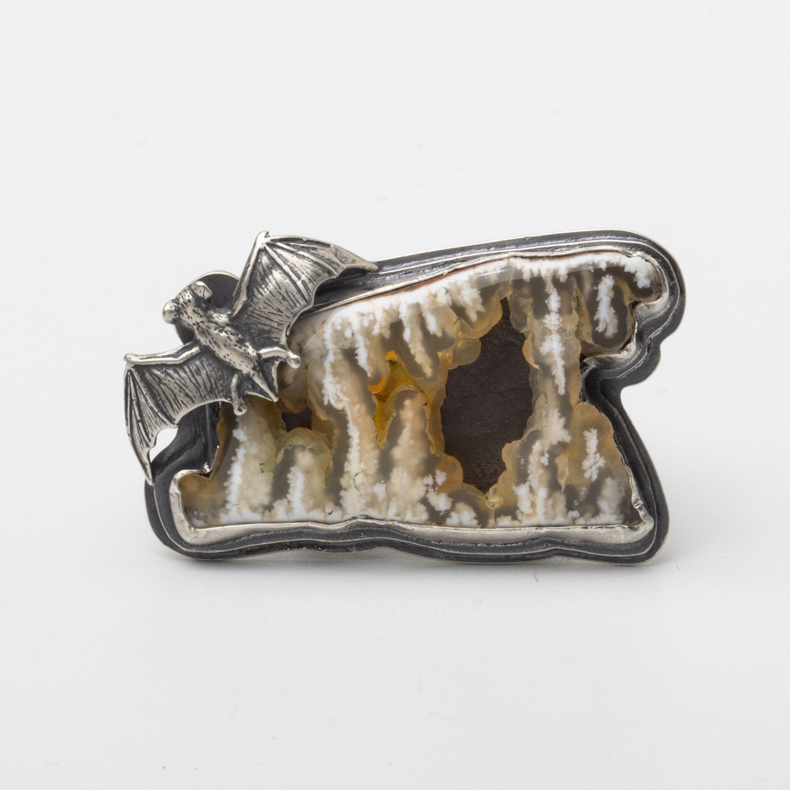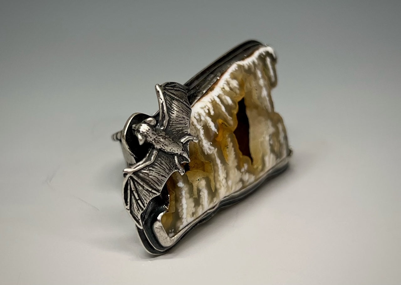 Artist Statement: Take a trip to the Carlsbad Caverns with the banger of a ring. The white plume agate perfectly mimics the stalagmites and stalactites of the caves. This particular cave is located in the southeastern part of New Mexico and is known for Brazilian free-tailed bats that emerge from Cavern each evening in search of food during the summer months. This ring features a sterling silver cast bat that is taking flight out of the cave. This ring also features a hand formed thick band (size 9) with a hammered texture and rope detail and stamped words "Carlsbad Caverns". It has an oxidized matte finish on the metal and a high shine polish for the agate that features matte inclusions.