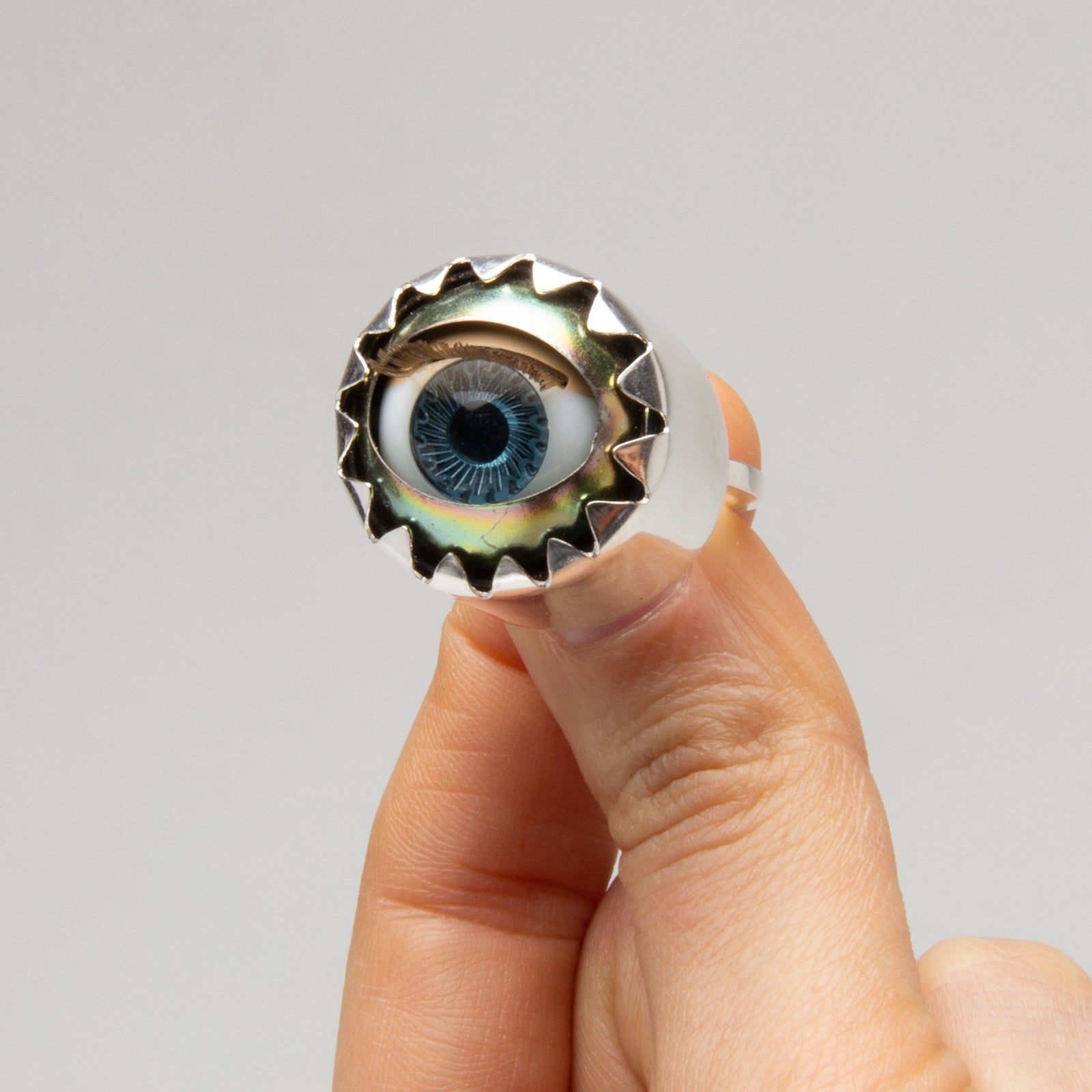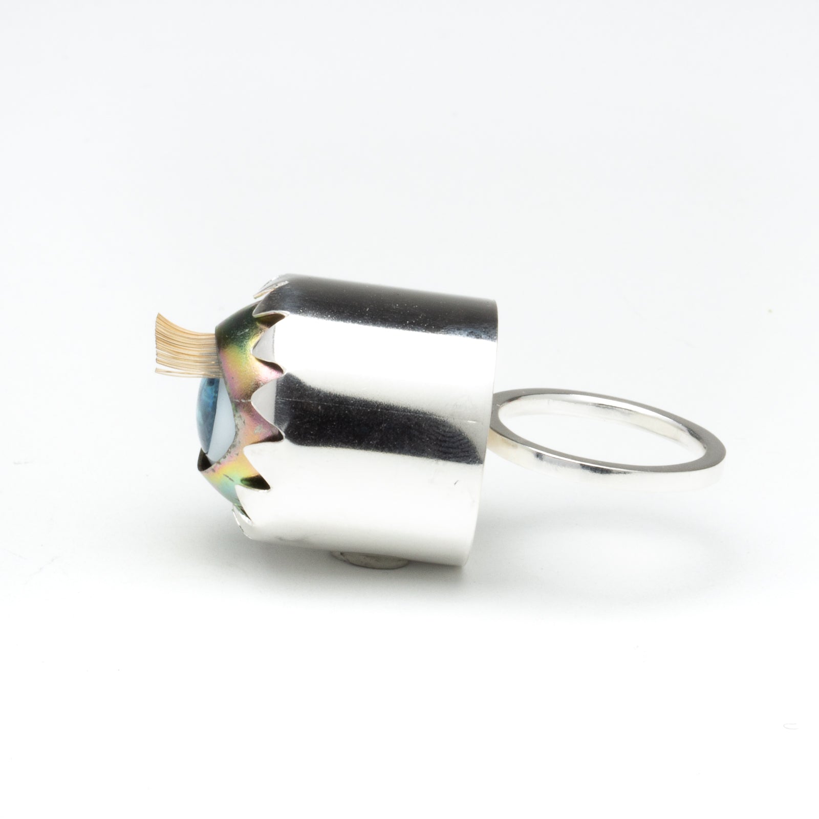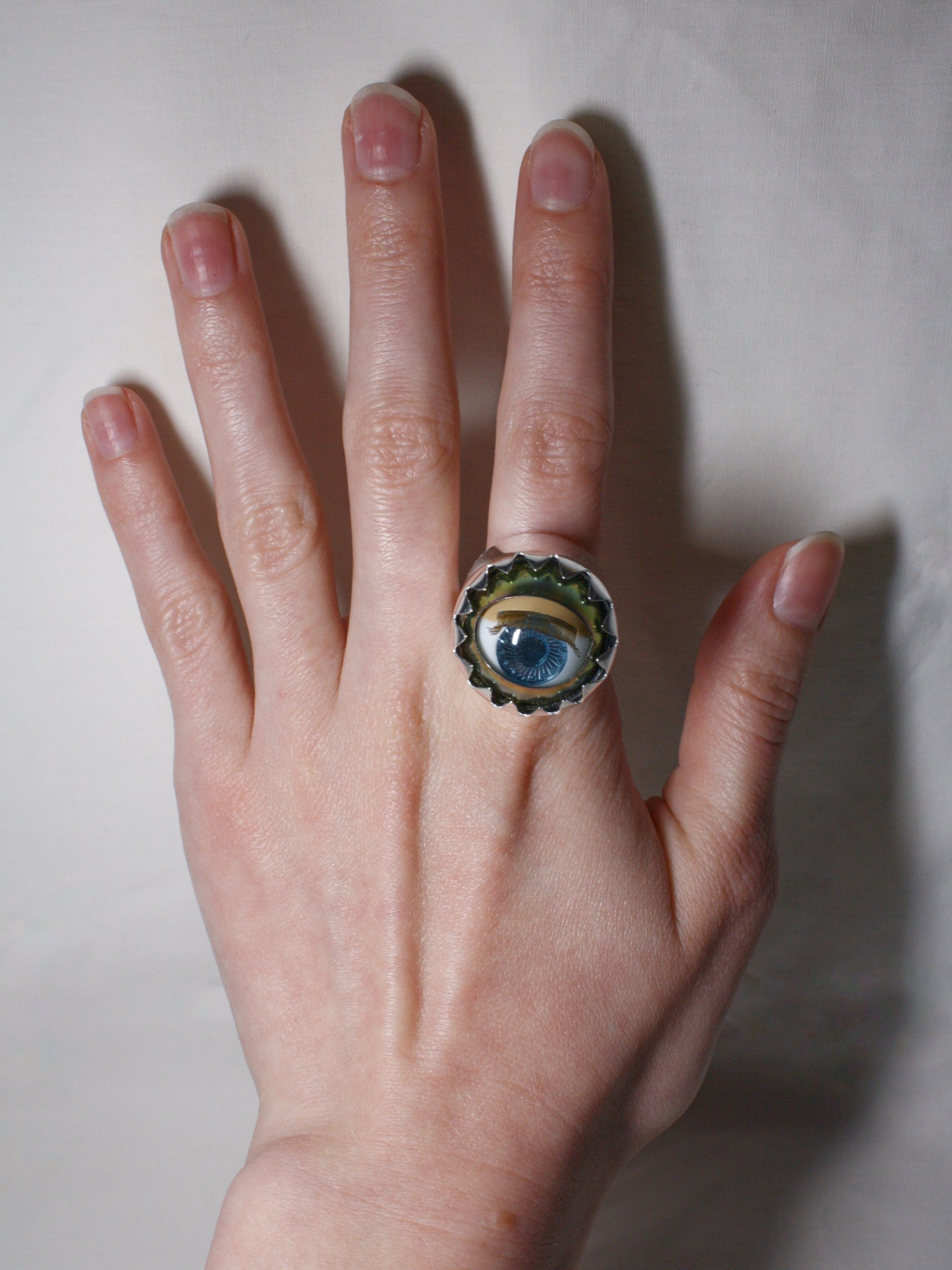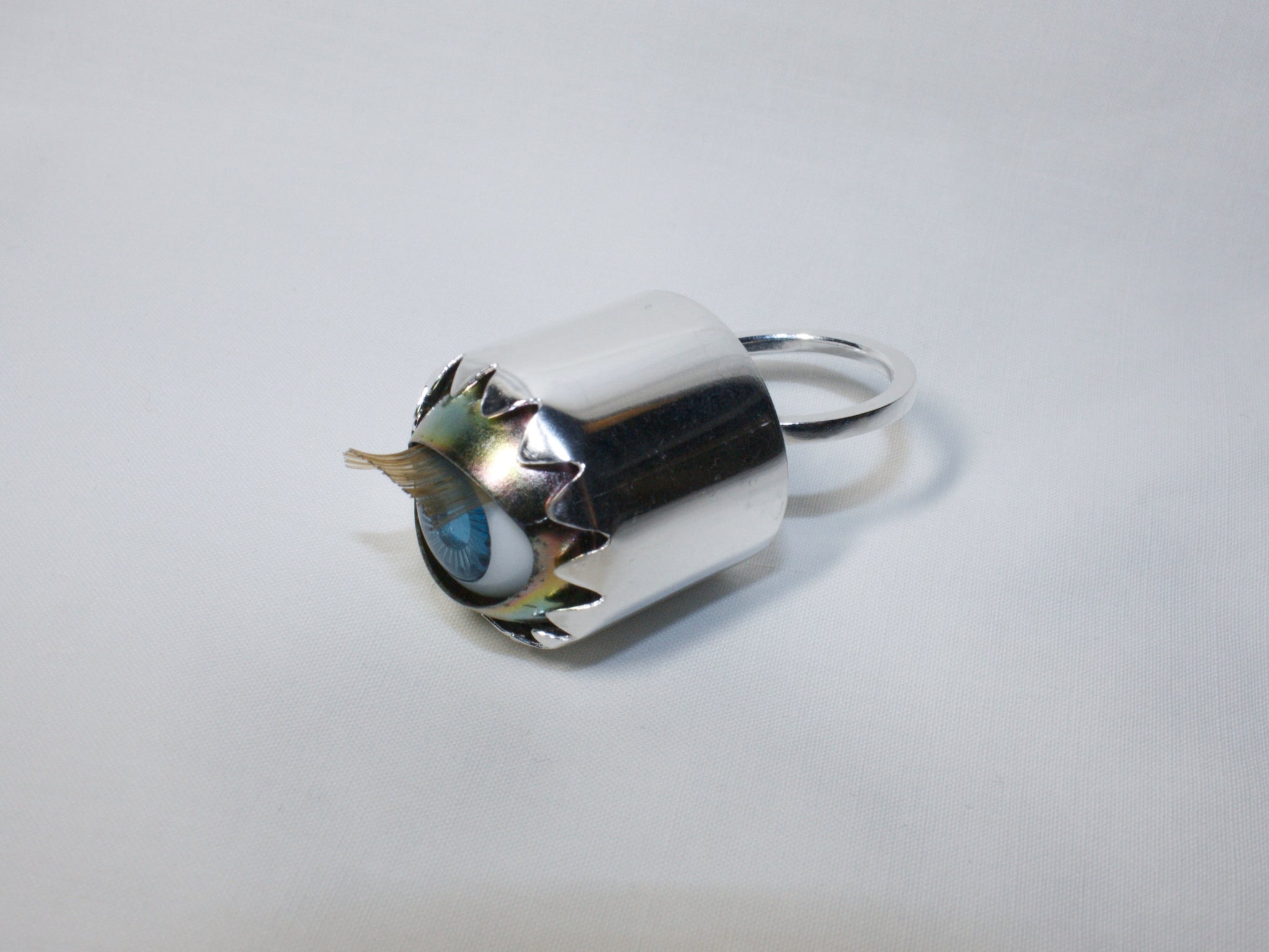 Artist Statement: The artist has been drawn to the slightly creepy, yet whimsical, for as long as they can remember. They have brought this inclination into their work and this piece is no exception. Although some may find it disturbing, this ring is meant to be a silly and amusing piece. With a desire to make art that can be relatable to everyone, not just the elite of society, this piece is made using the eye from a discarded baby doll. The isolation of the blinking eye on the finger creates a slightly unnerving yet whimsical fashion accessory.
