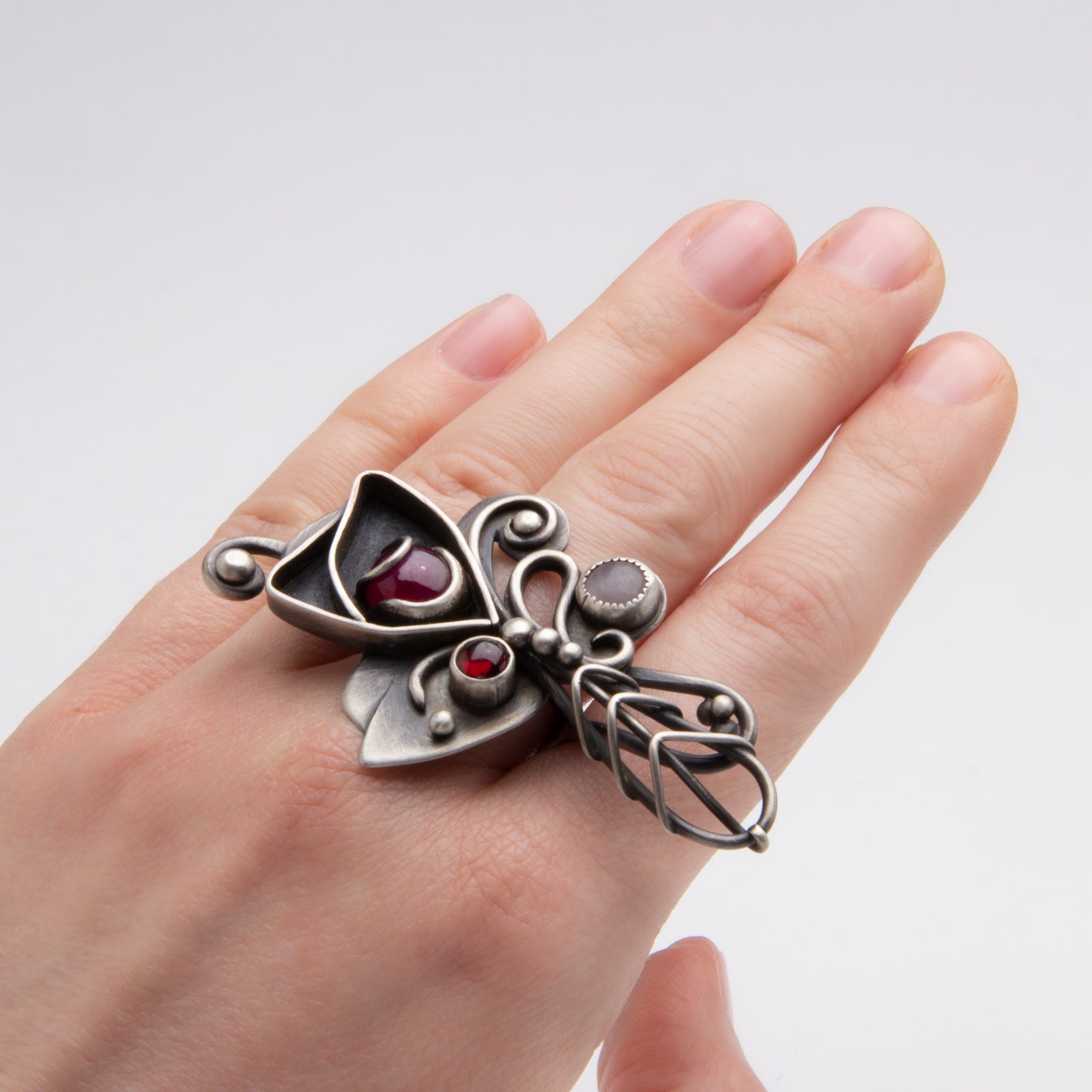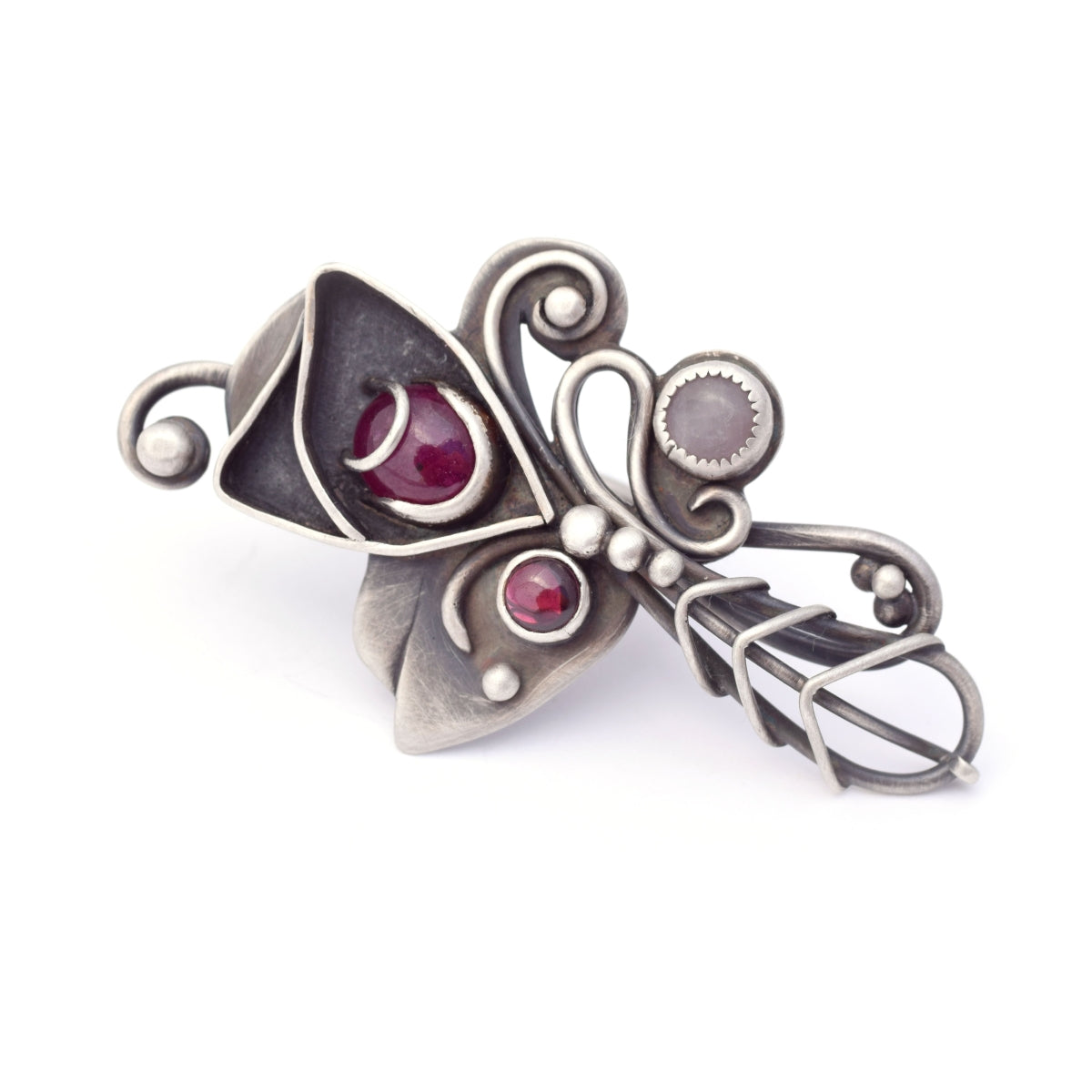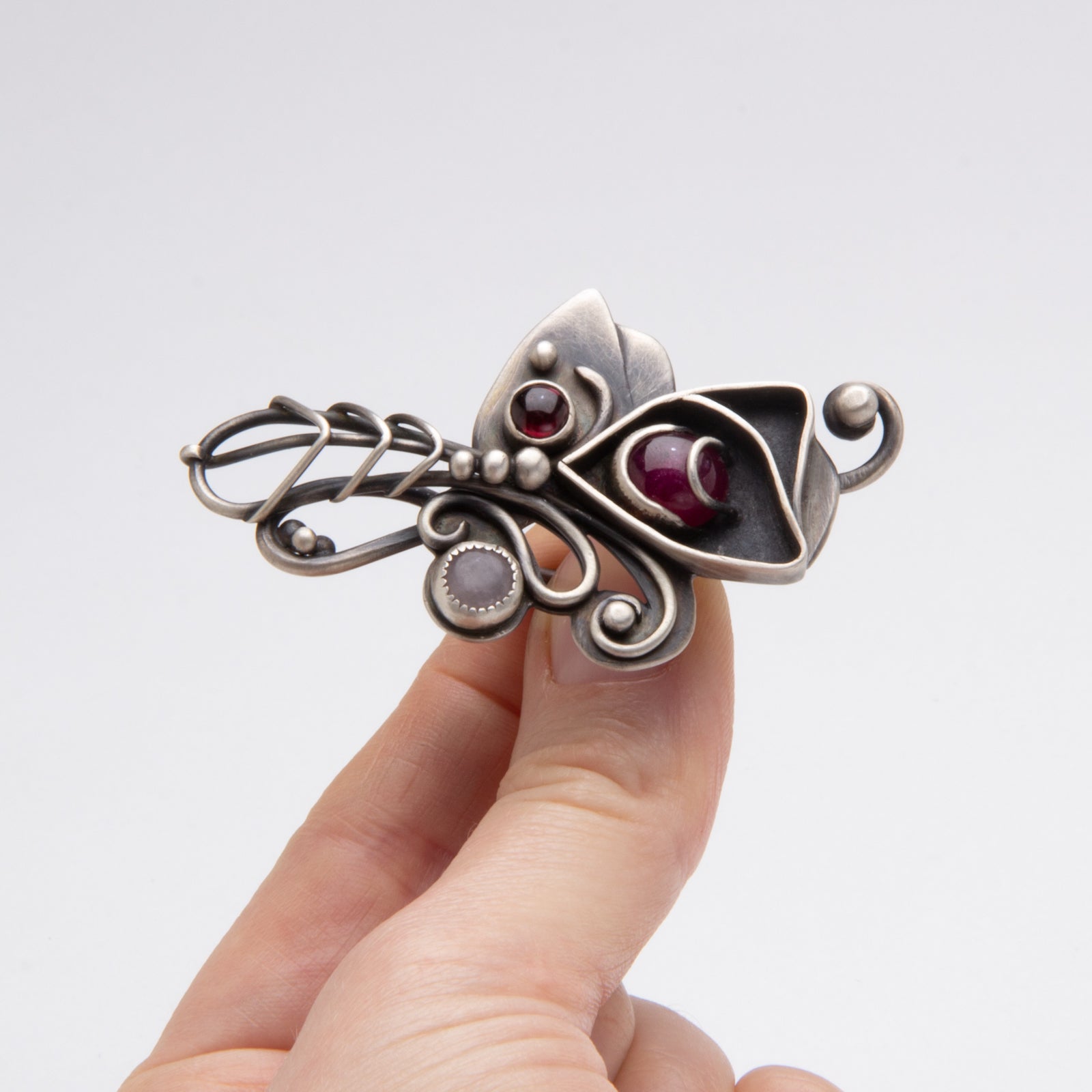 Materials: sterling silver, ruby, rose quartz, garnet