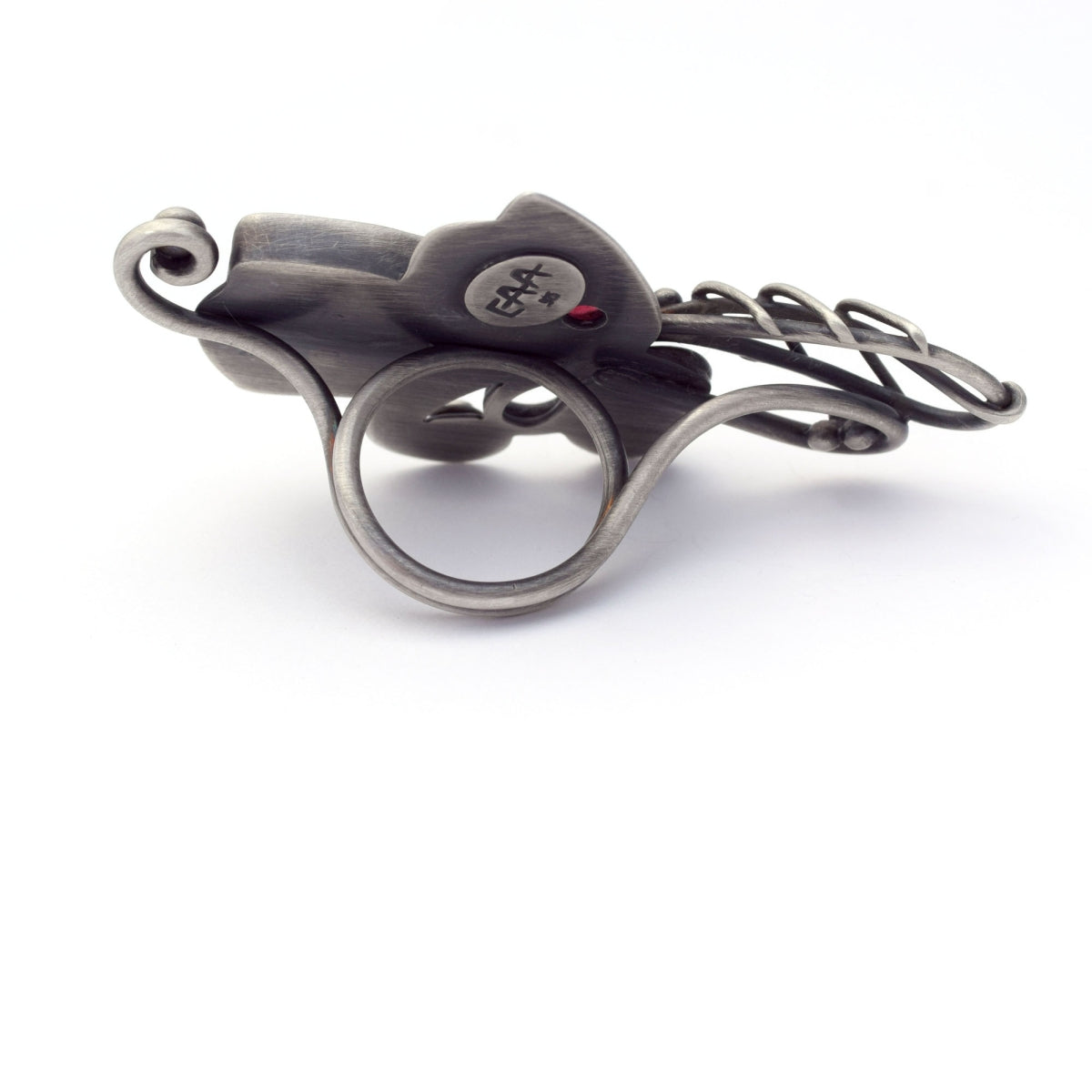 Artist Statement: This ring was a coming together of previously explored ideas and techniques into one piece bursting with life. Creating this ring was a growing experience for me both technically and aesthetically. Undulating sterling silver wire meets floral silhouettes. Elements of the band extend beyond function, wrapping their way into the visible bouquet. Ruby, garnet, and rose quartz cabochons are nestled within the blackened silver with no regard for which may be perceived as more valuable. Instead, each element plays a part in holding, supporting, or connecting the others just as we might find flora interacting in the natural world.