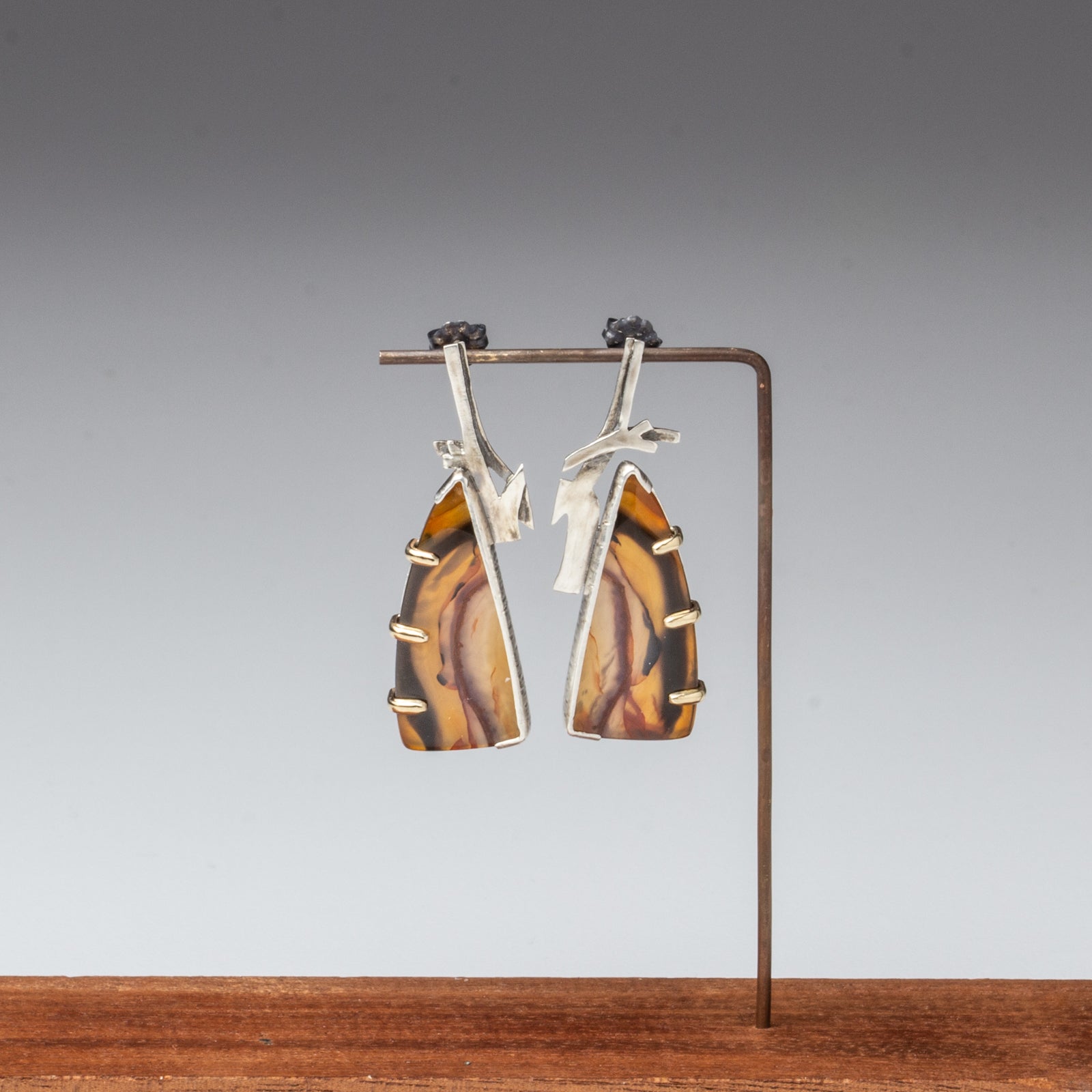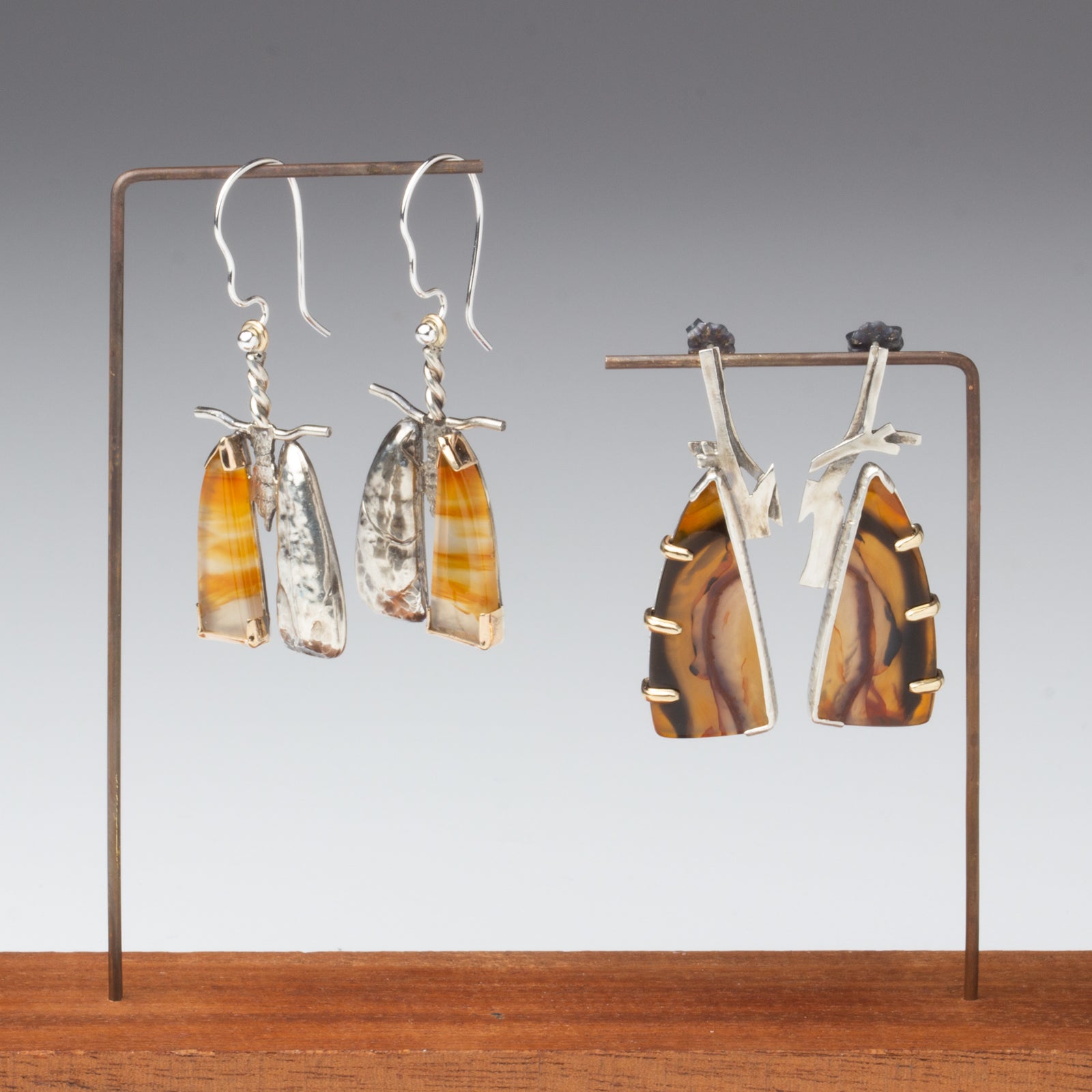 Description: In my exploration of anatomy I found inspiration in these almost vascular, book-matched Montana agates. I combined the natural veins of the stones with my anatomical knowledge and created these post earrings that, when not on the person, line up to complete a full image. With a partial fine silver bezel, solid 14k gold prongs that resemble ribs, and the aortic arch and great vessels crafted from sterling silver sheet metal, these earrings take an artistic spin on lung anatomy.
