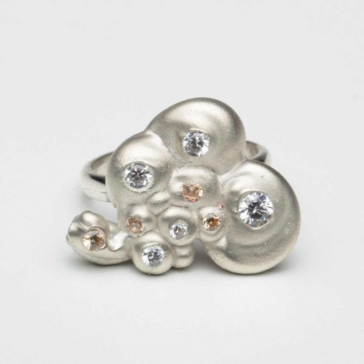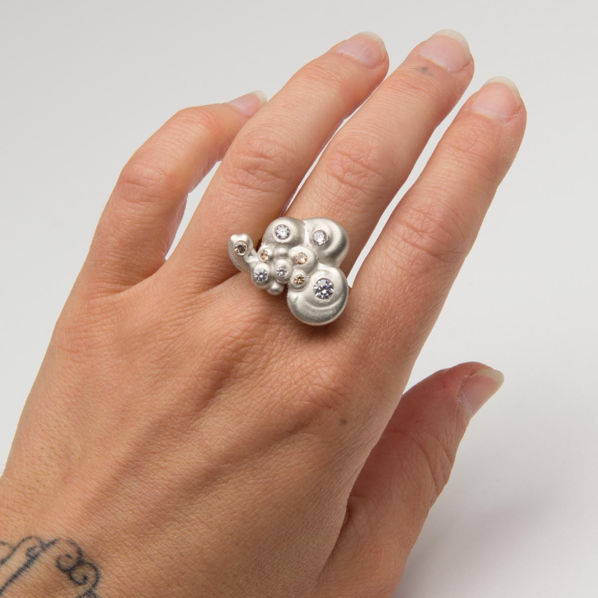 This ring is an “experiment” from a new collection using free form wax and casting the stones in place. Hot wax can form some truly beautiful shapes and casting the stones in place allows us to retain all of the original details. This ring was never intended to be sold but we felt it was so beautiful and unique that it needed to be worn and seen.