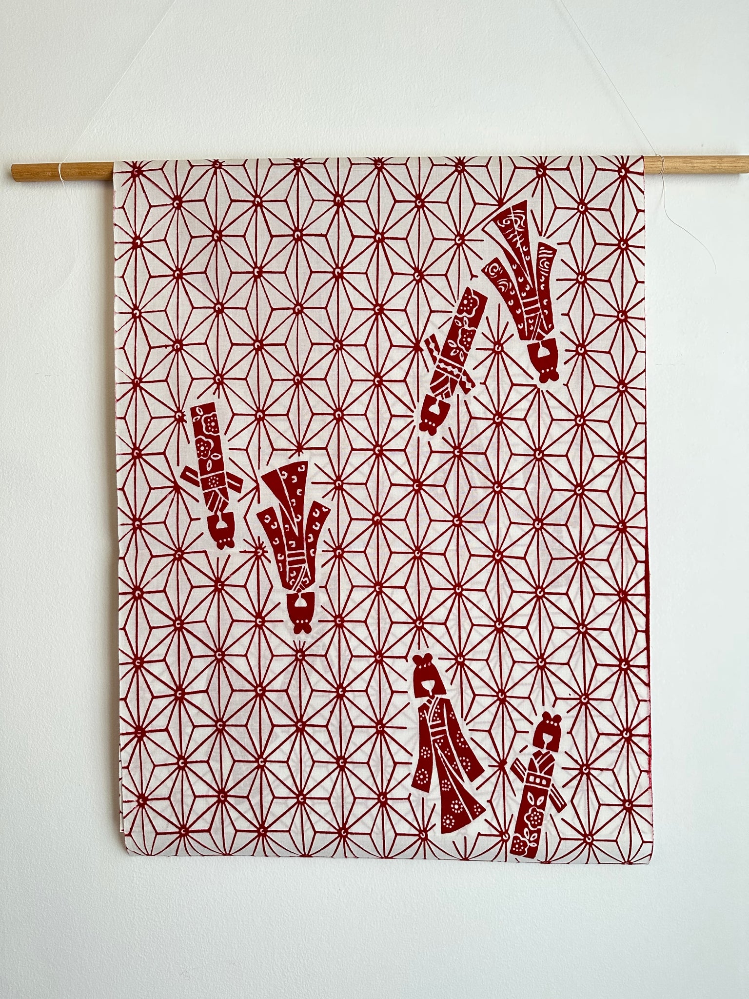 Fabric Motif: Two popular icons intersect in this pattern - kokeshi, a souvenir doll from hot springs resorts of northern Japan and hemp, a traditional fast-growing crop used for rope, textiles and more.
