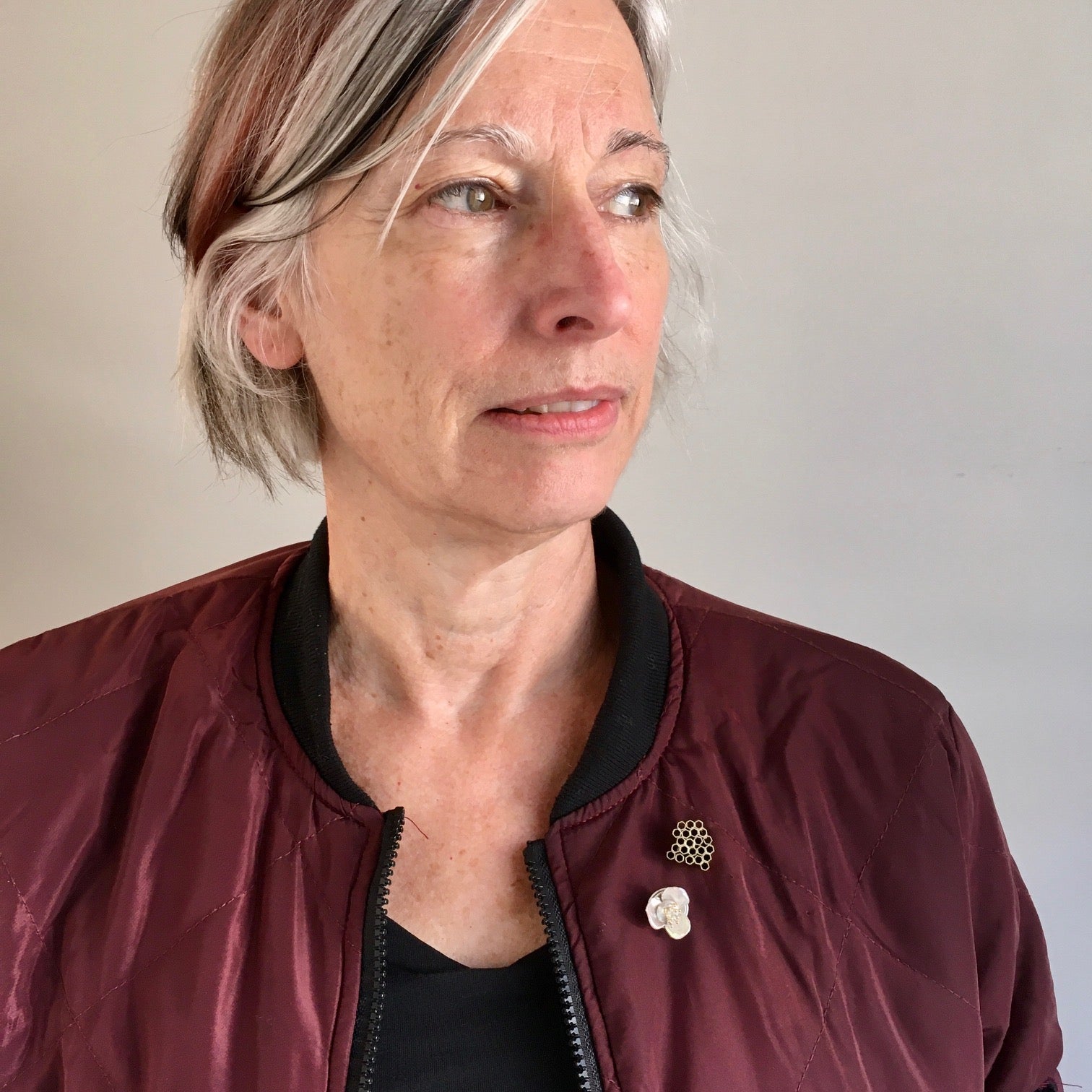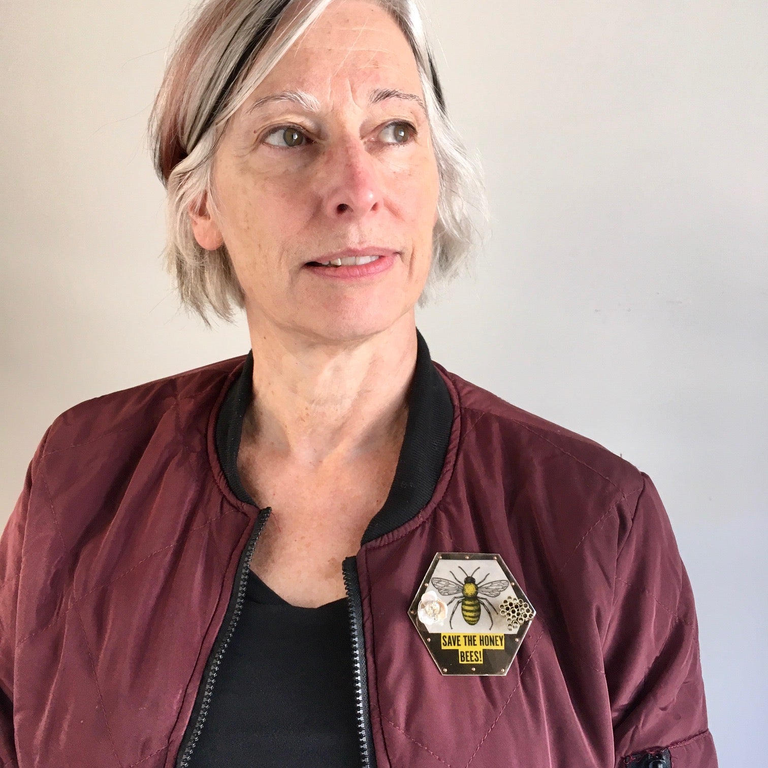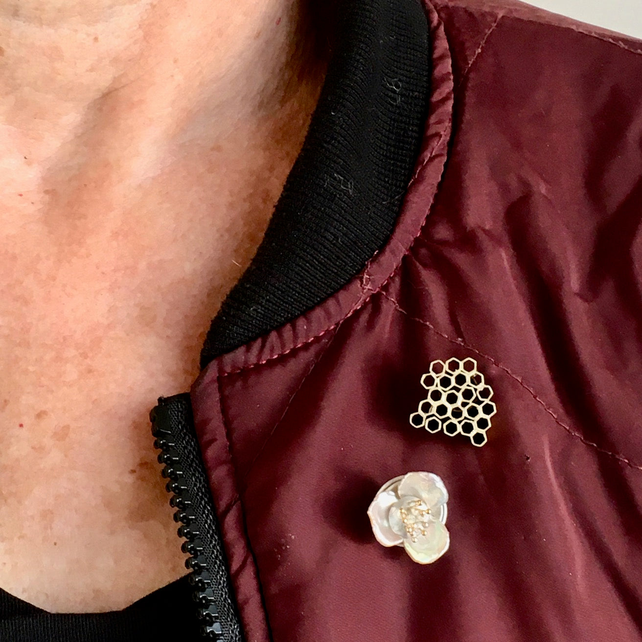 Dimensions: Save The Honey Bees 2 3/4” x 3” x 1mm, flower 3/4” x 1 1/4”, honeycomb 3/8” x 1” (does not include pin and clutch)