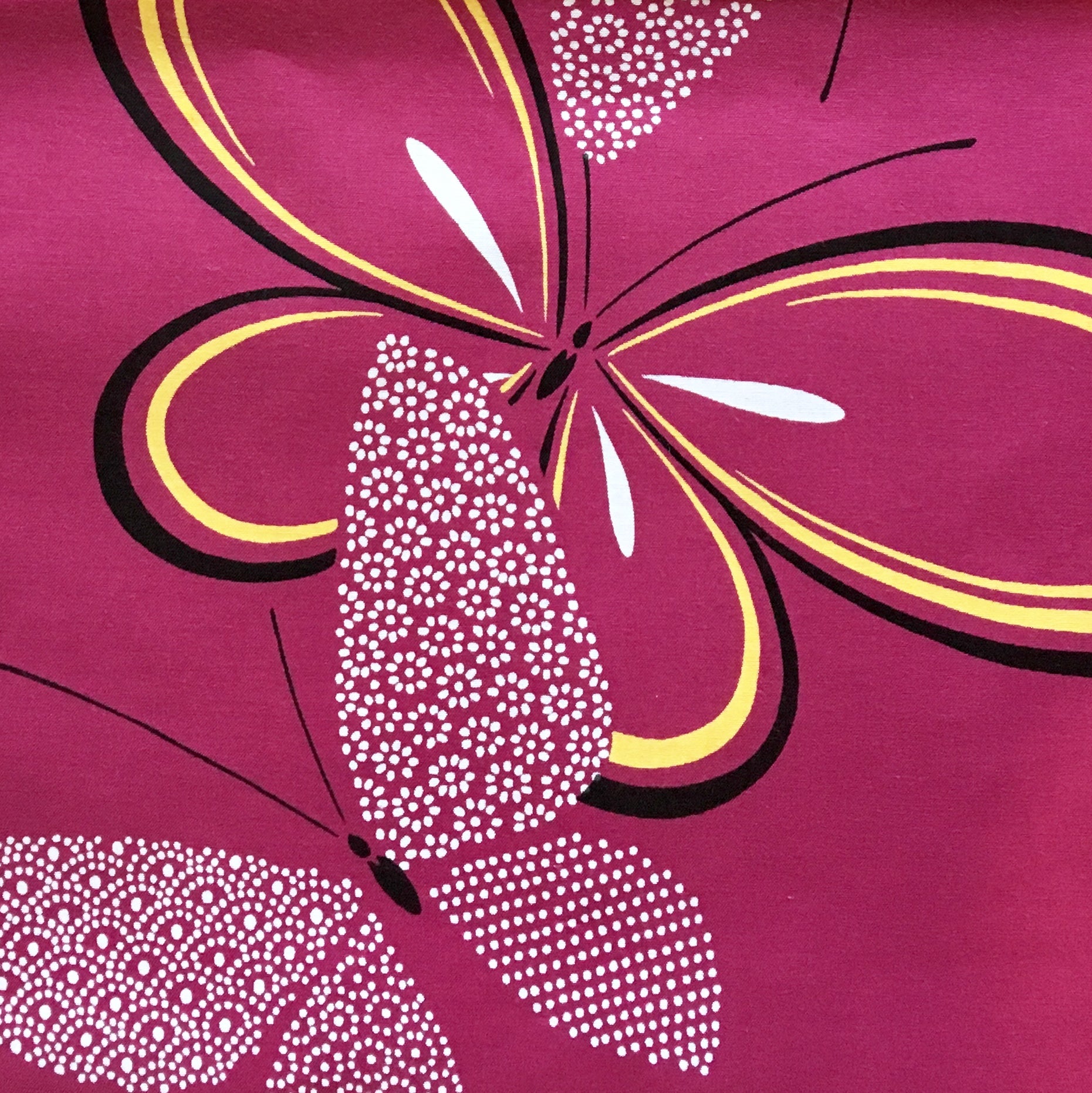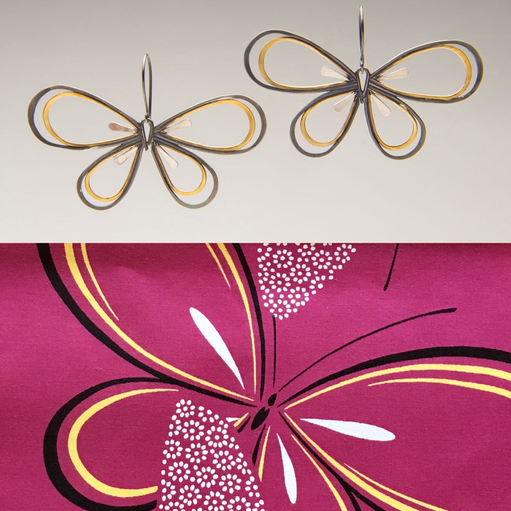 Artist Statement: When my friend Patricia Belyea of Okan Arts suggested we collaborate on a project for the gallery I was honored and I jumped at the idea. Collaboration is often an excellent opportunity to try something new and I love a good challenge. I chose my fabric mostly for the color, deep pink, a favorite color of mine. However, it is the butterfly pattern that captured my imagination and inspired the earrings you see here. When I sat down with the fabric, I saw immediately that the graceful, calligraphic and expressive lines would translate perfectly into forged wire. When I realized I could go one-step further by using mixed metals and oxidation to mimic the artwork in the fabric, well I got very excited. The first pair I made are bold (i.e. HUGE), like the butterfly on the fabric. They are perfect for the right person but not everyone, so I made another couple pair, one in the same style but smaller and one with hooks rather than hoops. As it turned out, working with the butterfly imagery provided me an unexpected sense of opening and hopefulness. Now, all I want to do is make butterflies.