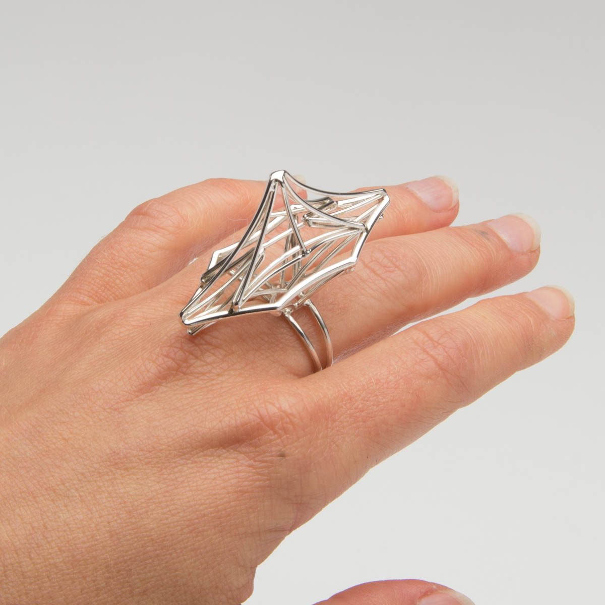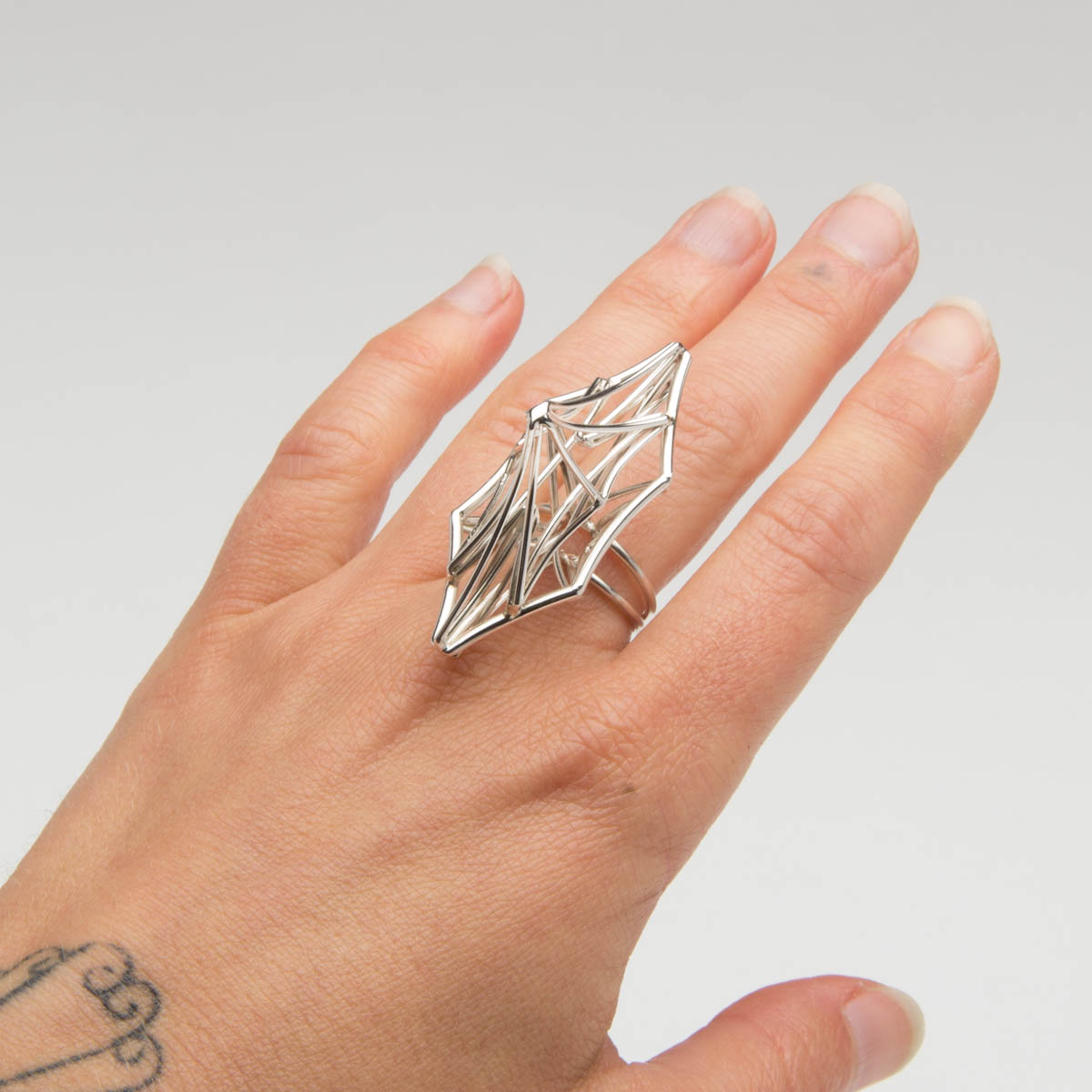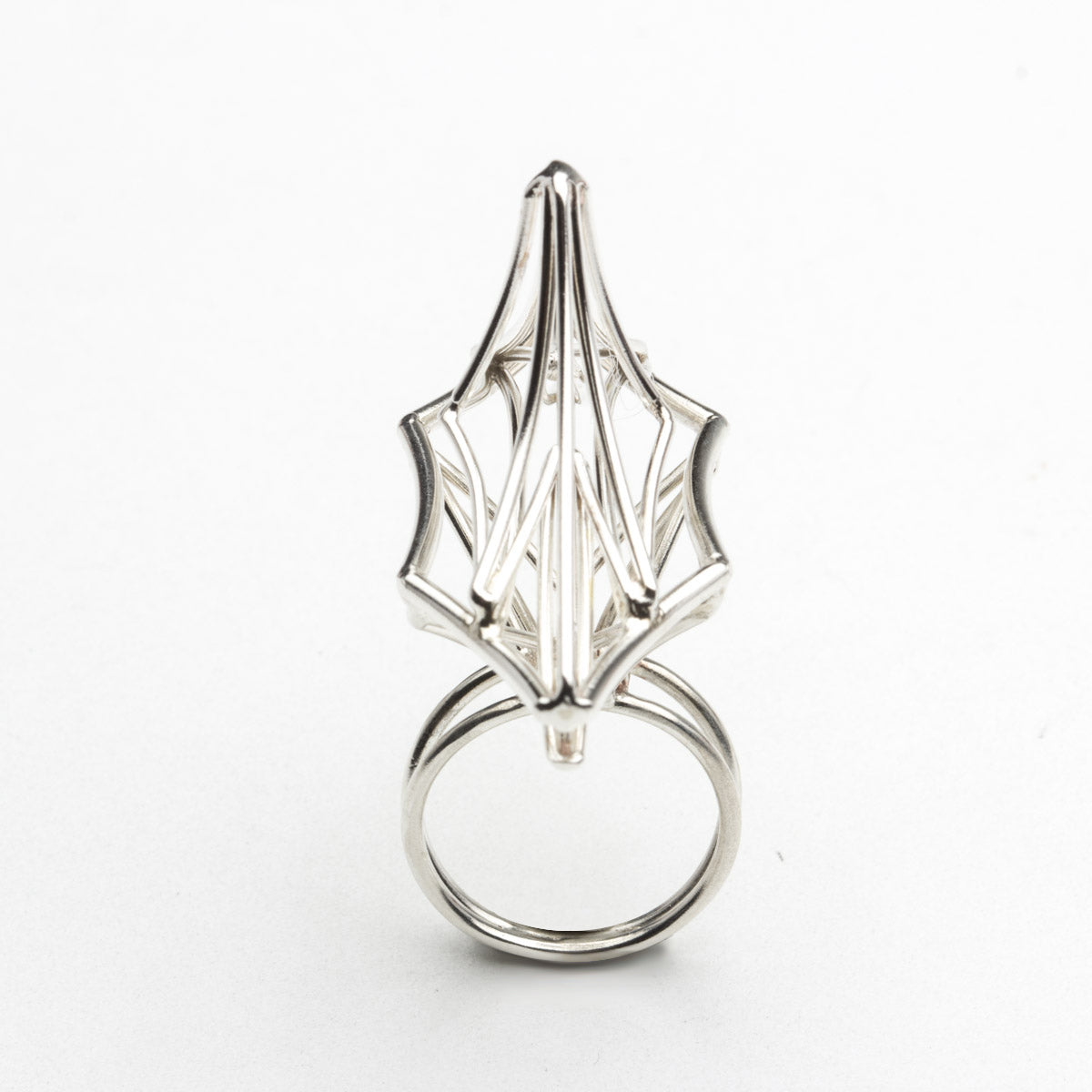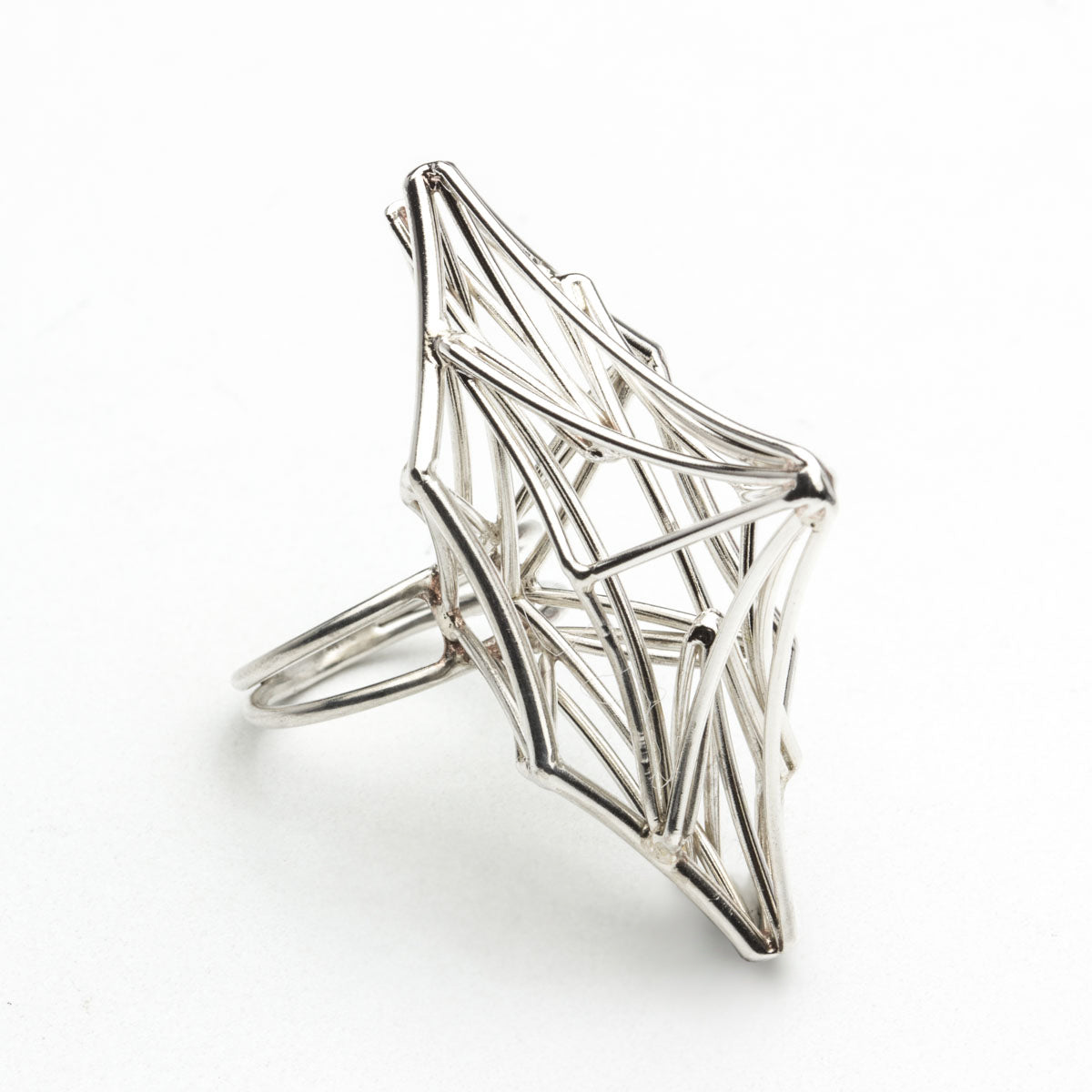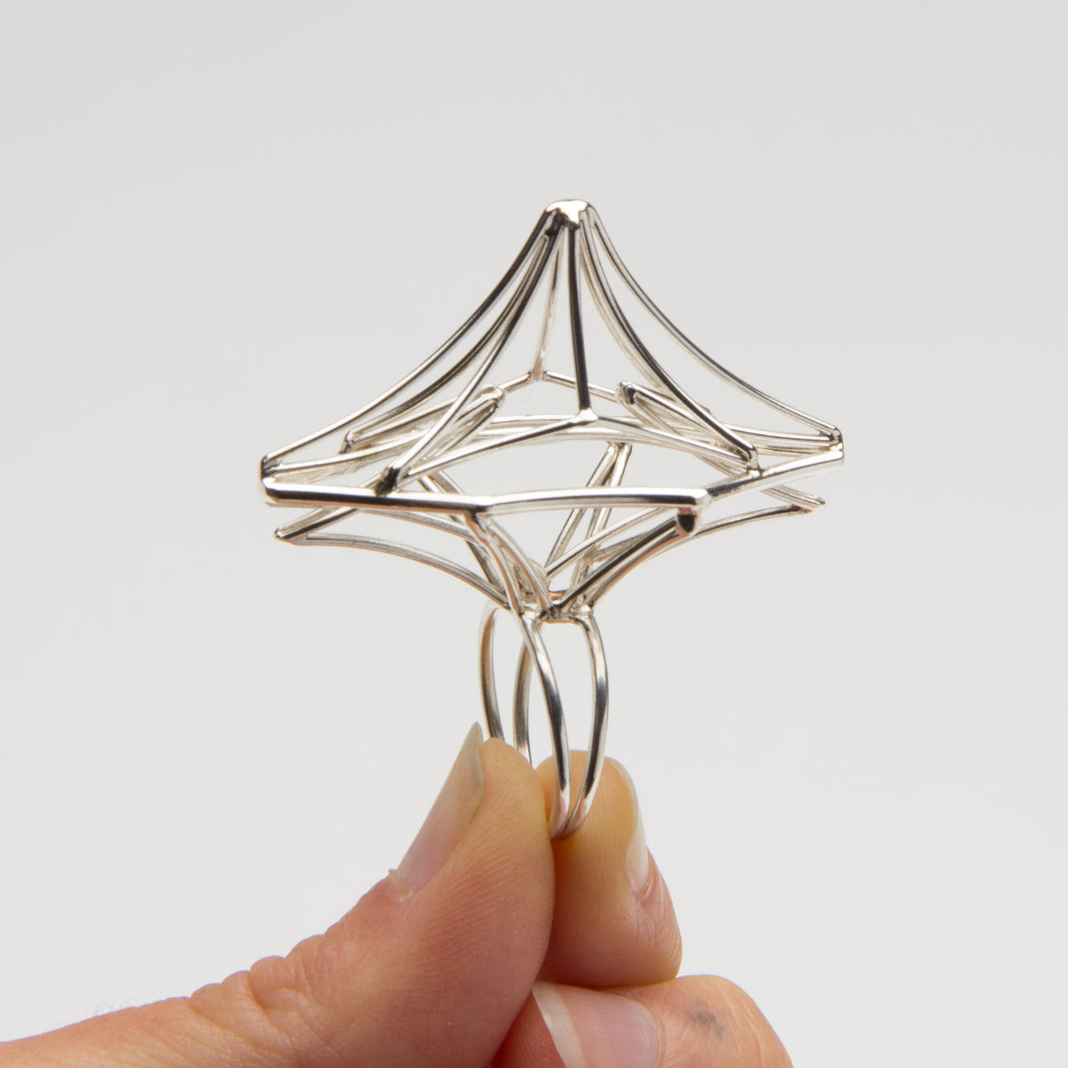 This piece is hand fabricated using traditional and non-traditional metalsmithing techniques including soldering, welding and fusing. The form is built out of wire, creating an architectural and geometric “Openwork” form resembling a three dimensional lace. These intricate and elaborate connections are a theme running through my work that began as a tribute to my grandfather after losing him to Alzheimer’s. My fascination with the human brain, it’s intricacies, synapses, connections, and beauty became a theme I’ve continued to explore, more than ten years later.