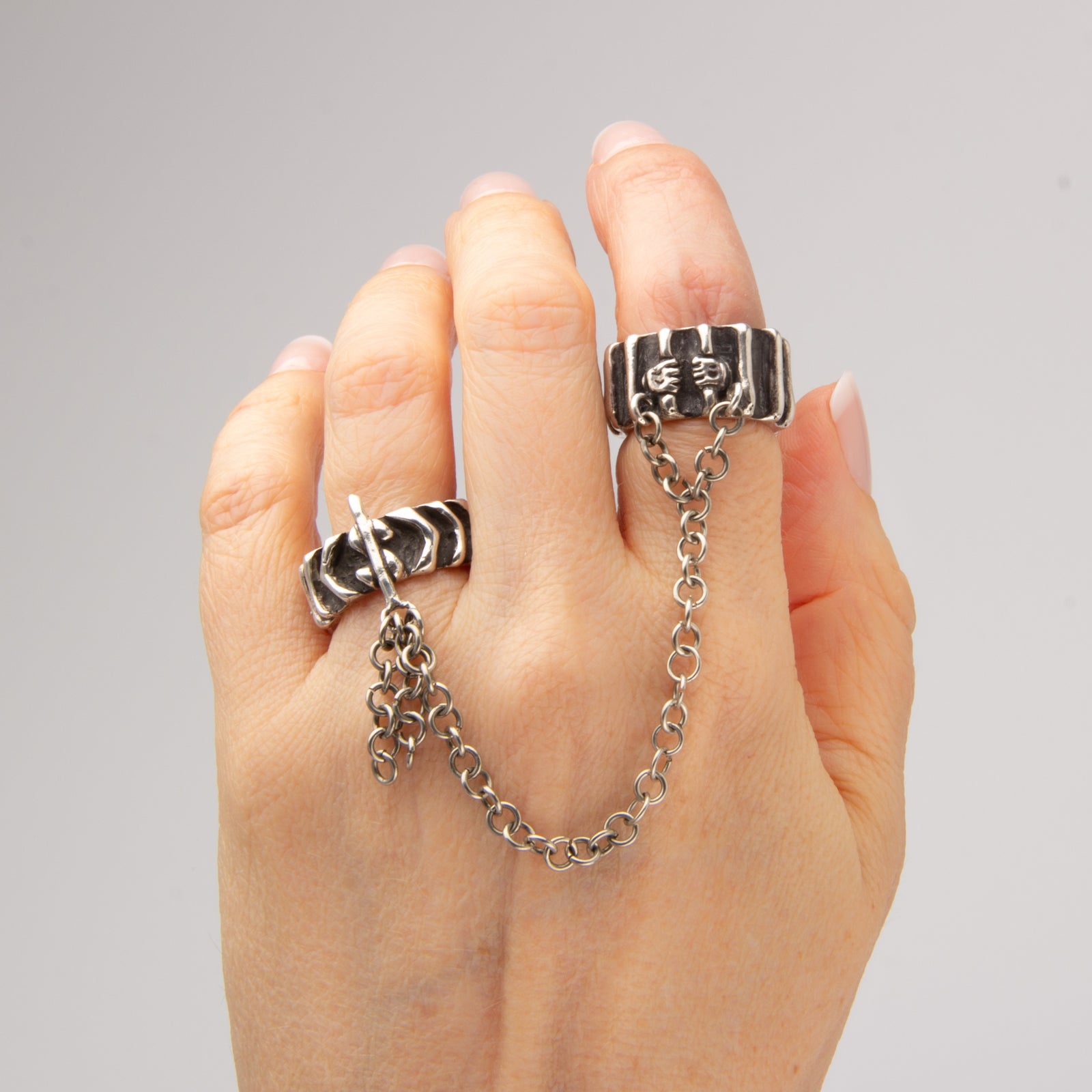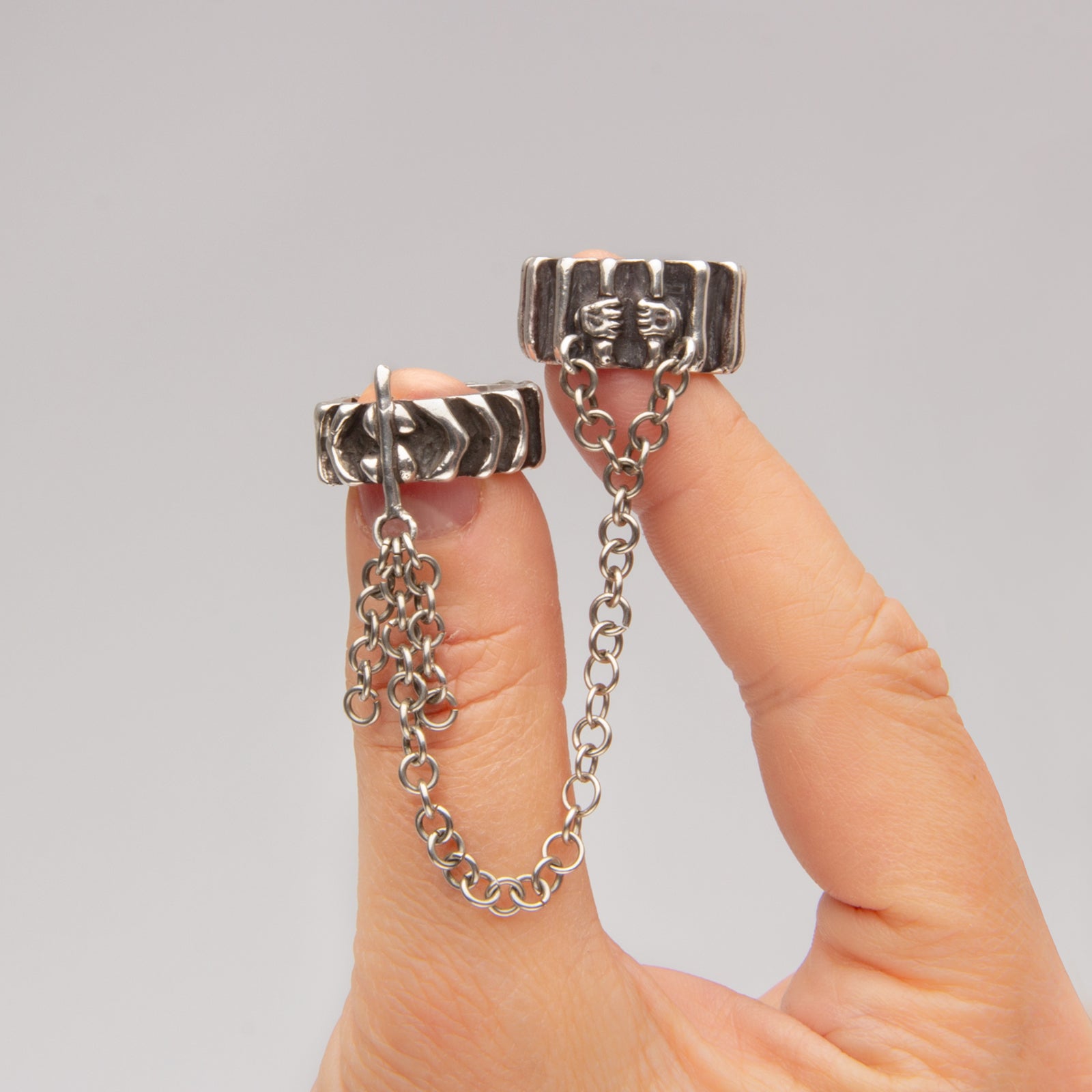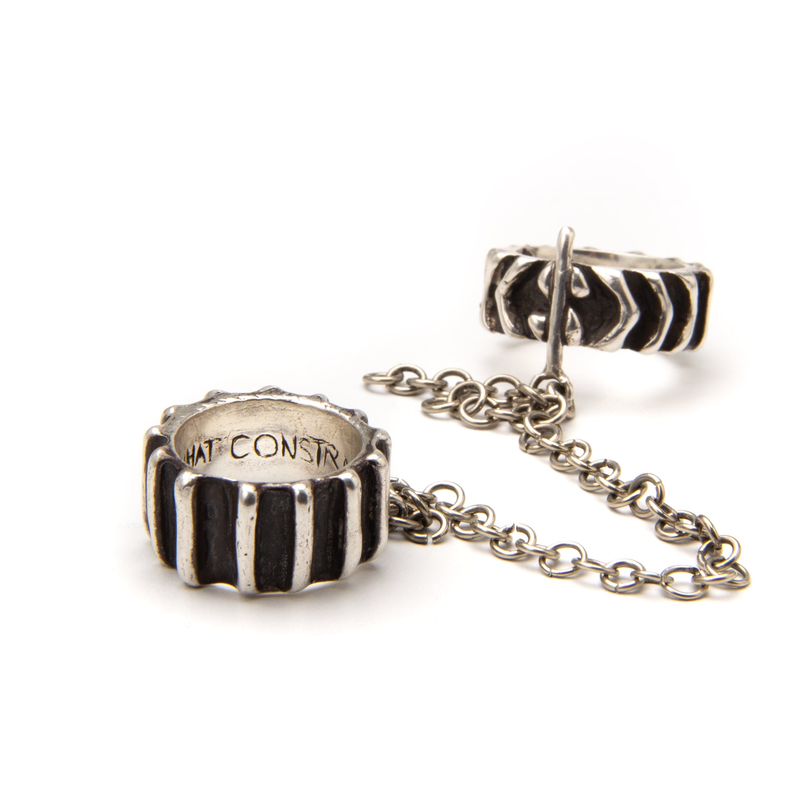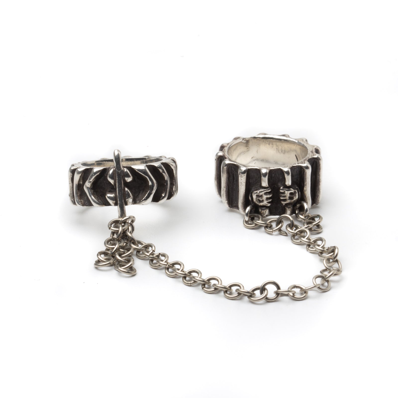 Artist Statement: This piece was made using the lost-wax casting process. I carved the rings to resemble the bars of a jail cell. I also carved the phrase “What constrains you?” on the inside of the larger ring. It was inspired by hardships a lot of us face and thinking of ways we can break those chains that constrain us. So after I carved my rings in wax, I casted the rings by melting down sterling silver. I then oxidized the rings and created a chain to connect the two rings. The chain is long enough to be worn in different orientations as shown in the images.