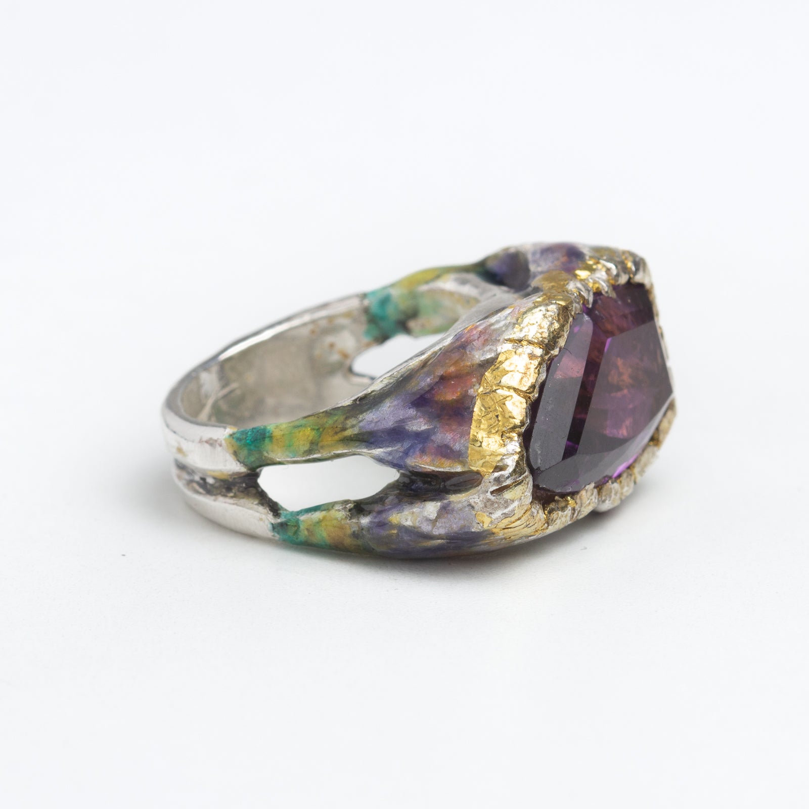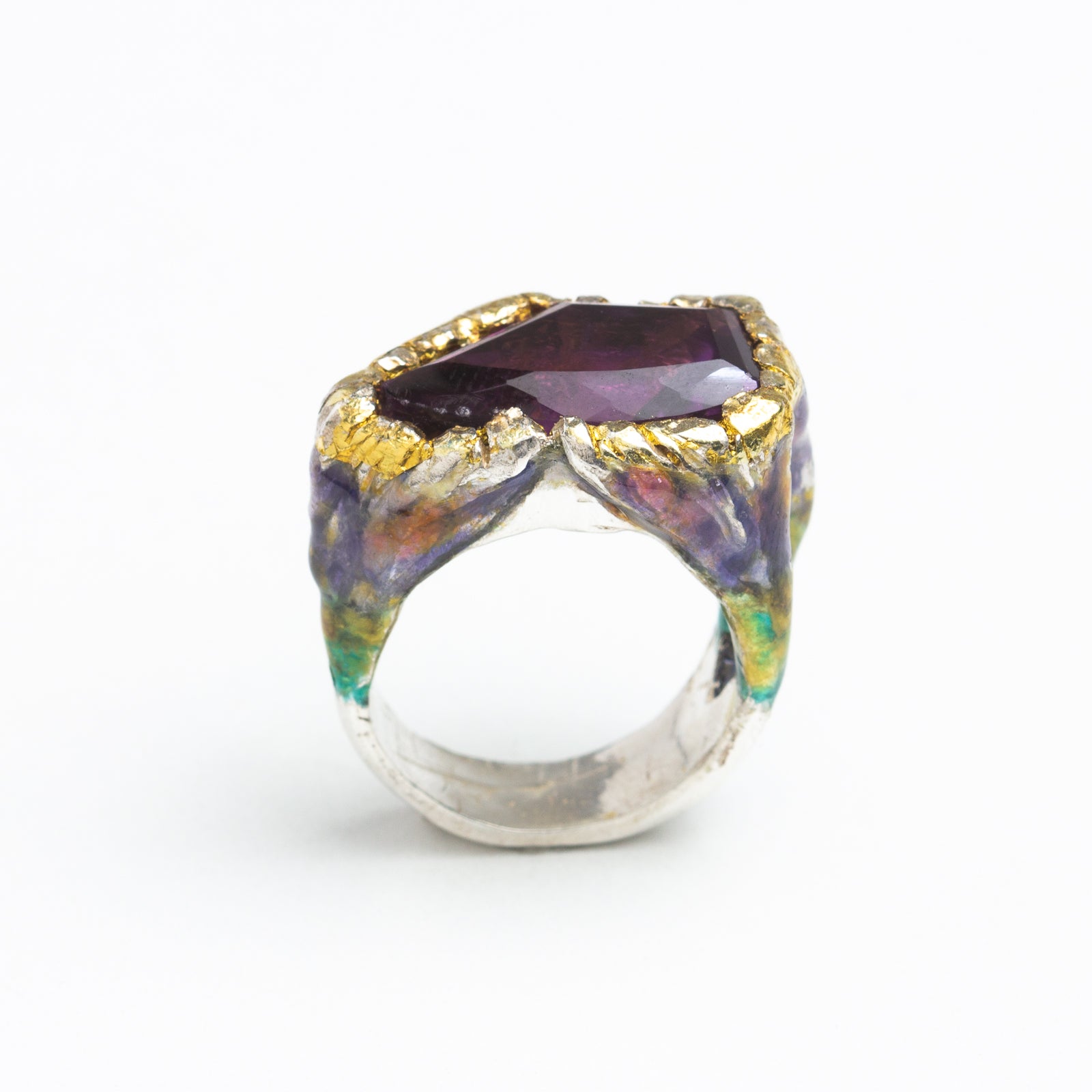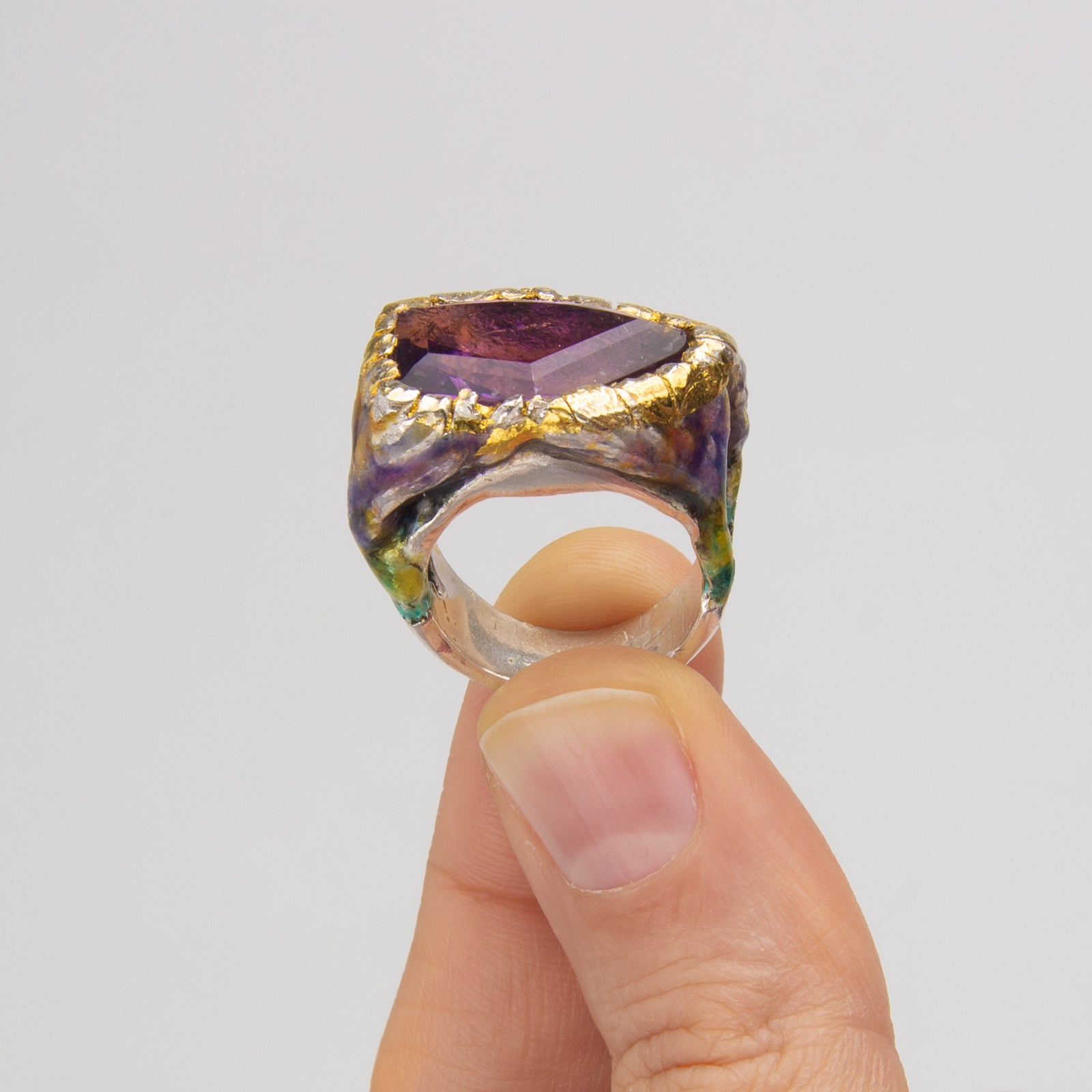 Artist Statement: This Iris flower one-of-a-kind ring is a true masterpiece for any jewelry lover. Four intricately carved Irises, each delicately enameled with translucent enamels on fine silver. A 15-carat faceted deep purple amethyst rests at the heart of the design. The blooming Irises cradle the gemstone, their graceful petals capturing the essence of nature’s wonder. Adding a touch of luxury, the prongs holding the amethyst are tipped with 24k gold using the technique of keum-boo.
