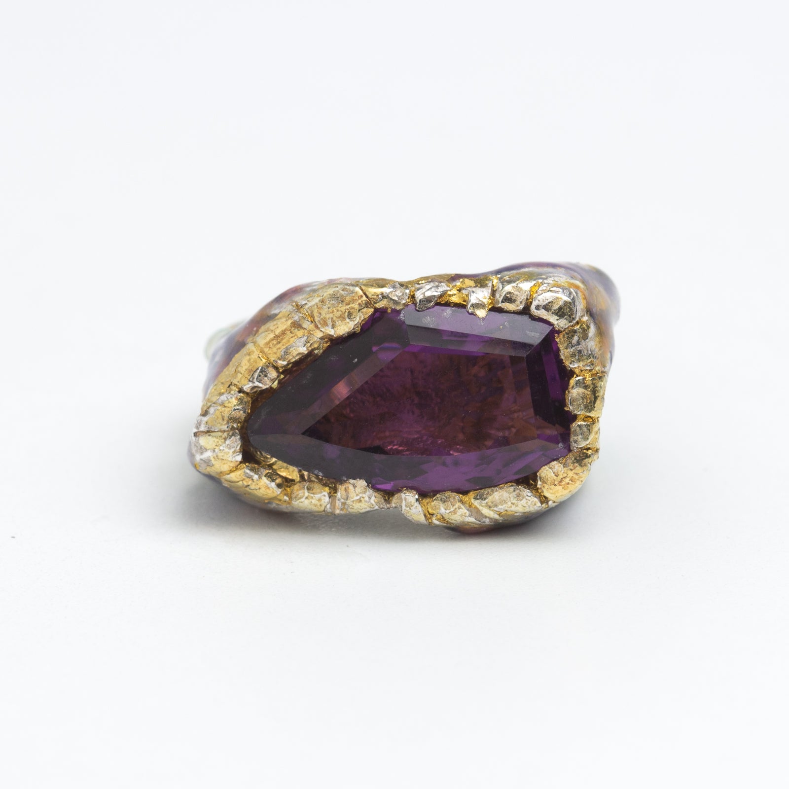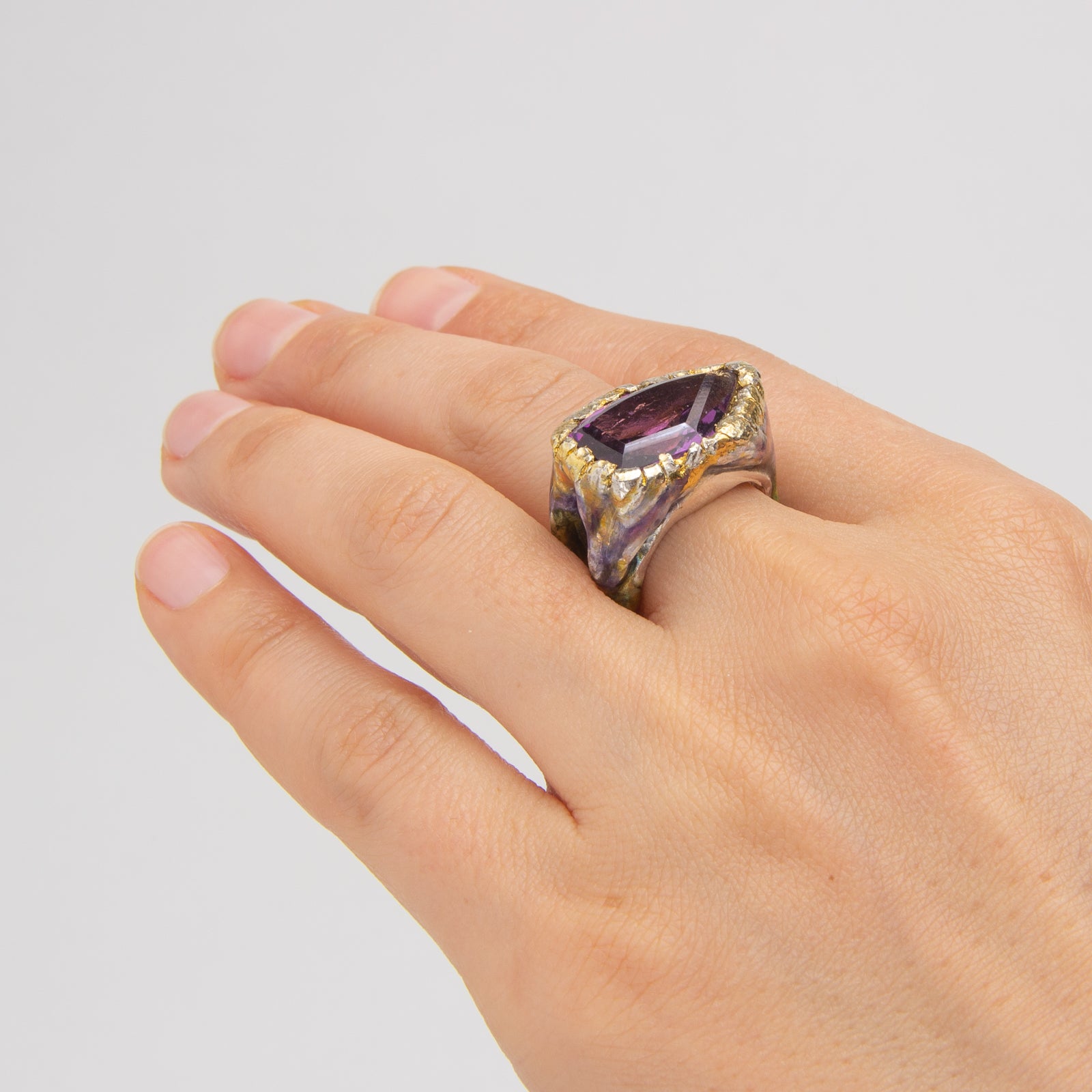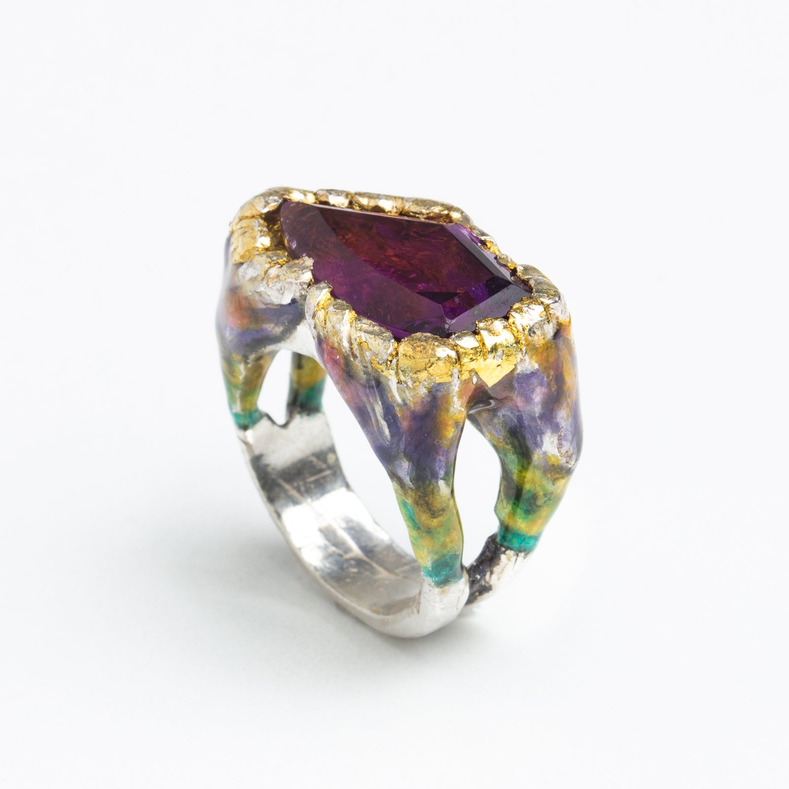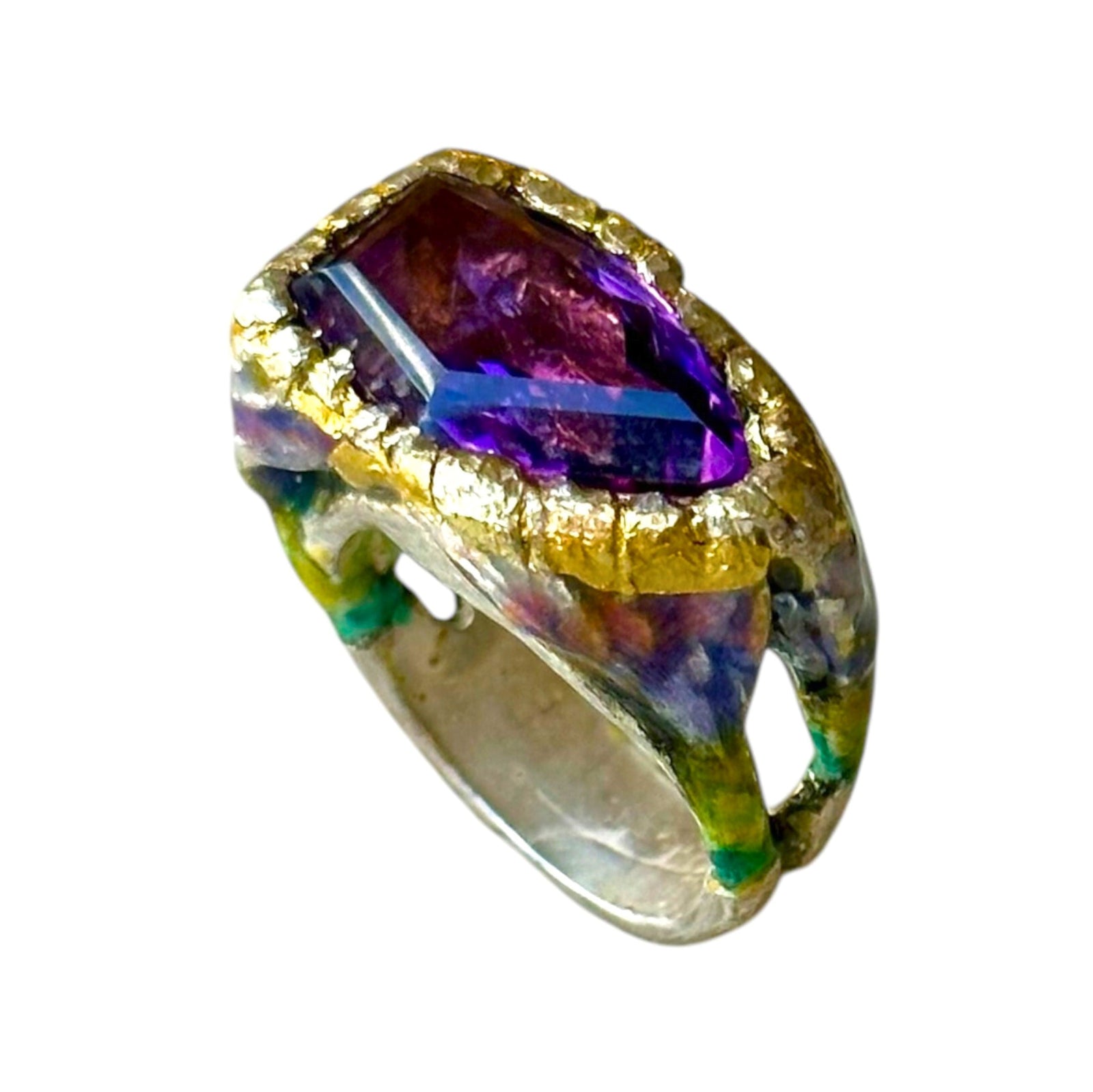 Artist Statement: This Iris flower one-of-a-kind ring is a true masterpiece for any jewelry lover. Four intricately carved Irises, each delicately enameled with translucent enamels on fine silver. A 15-carat faceted deep purple amethyst rests at the heart of the design. The blooming Irises cradle the gemstone, their graceful petals capturing the essence of nature’s wonder. Adding a touch of luxury, the prongs holding the amethyst are tipped with 24k gold using the technique of keum-boo.