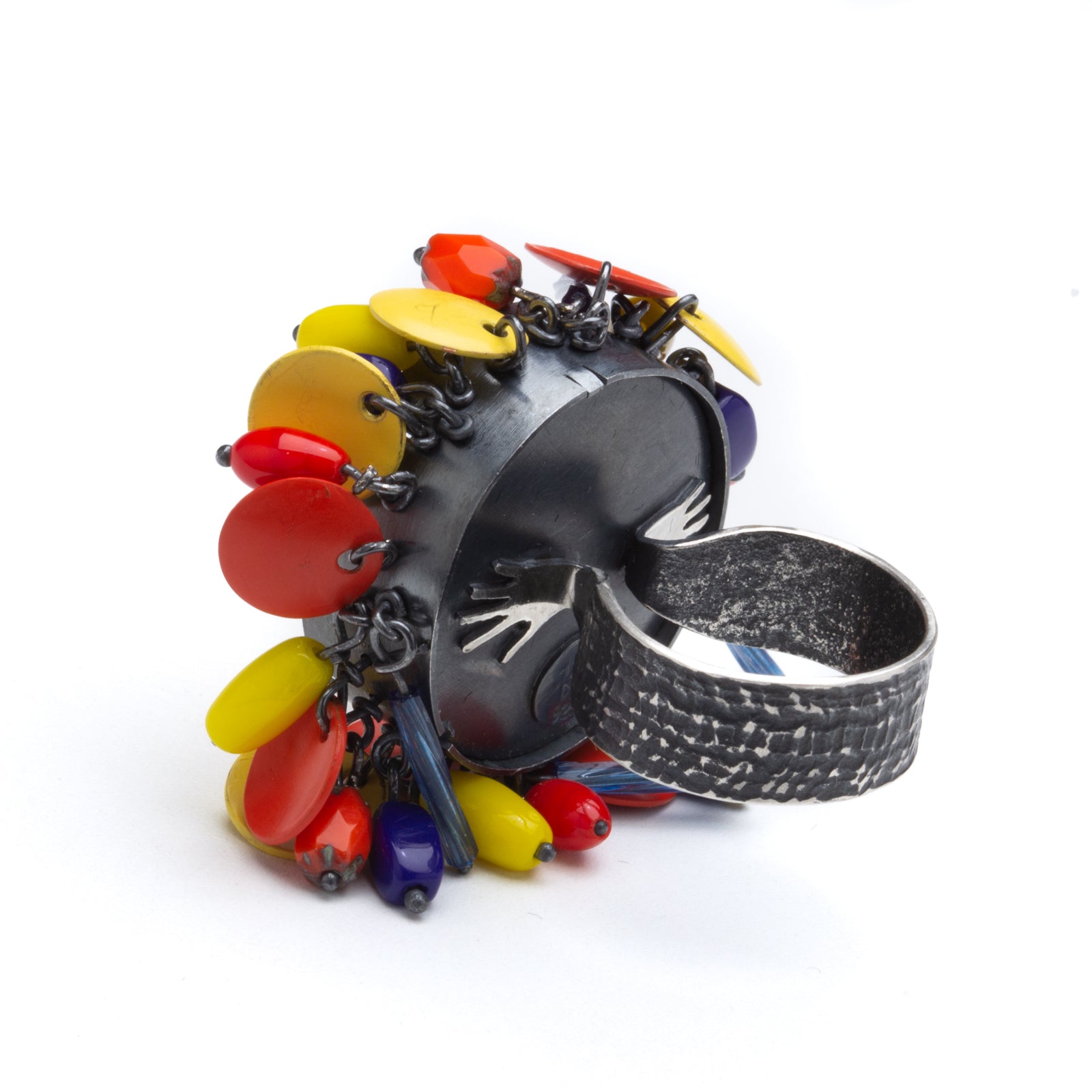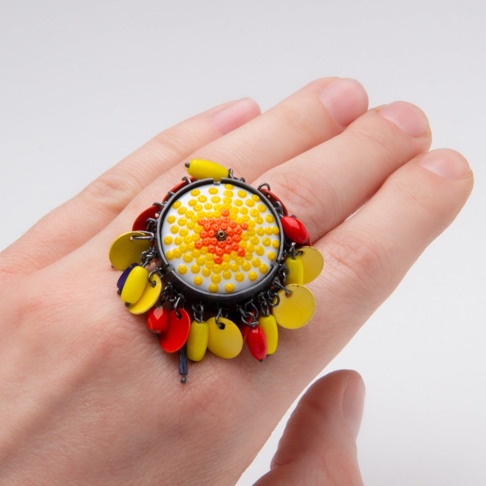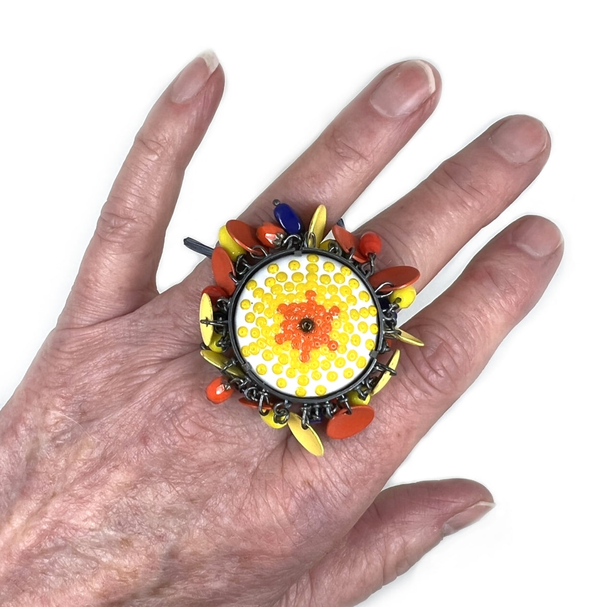 Artist Statement: The summer solstice – the longest day of the year – occurs on June 21st in the northern hemisphere. For thousands of years, cultures around the world incorporated this event in their structures, rituals and celebrations. Multiple societies erected monoliths, such as Stonehenge, to capture the first beam of light from the rising sun on this day. Sun worshipers created altars to their solar deities – Ra, Horus, Aten in Egypt; Amaterasu in Japan; Helios in Greece; Lugh, Belenos and Grannus are ancient Celtic sun gods, as well as Sulis, the sun goddess. When the Aztecs sacrificed people to Huitzilopochti, victims were placed on a sacrificial stone. The priest would cut out the heart and, while still beating, the heart would be lifted towards the sky to honor the sun god. The Sun Dance was and still is one of the most important religious ceremonies held by Great Plains Indigenous people in America and Canada. After two years of restrictions, cancelled celebrations and much divisiveness, I was inspired to create a fun and festive ring infused with bright color, movement, and sound. I want to bring back the pleasure of simple celebration void of complicated logistical planning, controversy, and social / political comment. Universally, the sun symbolizes life, energy, positivity, clarity, healing, confidence and more. The sun mosaic on my ring is held and raised up by two hands. The kinetic pieces represent the sun’s energy and when shaken, create a tinkling sound adding to the feeling of celebration and dance. All this history aside, isn’t celebrating the sun one of the joyous rites of life?! So, to honor the sun, raise your arms, shake your hands, and greet it with a smile. Another day has begun!
