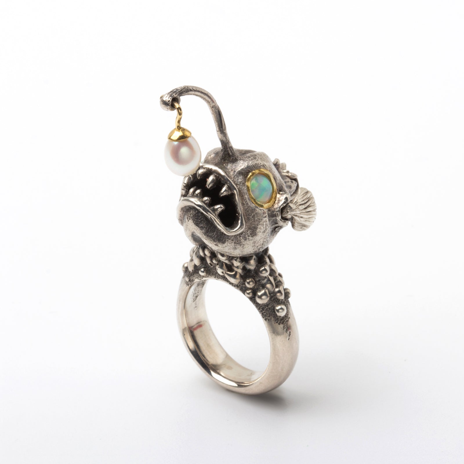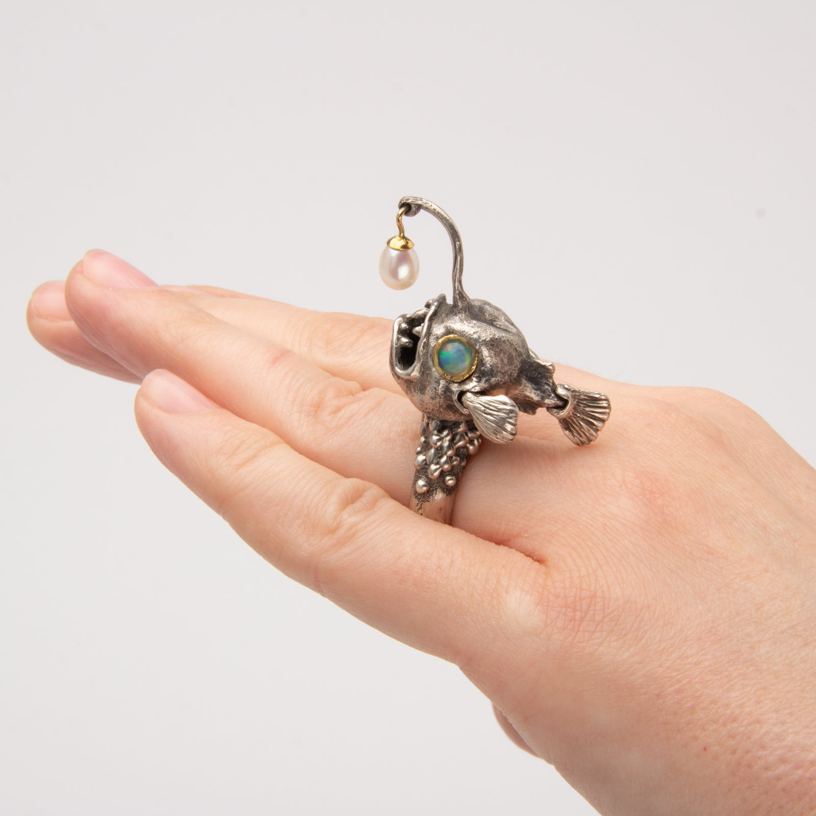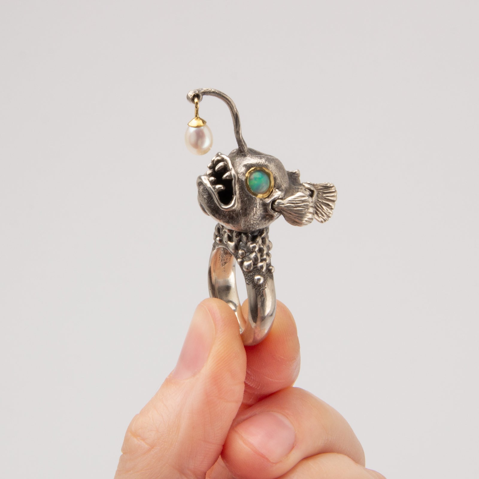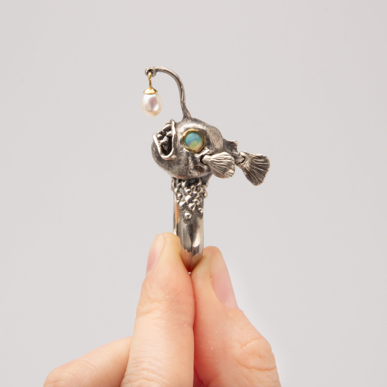 This little lady was carved in wax and cast into Sterling silver. Her Ethiopian opal eyes are set in 22KY gold and her Pearl lure is capped in 22k and 18k gold. Watch her flirt with a flick of her fins and a playful lure flip.