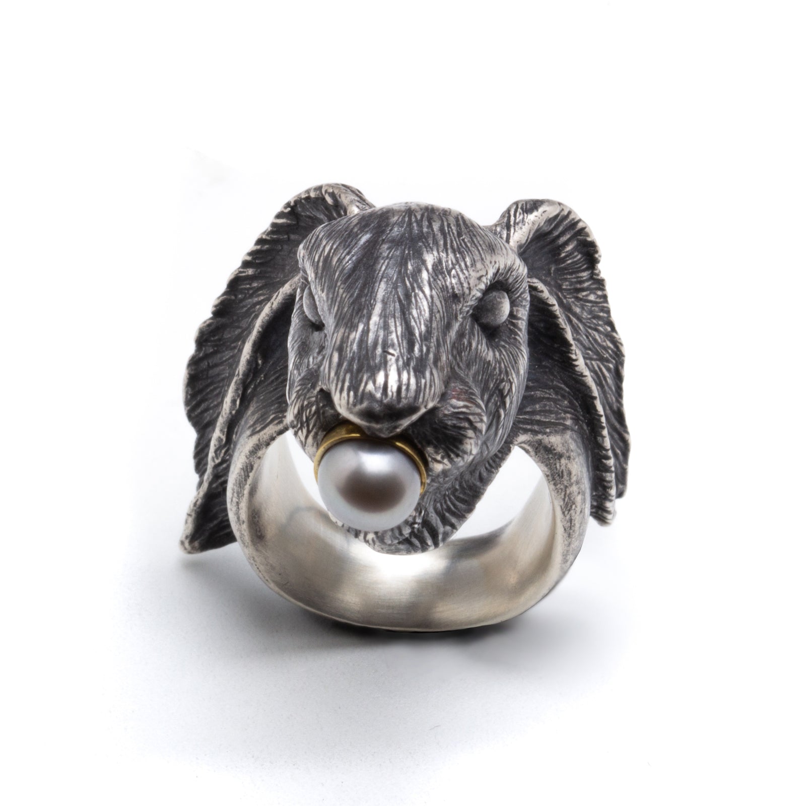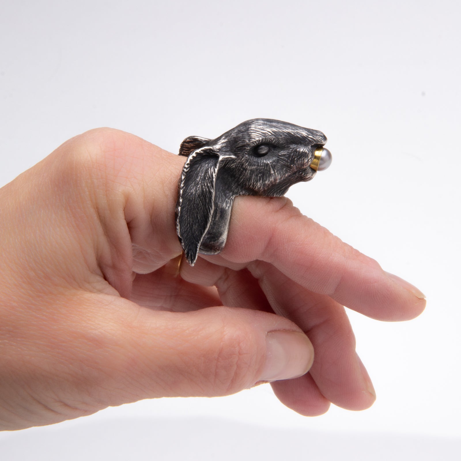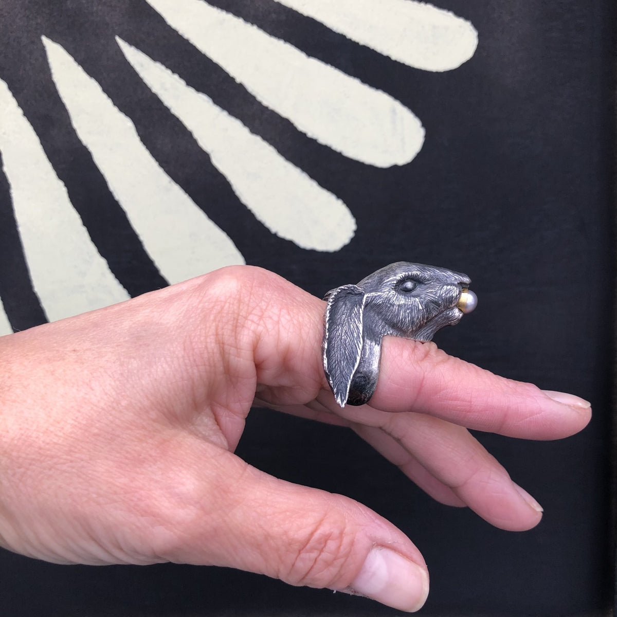Artist Statement: This hare, an animal traditionally associated with rebirth, presents to you a full moon embodied in a single round pearl nestled in a ringlet of 22k gold. It’s a tribute to remind you to celebrate the new beginnings that cross our path, cherish the beauty it presents and value the preciousness of a fresh perspective. Maybe you find your rebirth in a new job, maybe it’s a new love or possibly, it’s simply the new season. However it presents itself, may you remember to see the beauty of a new beginning and cherish the opportunity. Cheers to fresh starts!