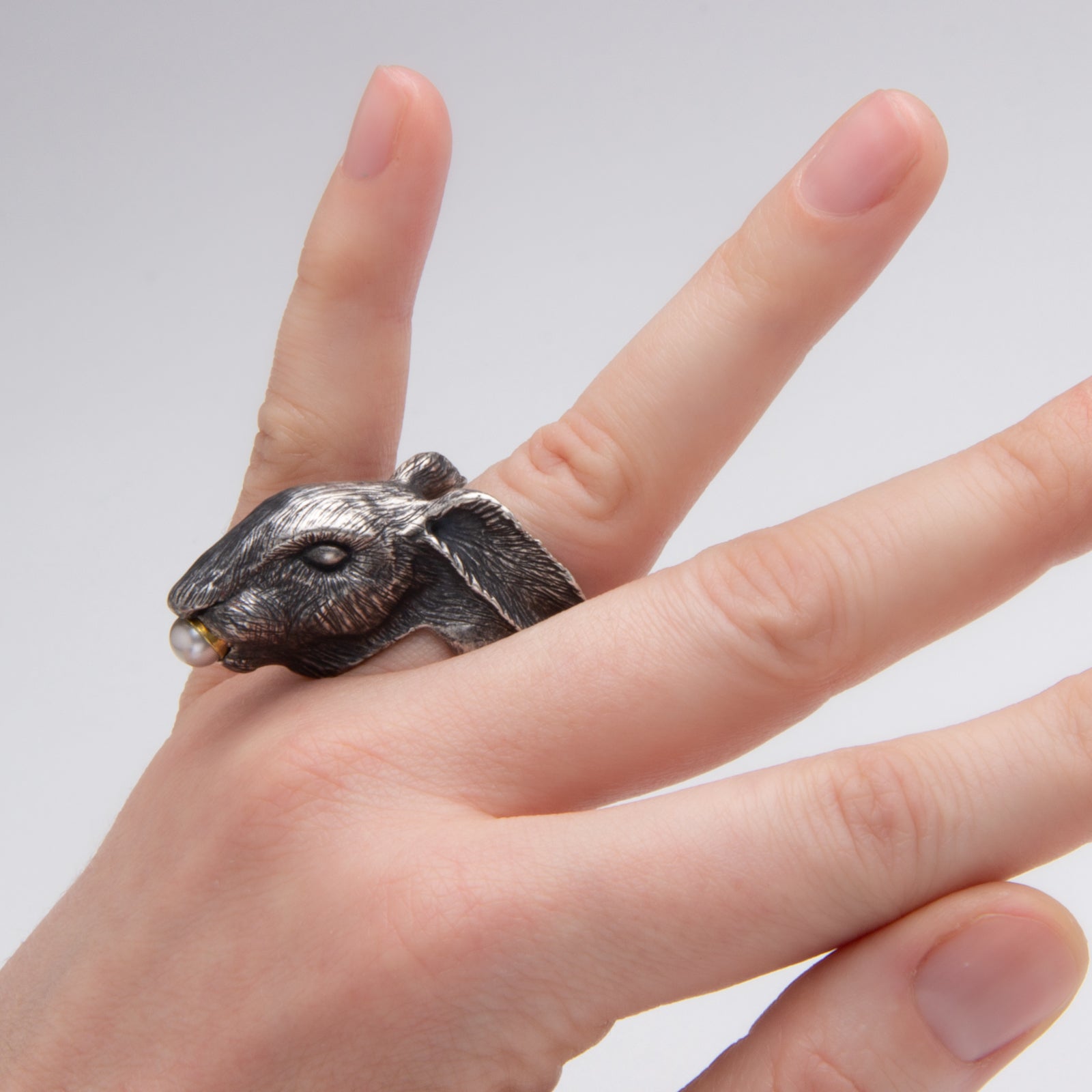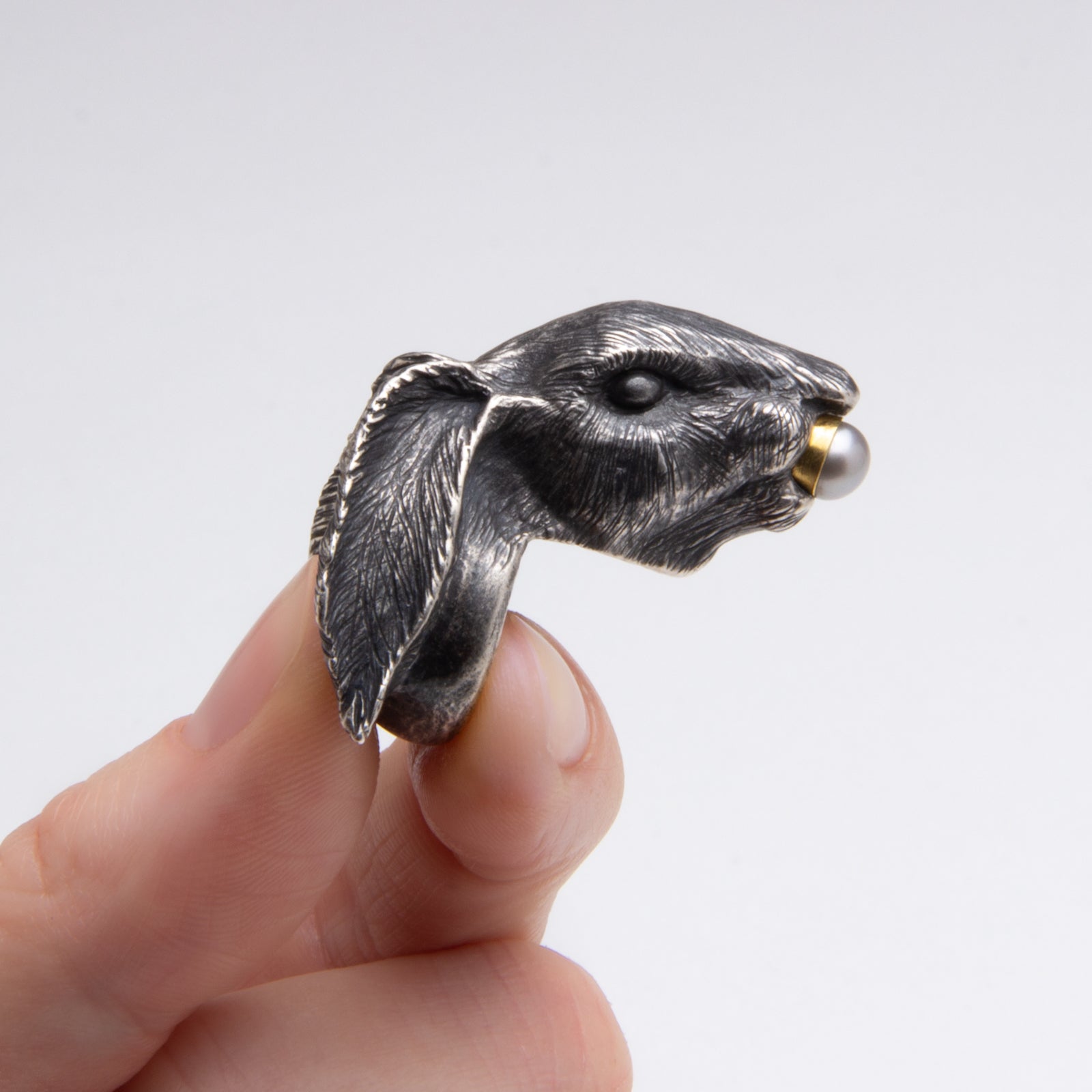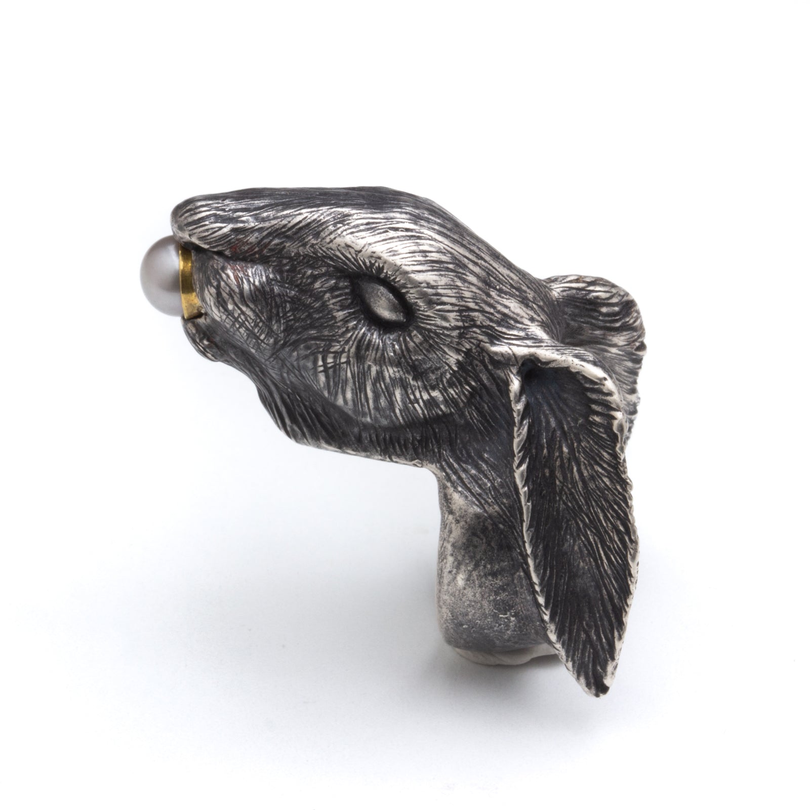 Artist Statement: This hare, an animal traditionally associated with rebirth, presents to you a full moon embodied in a single round pearl nestled in a ringlet of 22k gold. It’s a tribute to remind you to celebrate the new beginnings that cross our path, cherish the beauty it presents and value the preciousness of a fresh perspective. Maybe you find your rebirth in a new job, maybe it’s a new love or possibly, it’s simply the new season. However it presents itself, may you remember to see the beauty of a new beginning and cherish the opportunity. Cheers to fresh starts!